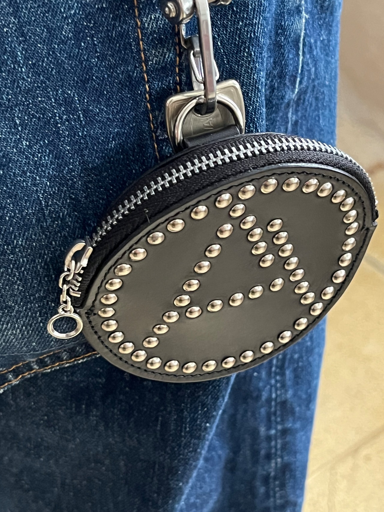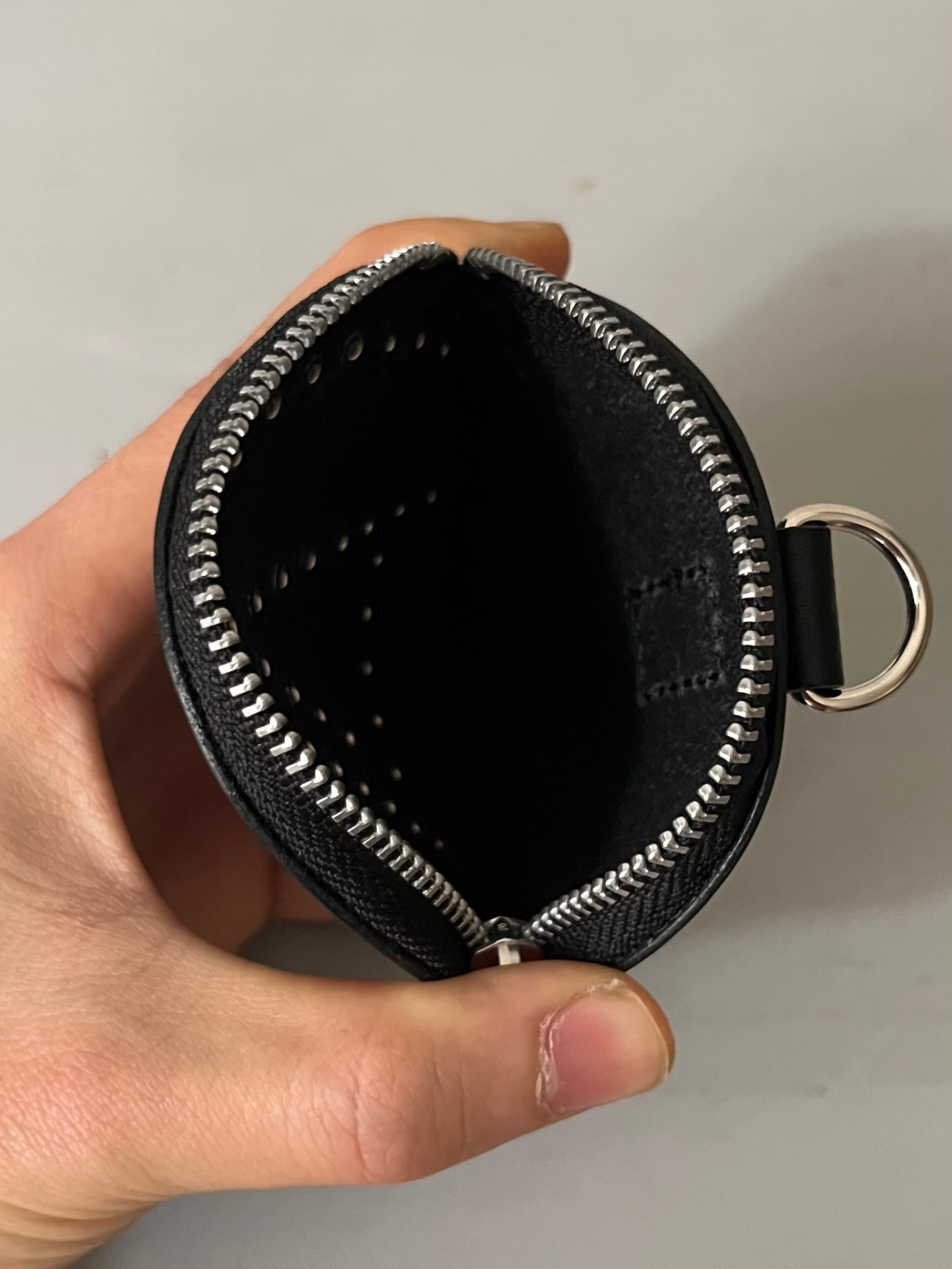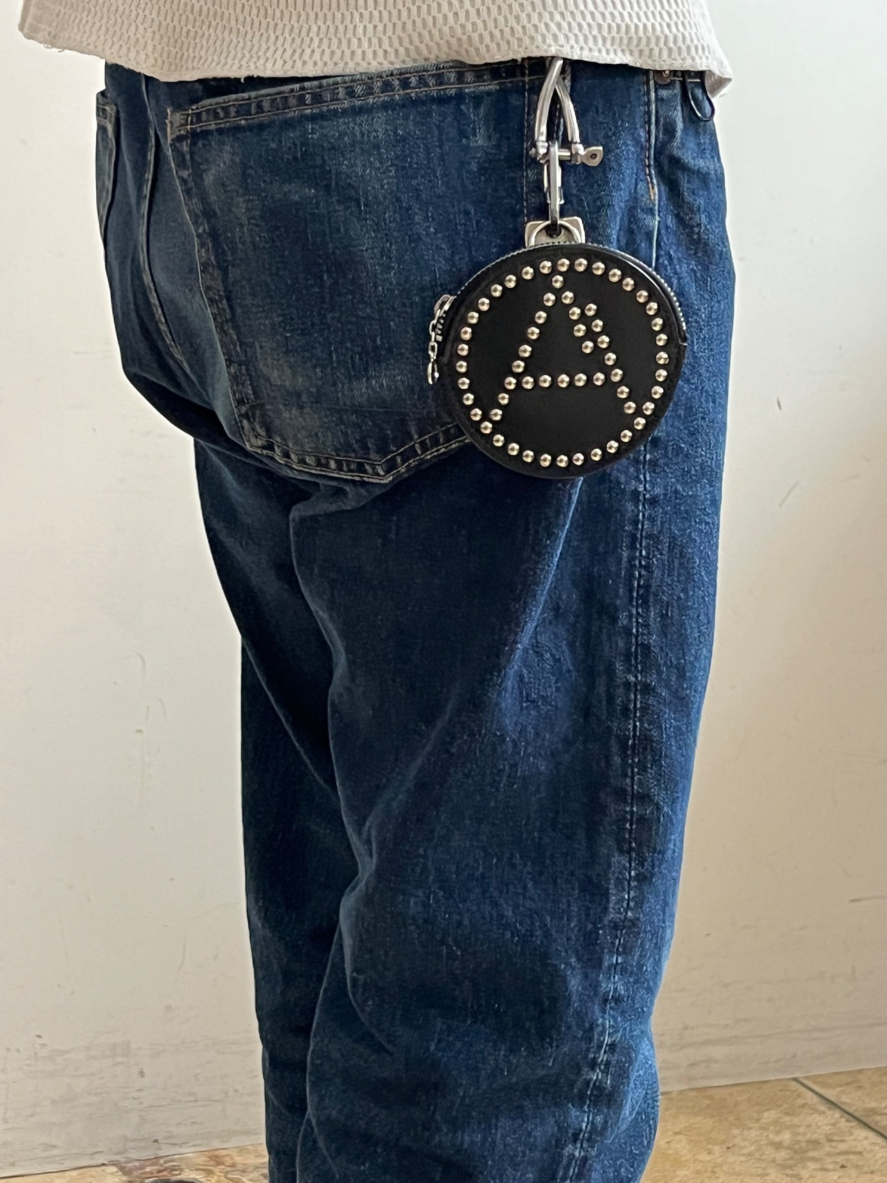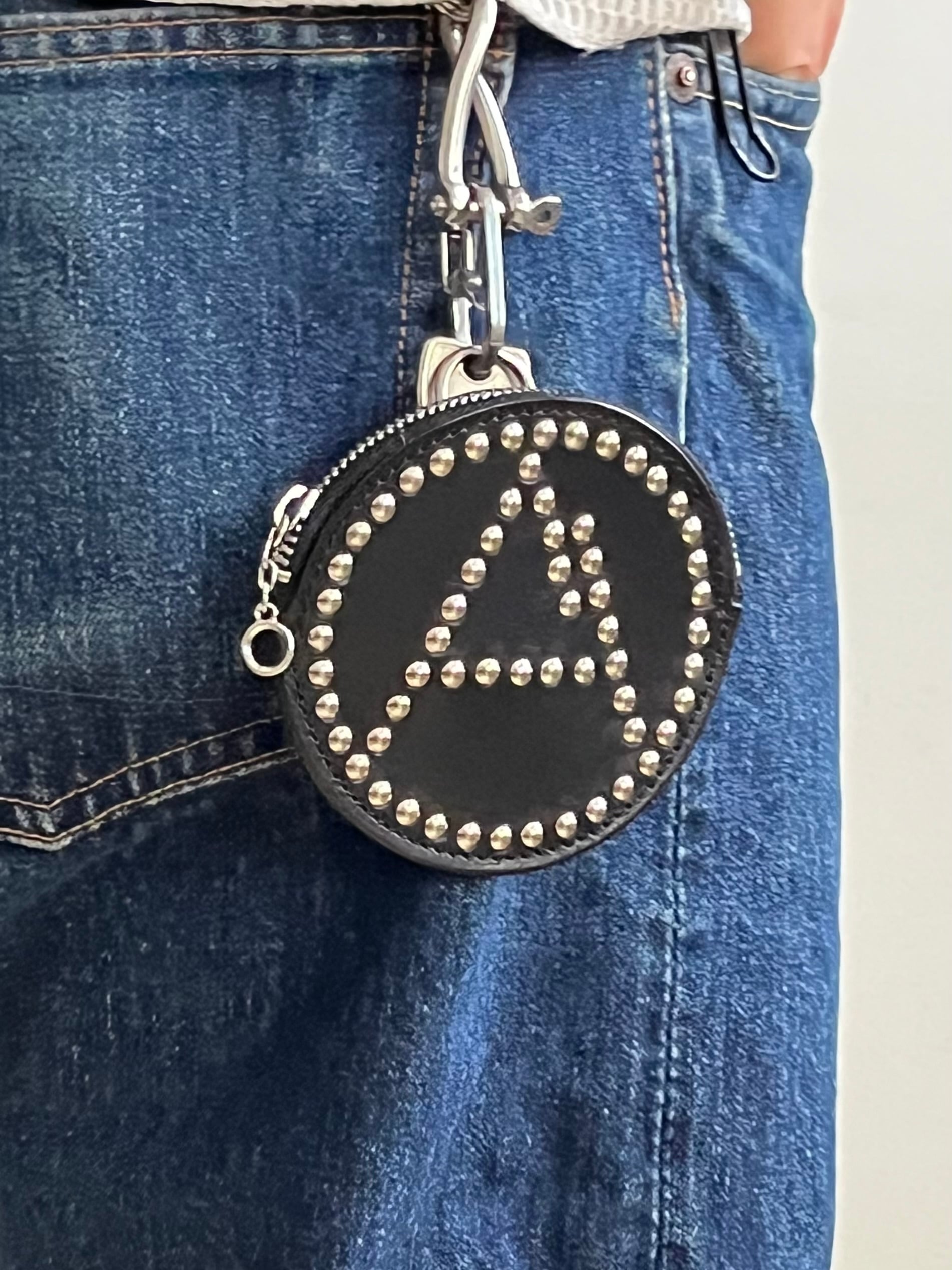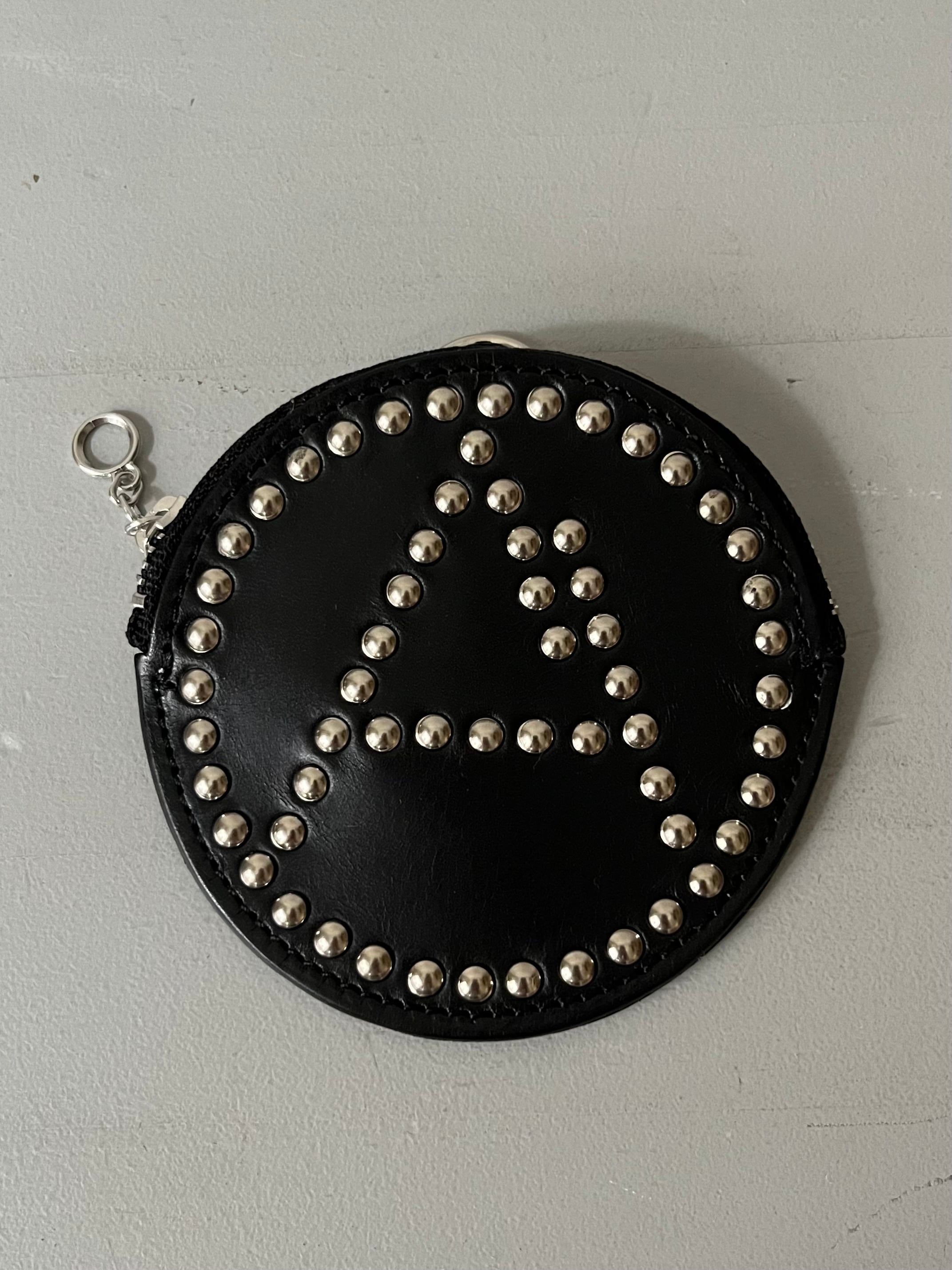 ブランドより定期的にリリースされるリベットシリーズ、今シーズンではブランドアイコンの一つ山を模した「A」マークをリベットで表した丸形レザーポーチ。後ろ面にはDカンがついておりぶら下げての装着も可能。