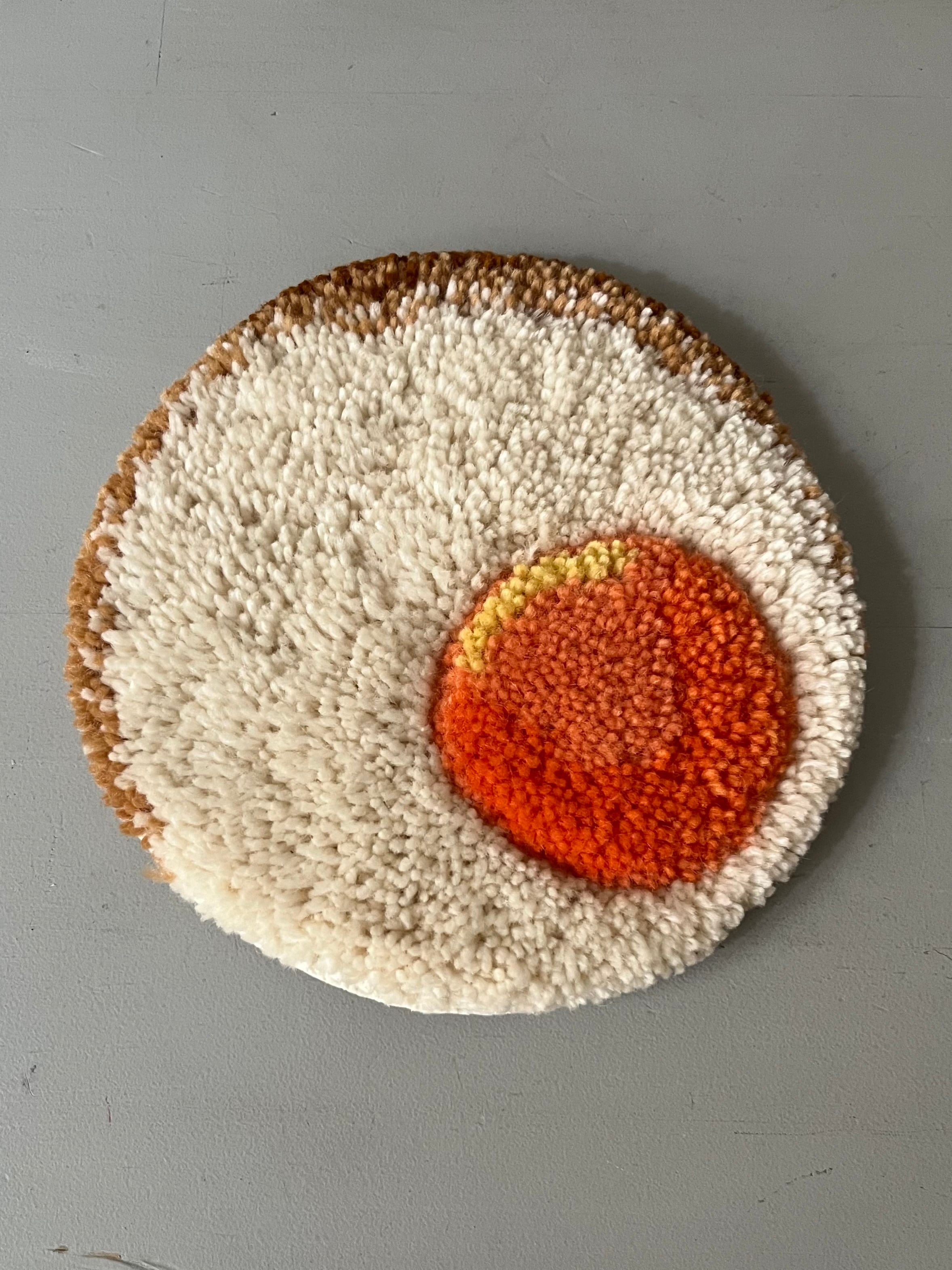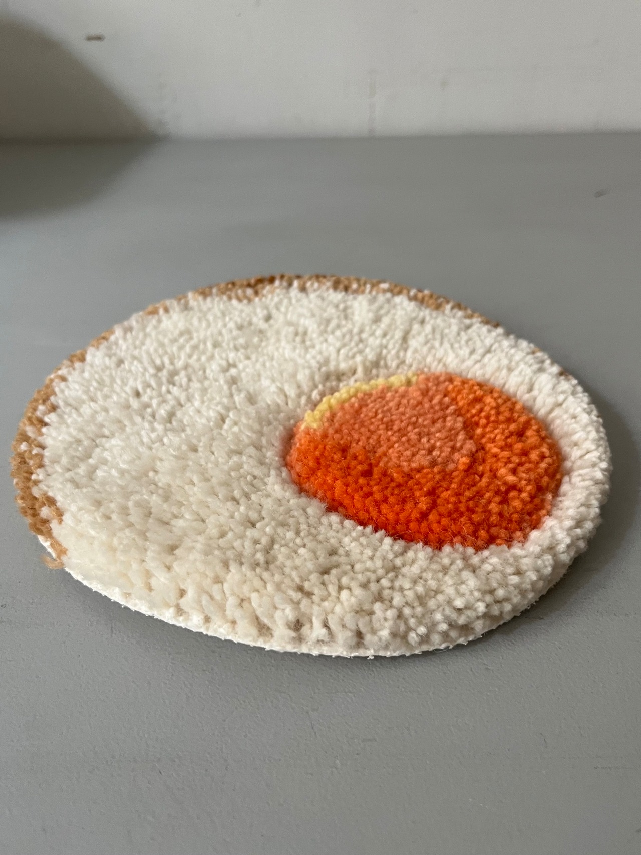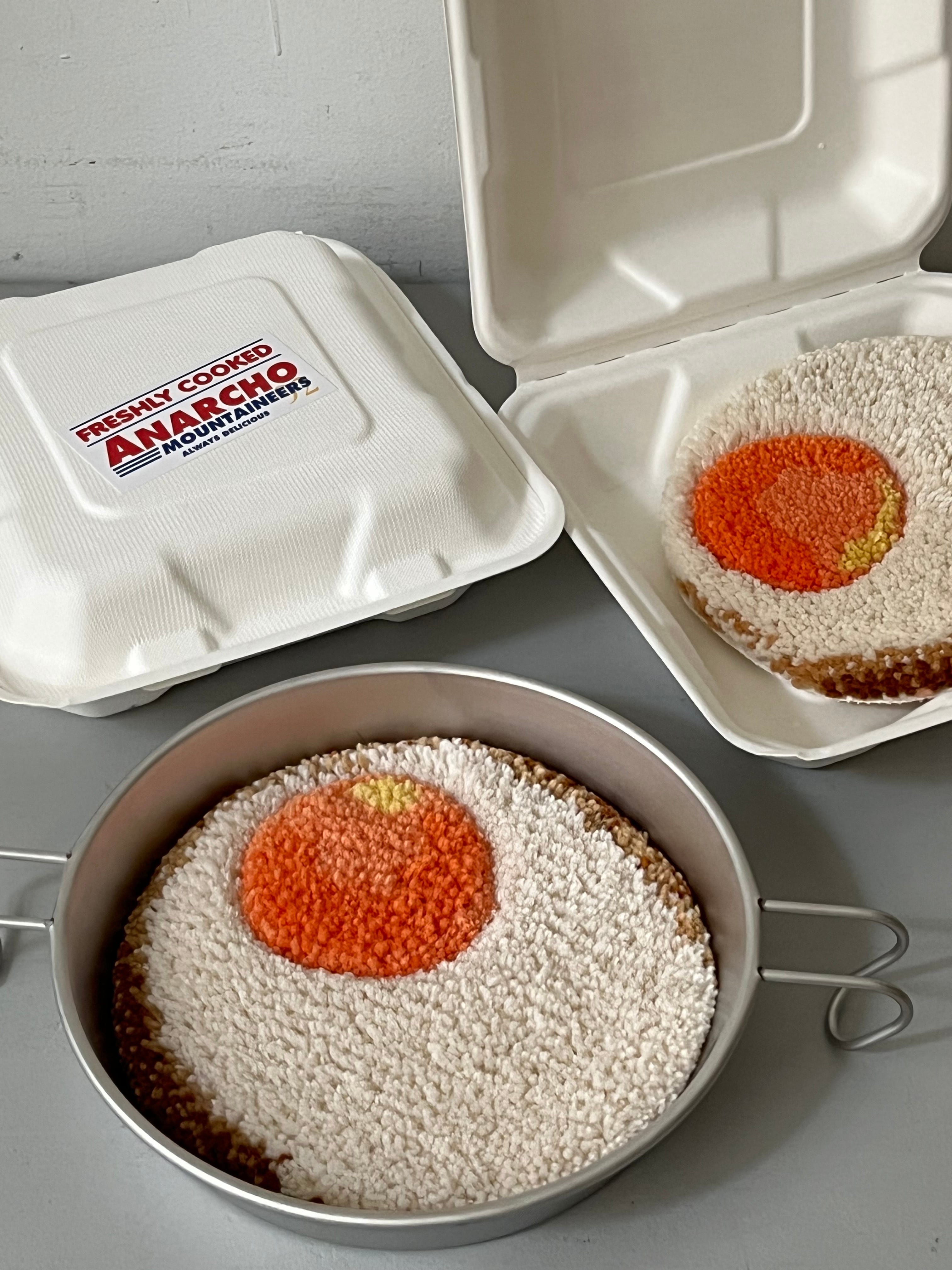 シーズンテーマ「clockwork cottage」の逸話に登場する架空の山小屋「A92」で提供される朝食を模した目玉焼きのハンドメイドラグ、アナルコカップス「Plate」にピッタリ収まるサイズ感です。