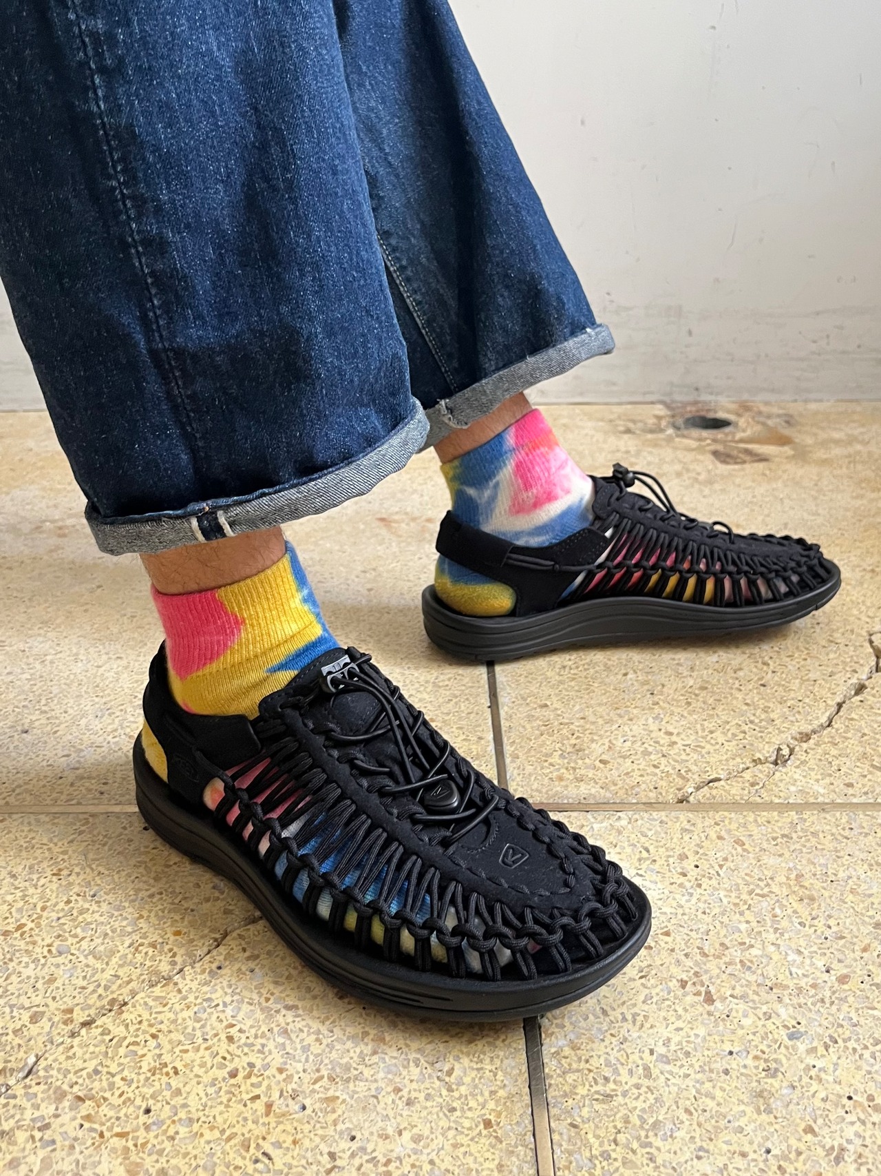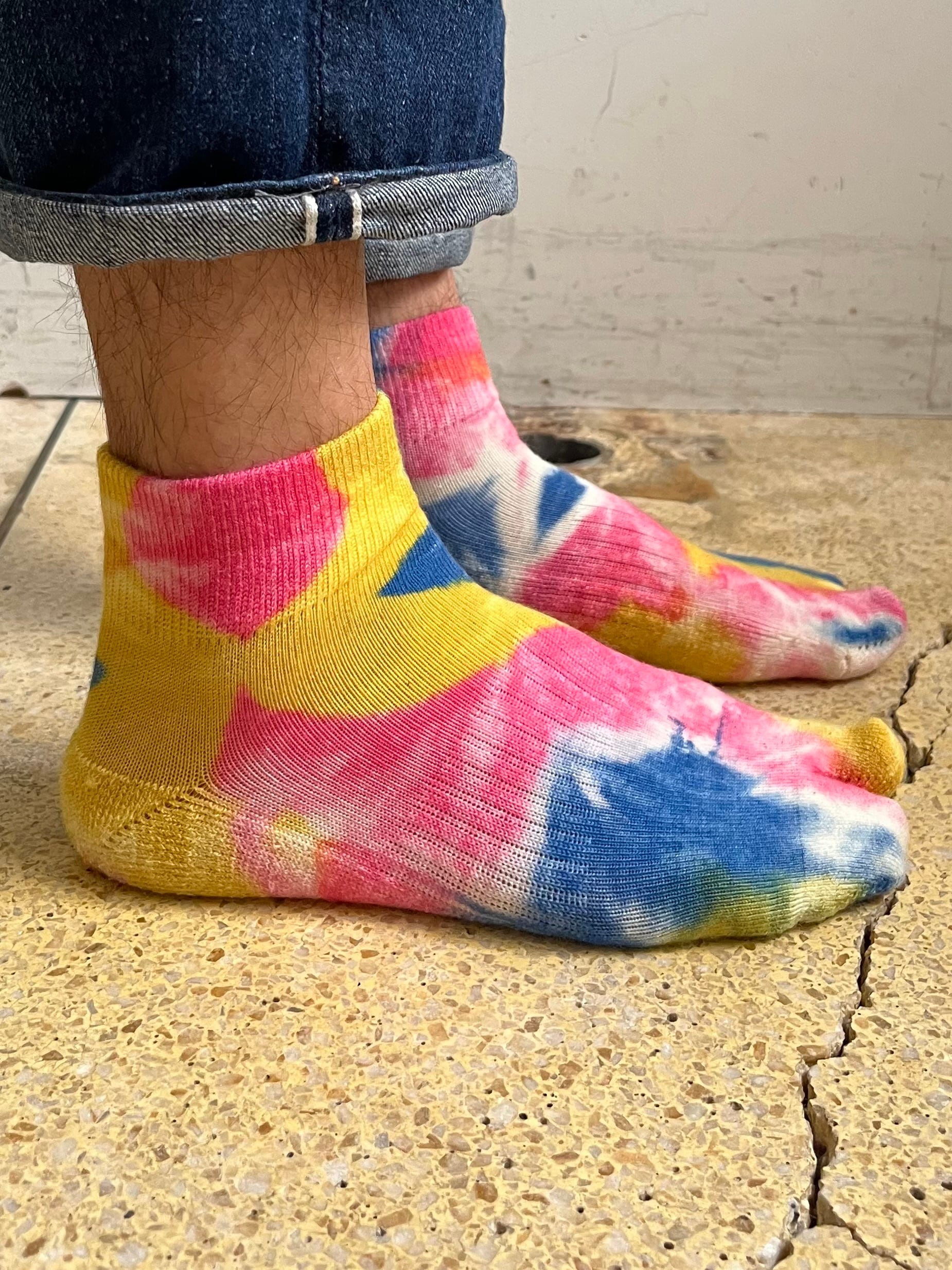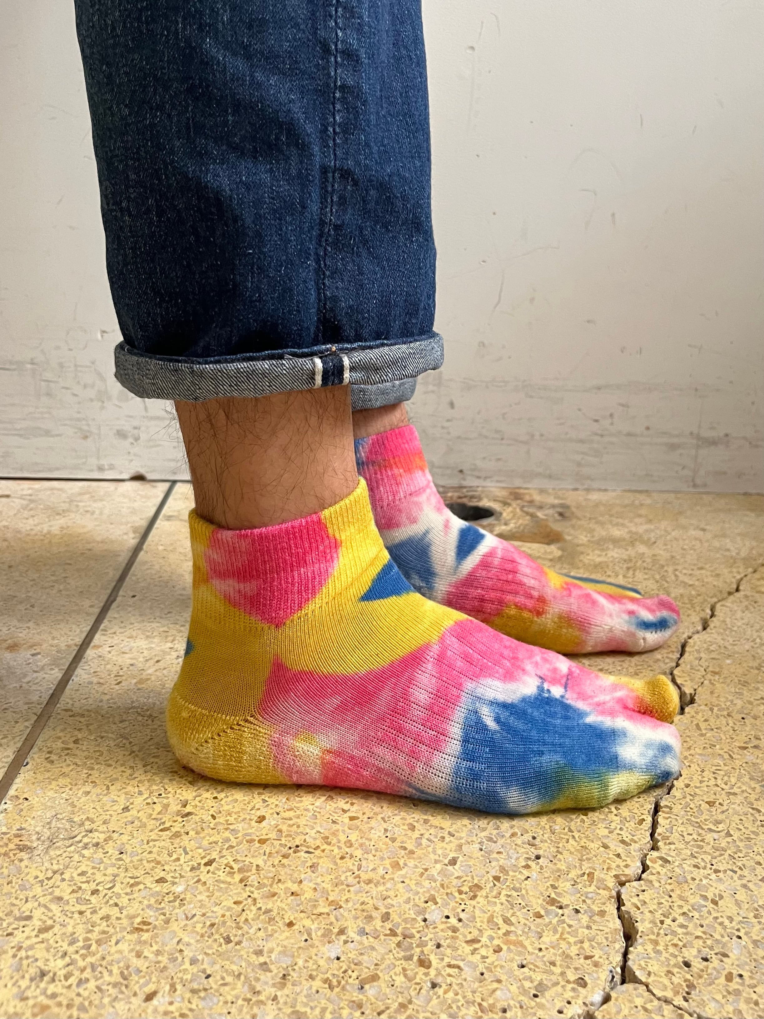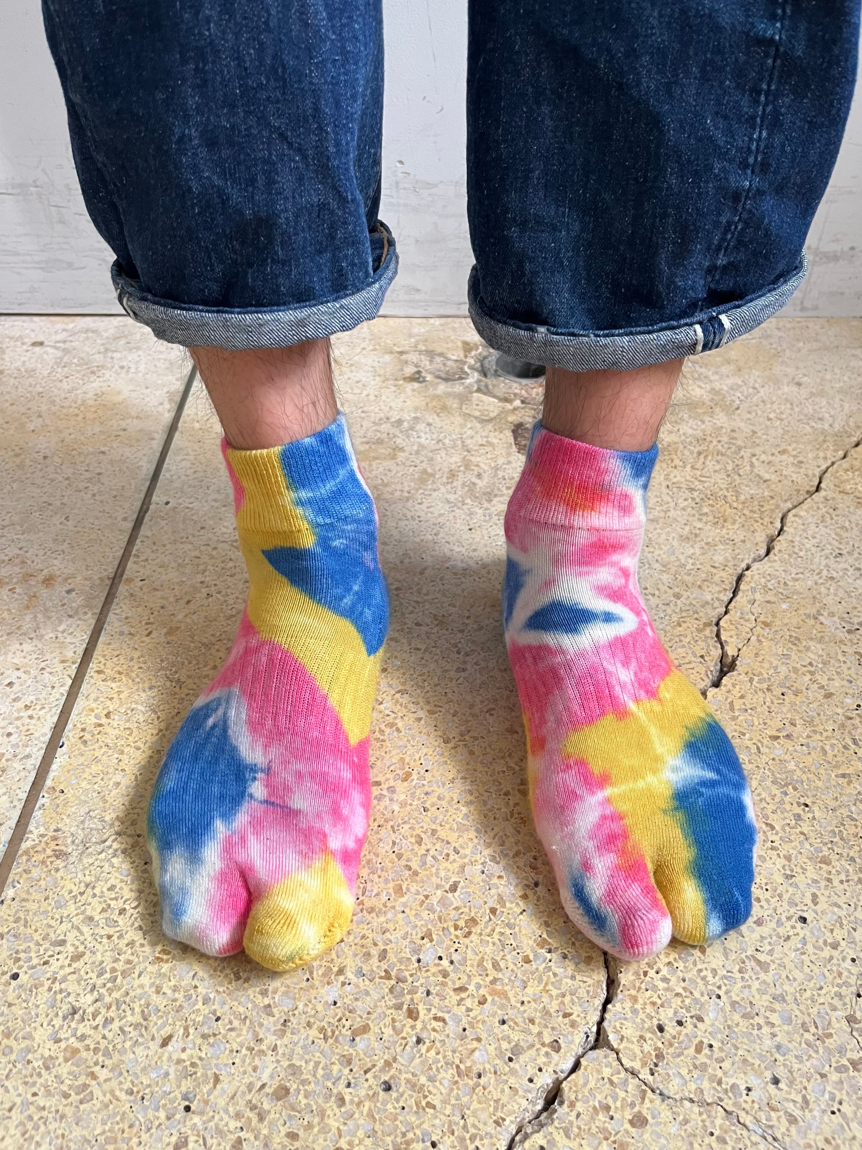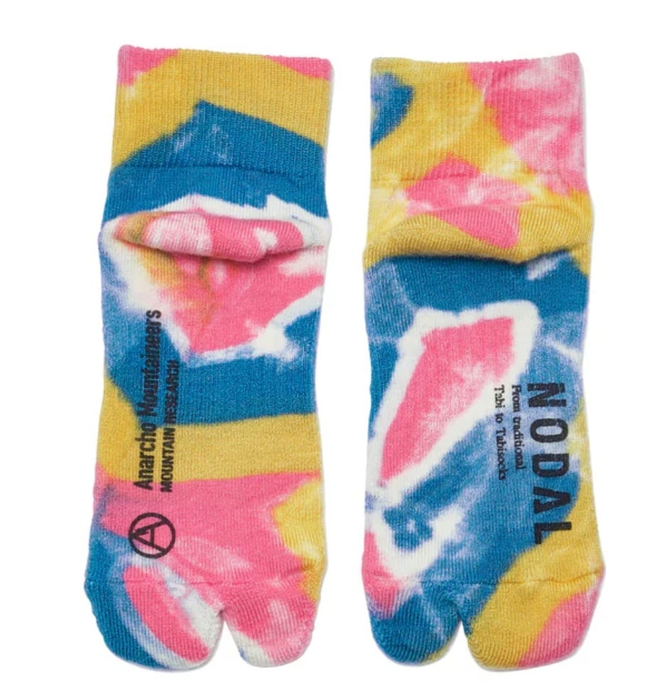 ソックスブランド「NODAL」とのコラボレーション、足袋型タイダイソックス。春夏向けのアンクル丈仕様、3色の色味が良く見せソックスとしておすすめです。