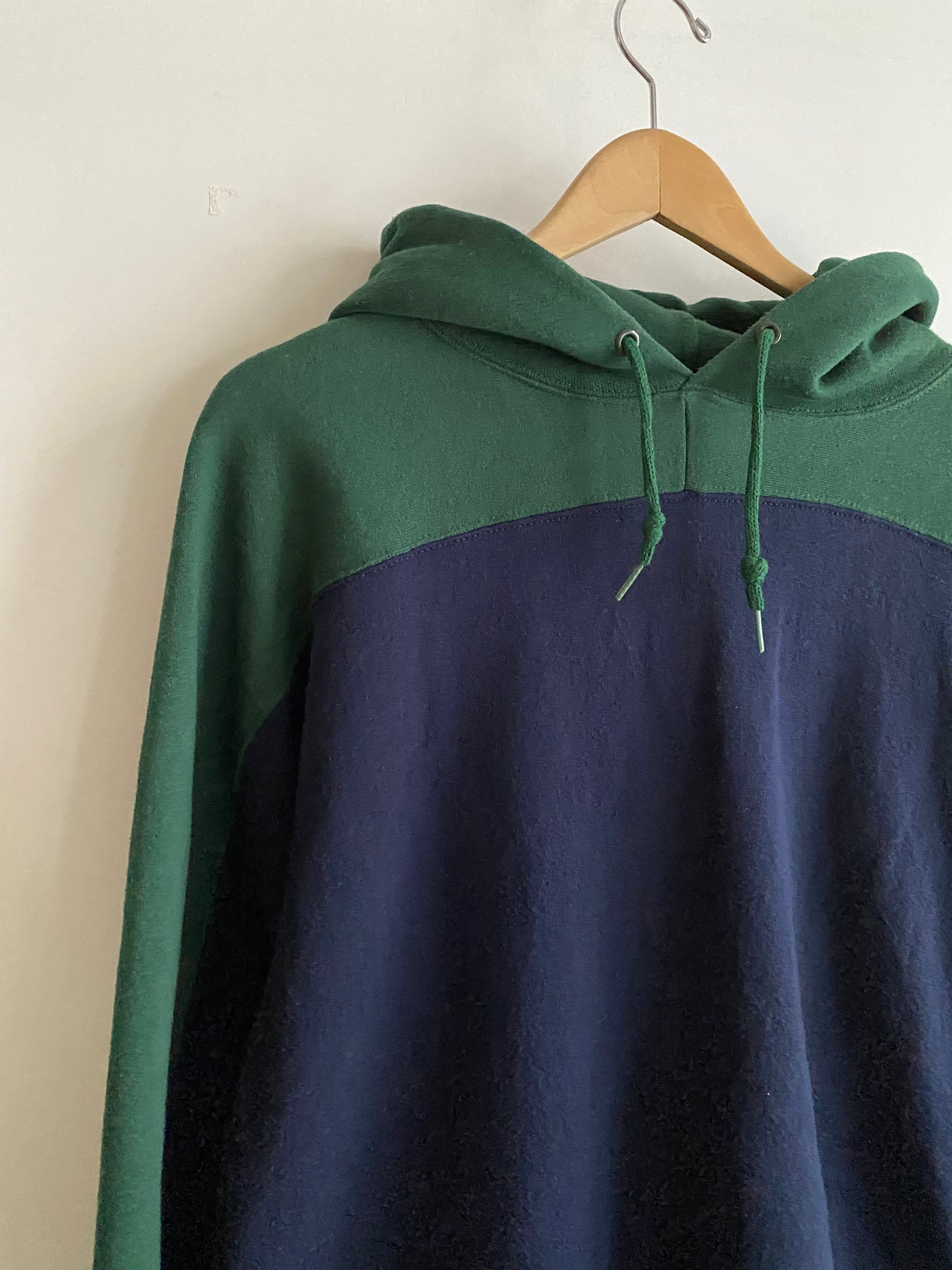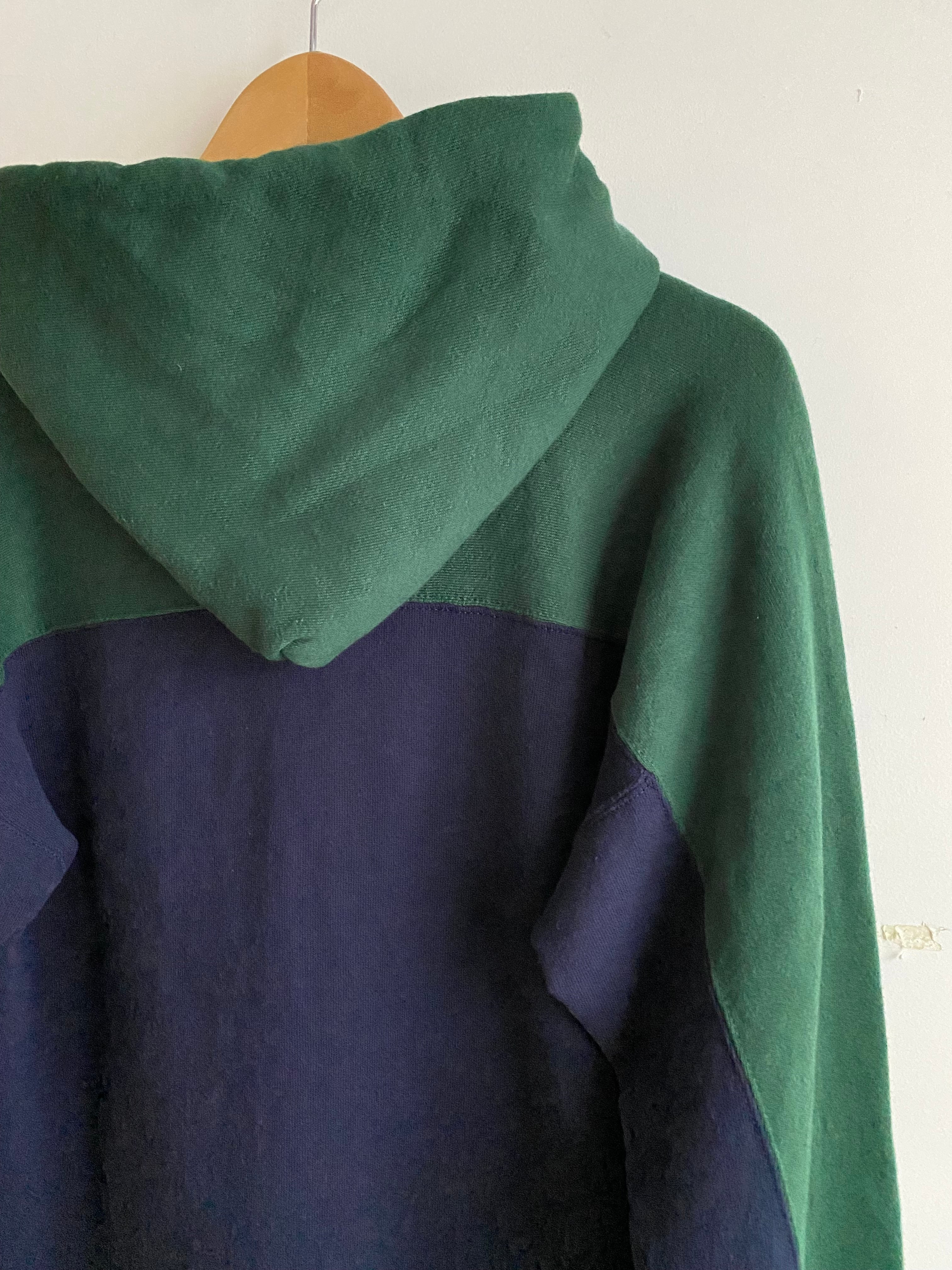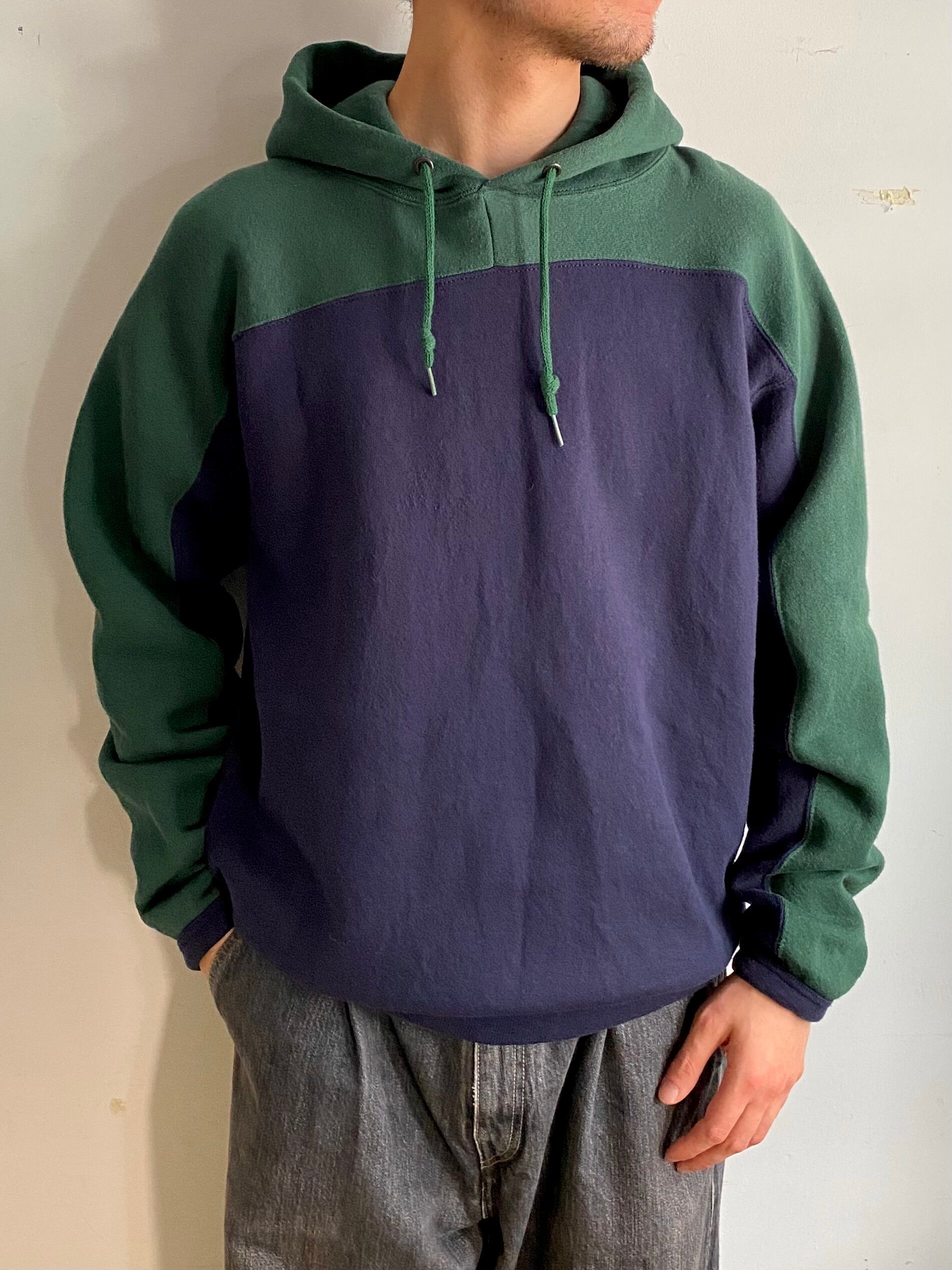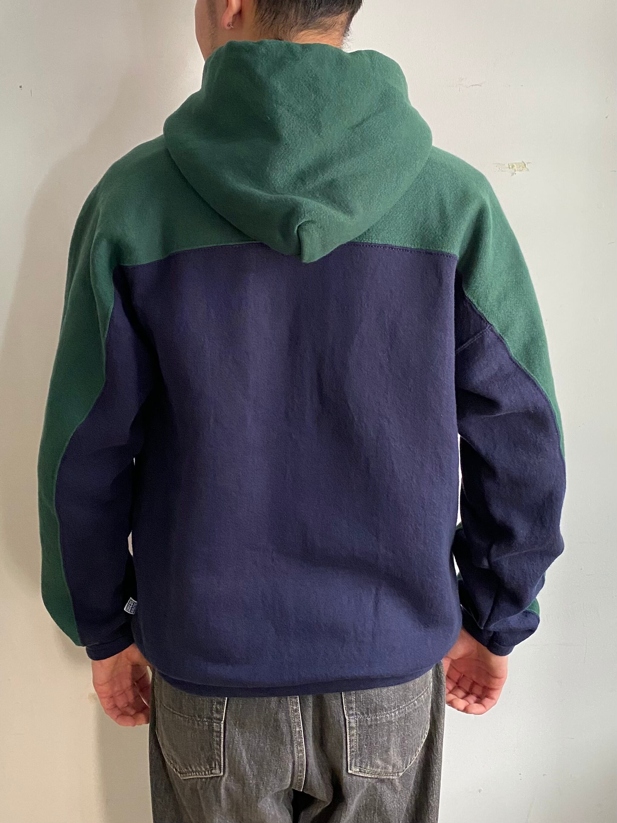 ネイビーをベースにフードから肩、腕の外側にかけて大胆に施されたグリーンの切り替えが特徴的な変形フーディ