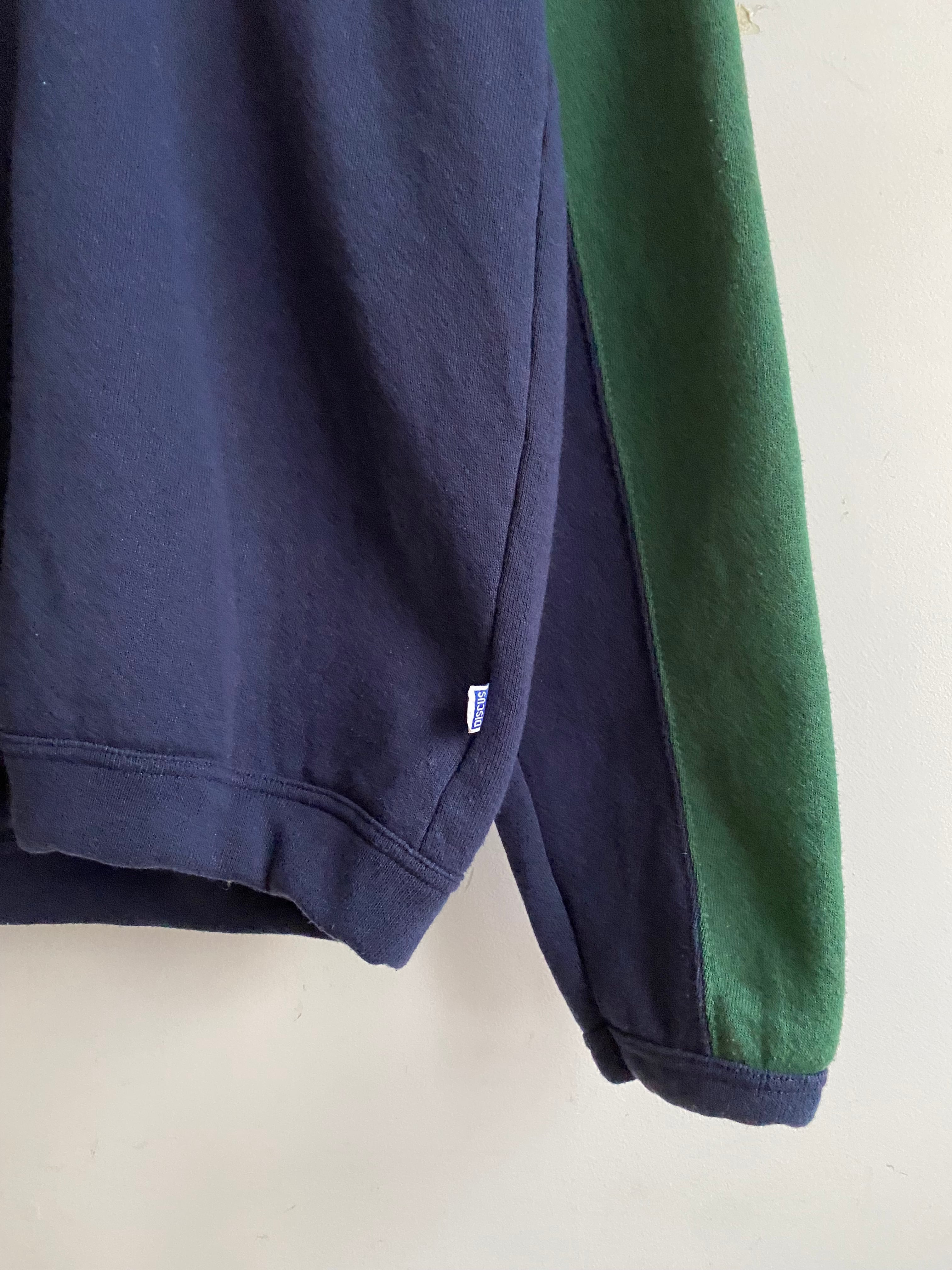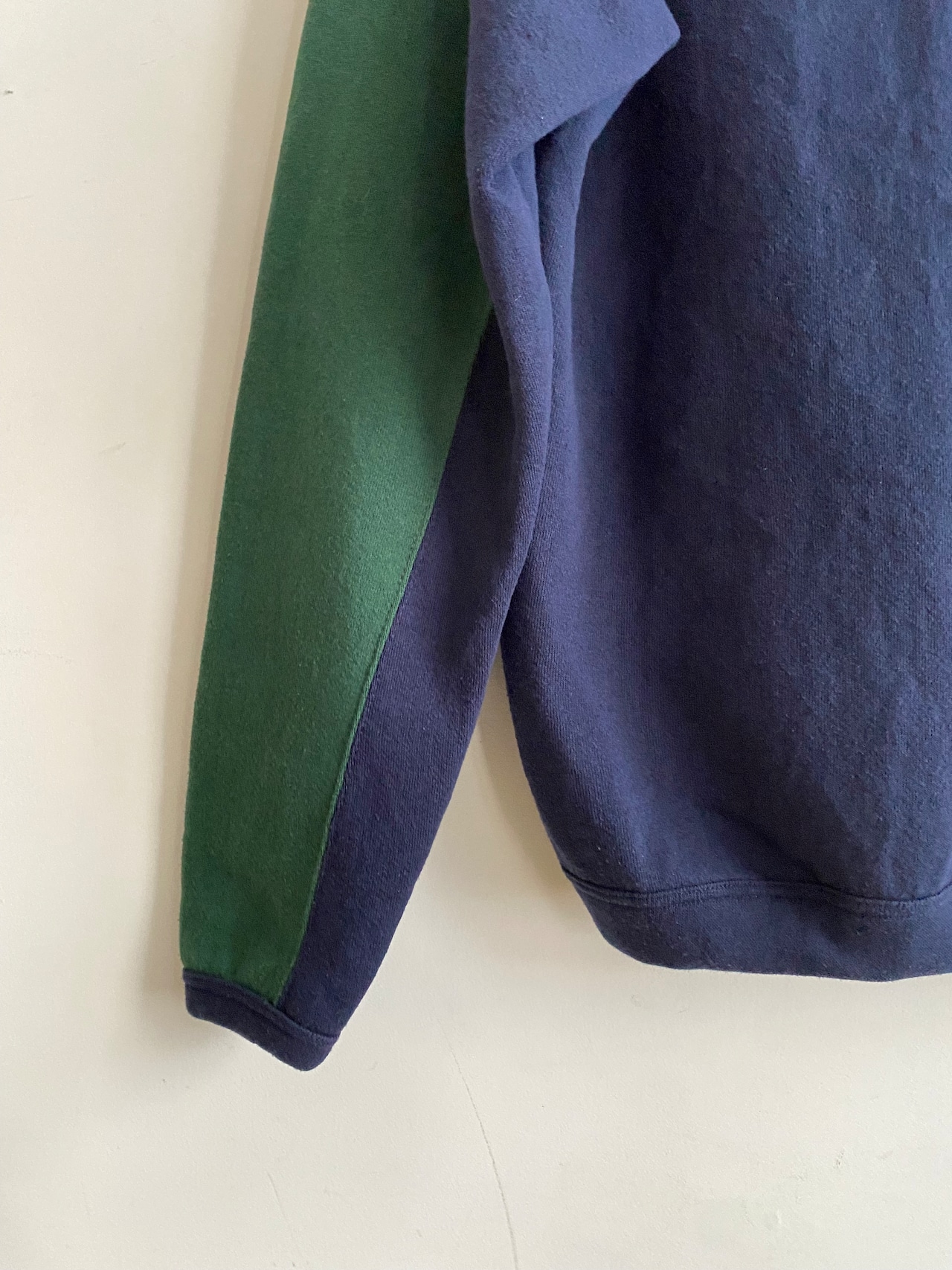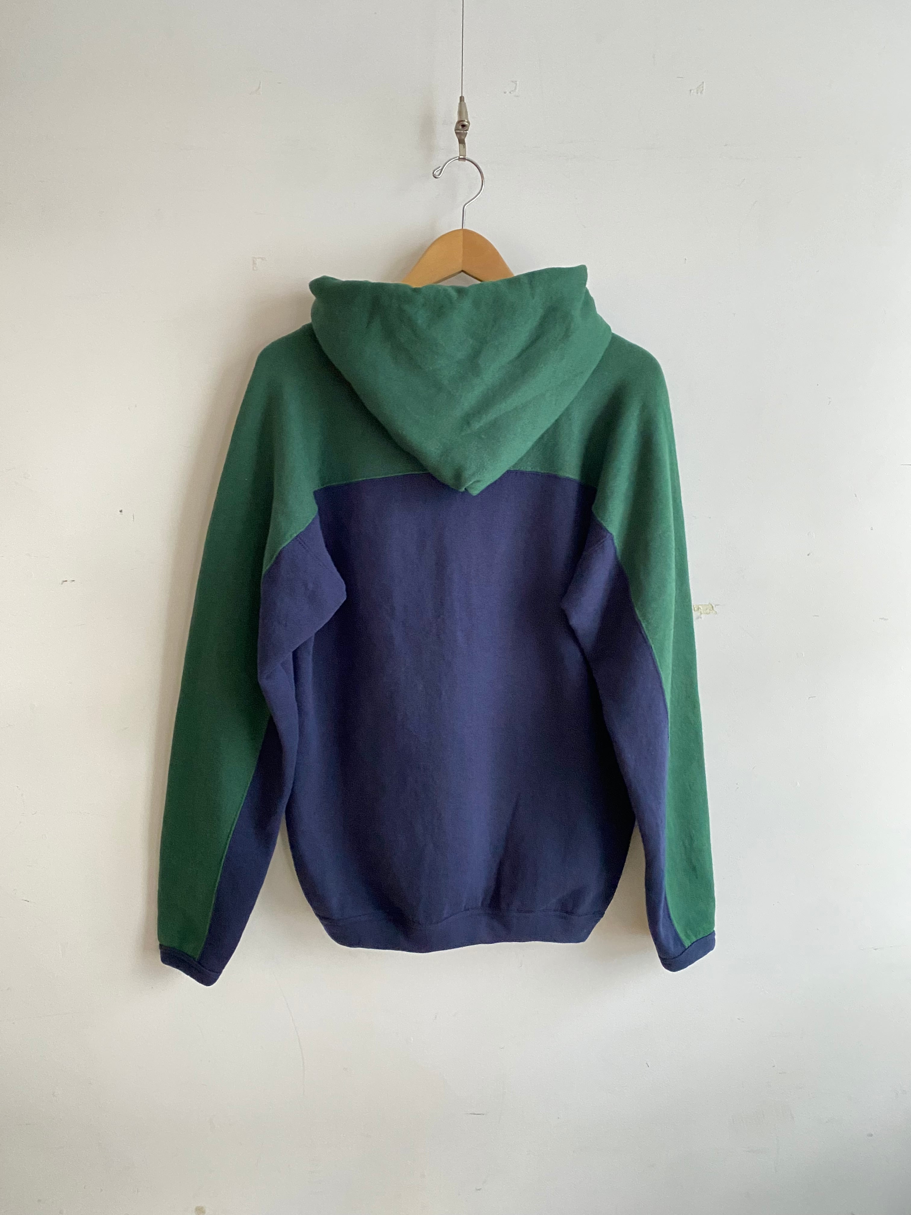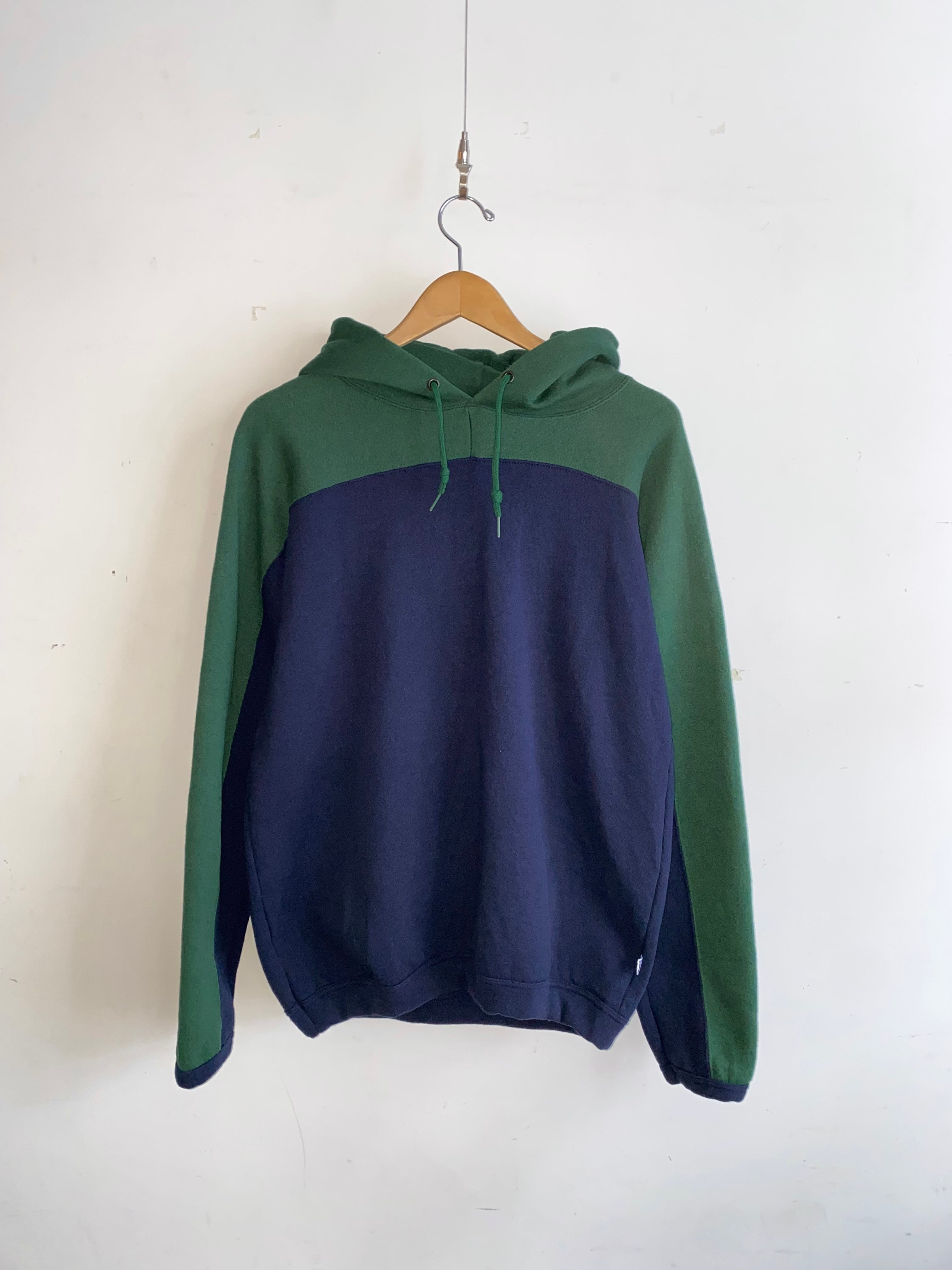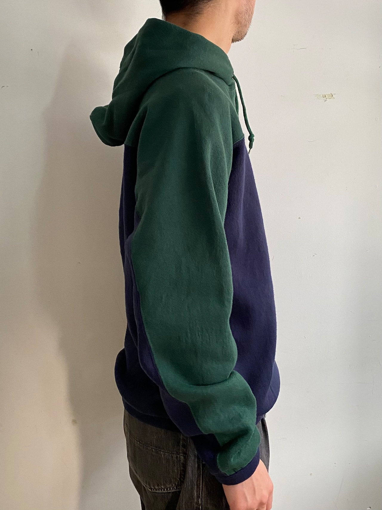 ネイビーをベースにフードから肩、腕の外側にかけて大胆に施されたグリーンの切り替えが特徴的な変形フーディ