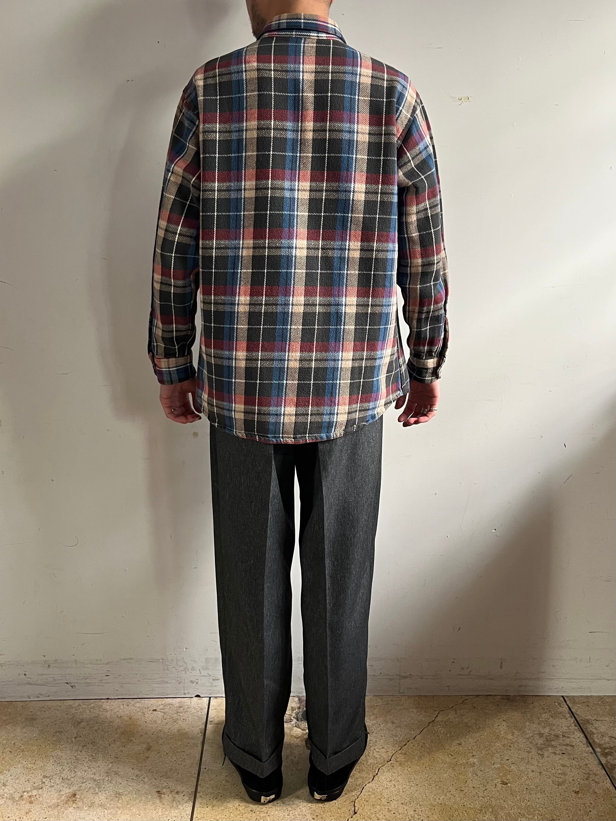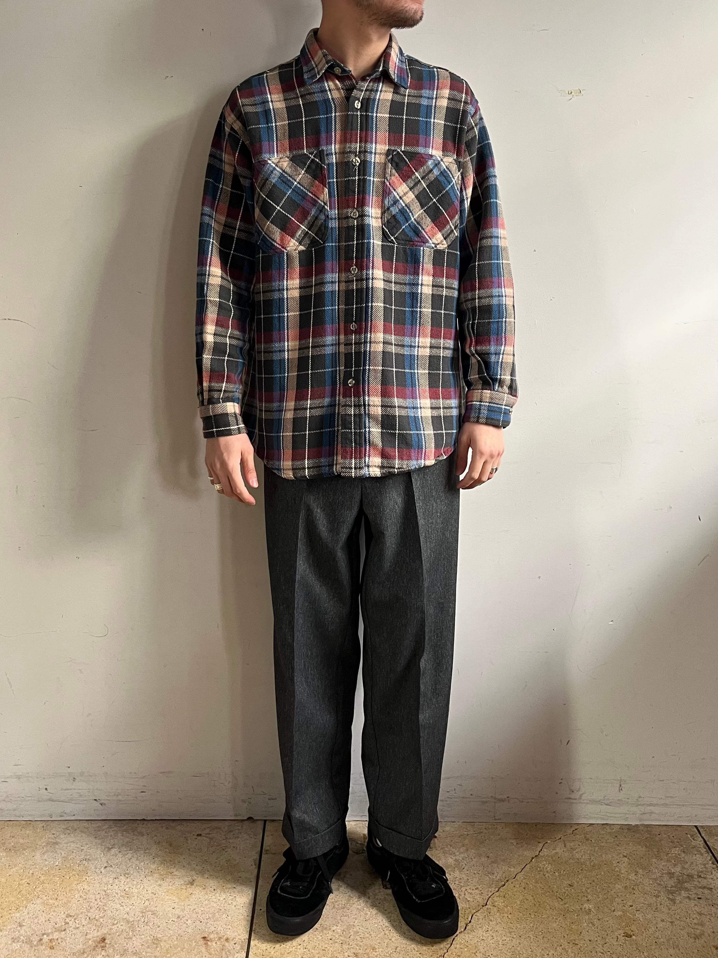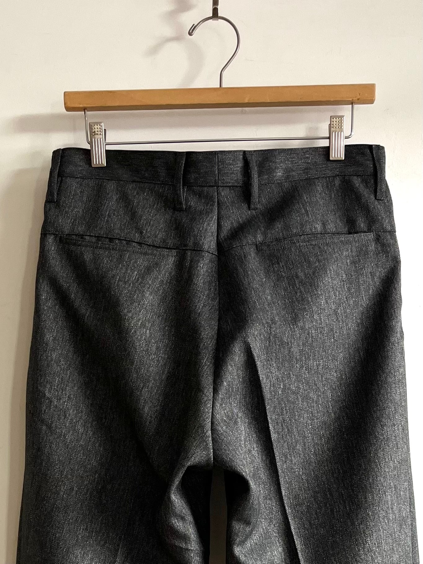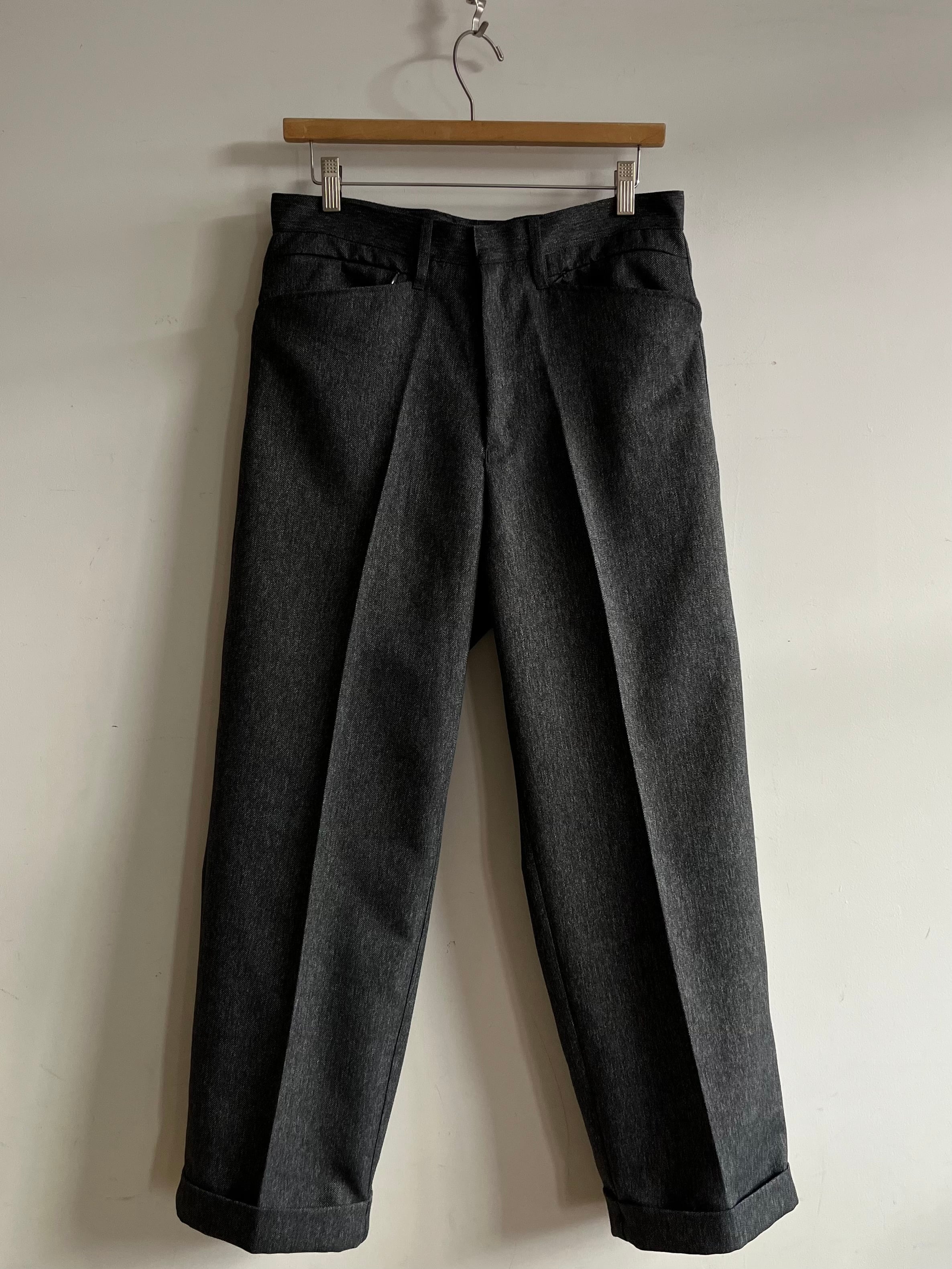 年代未確定、1990~2010年の間に製造されたとみられるポリエステル100%のツイード生地を使用。防シワ加工が施されておりイージーケア、雰囲気の良い縦に杢感の出た生地感です。