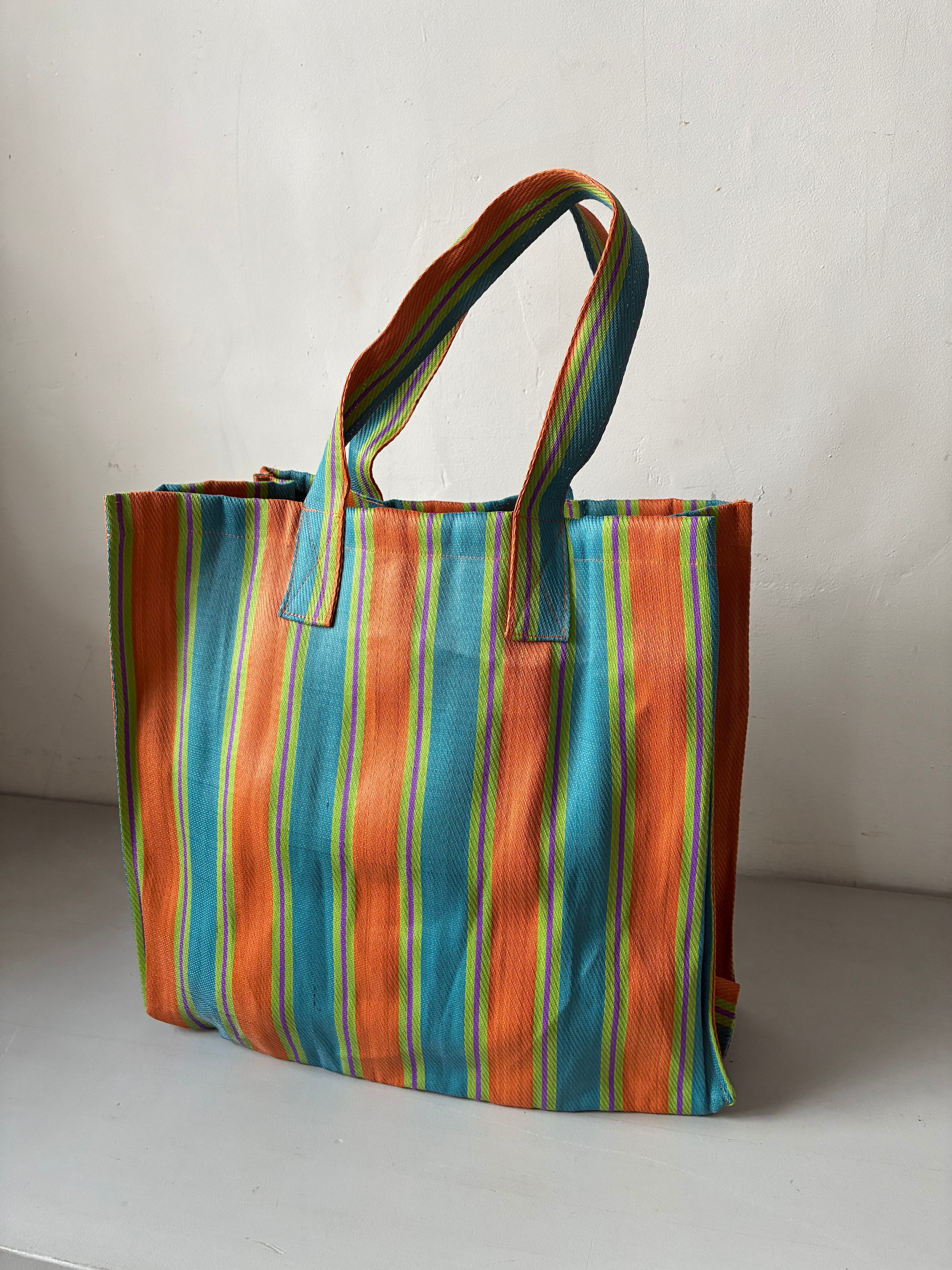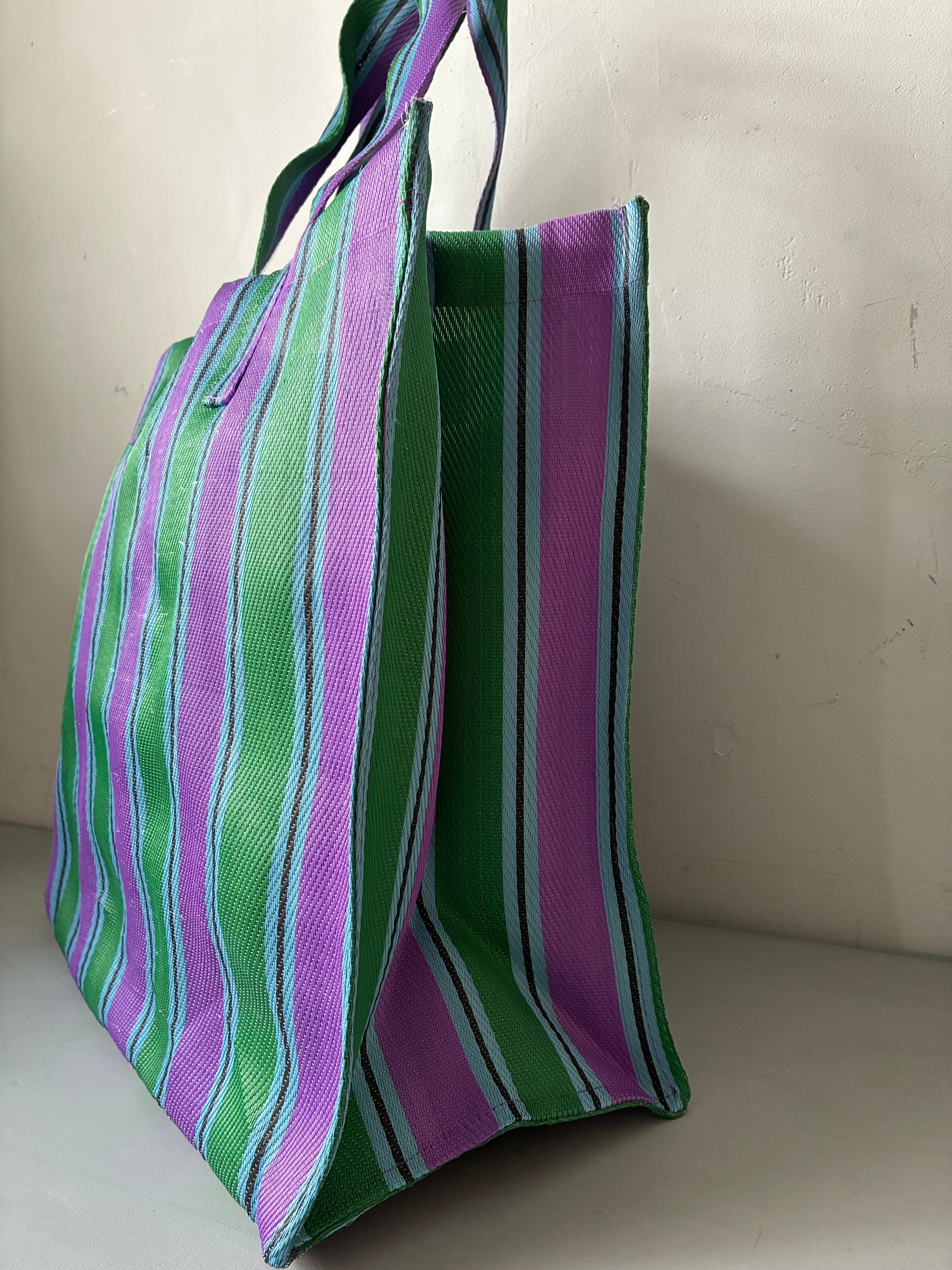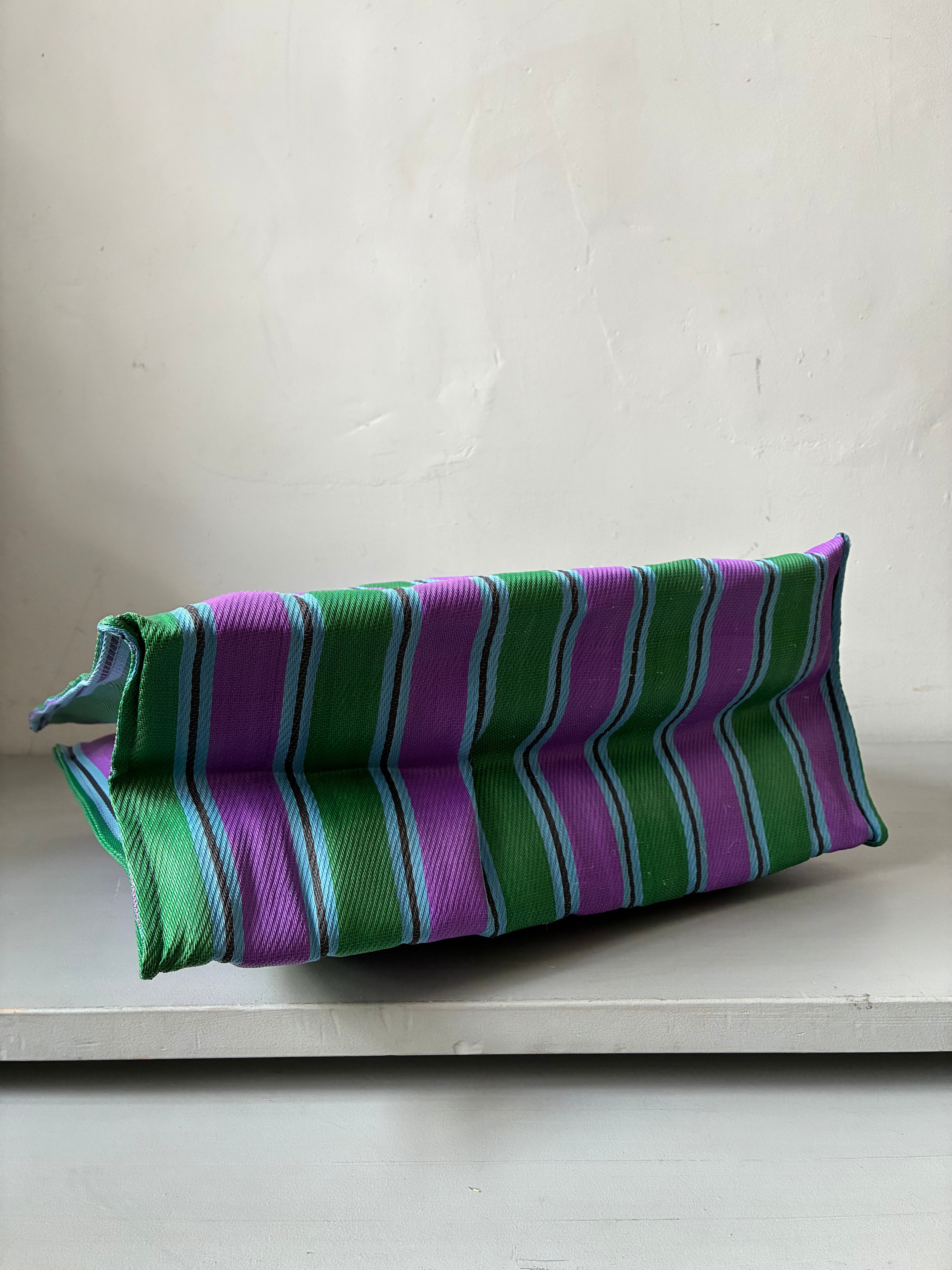 廃棄されたペットボトルやポリ袋のリサイクル素材を使用したストライプ柄のバッグ。