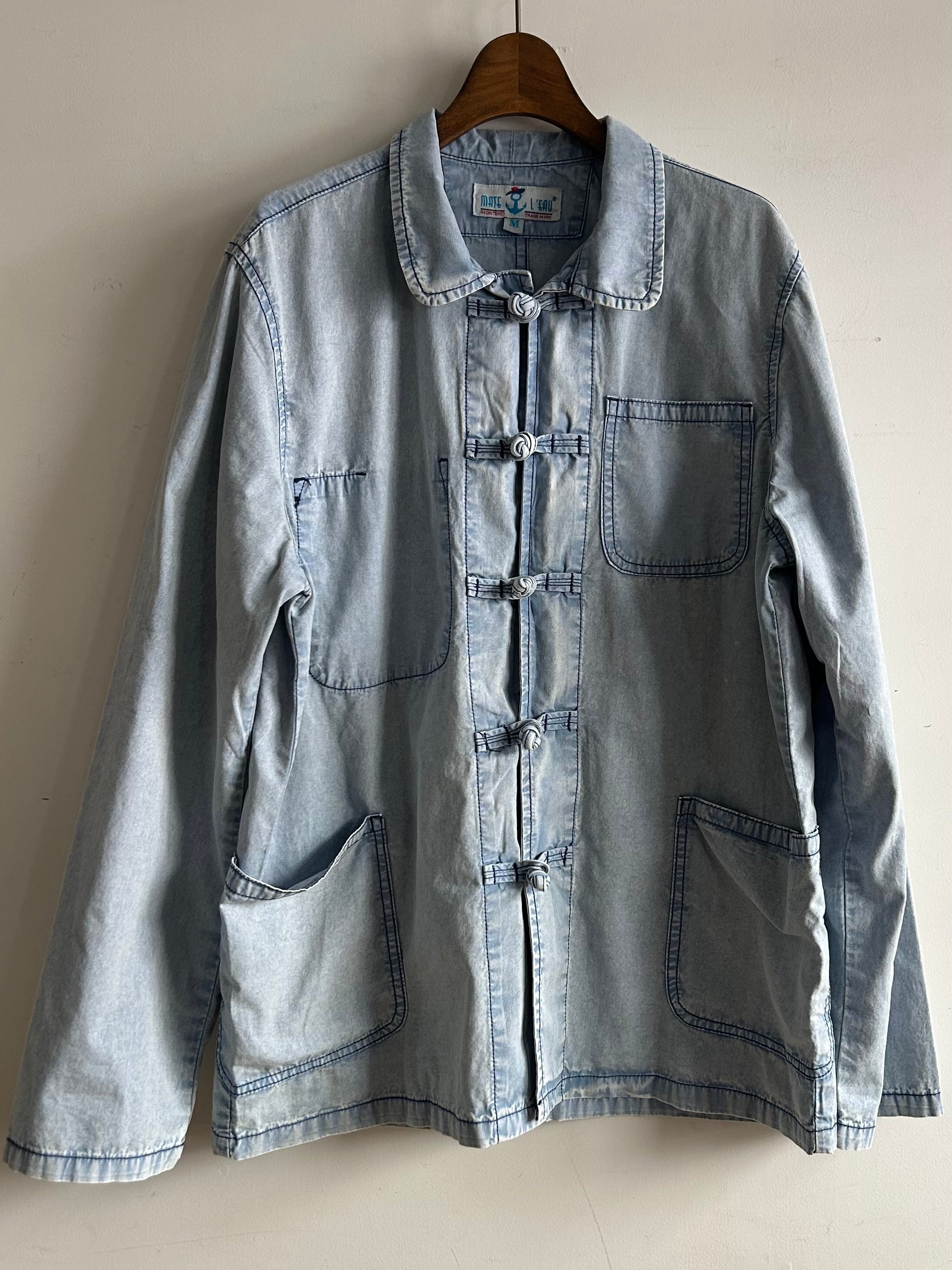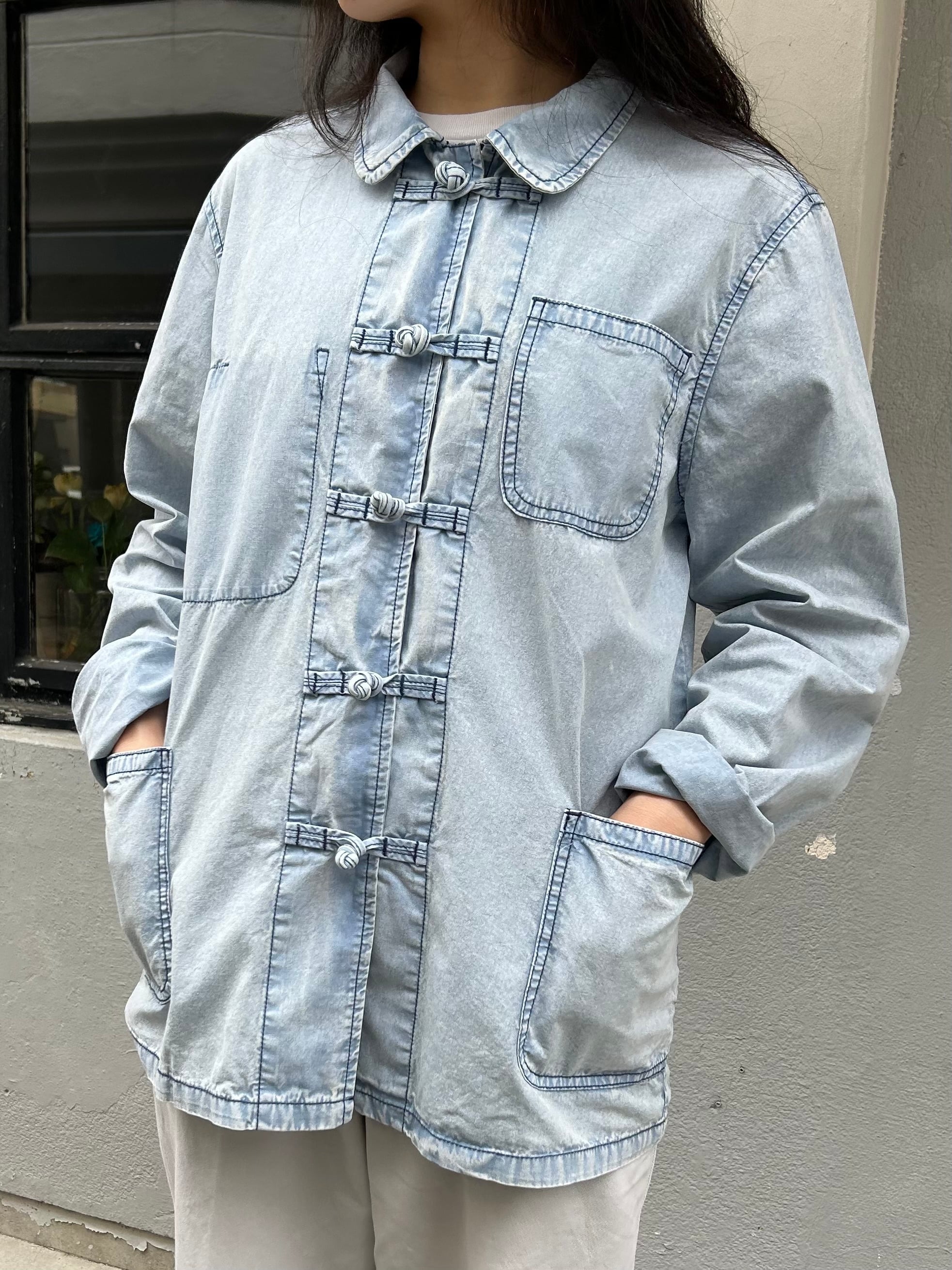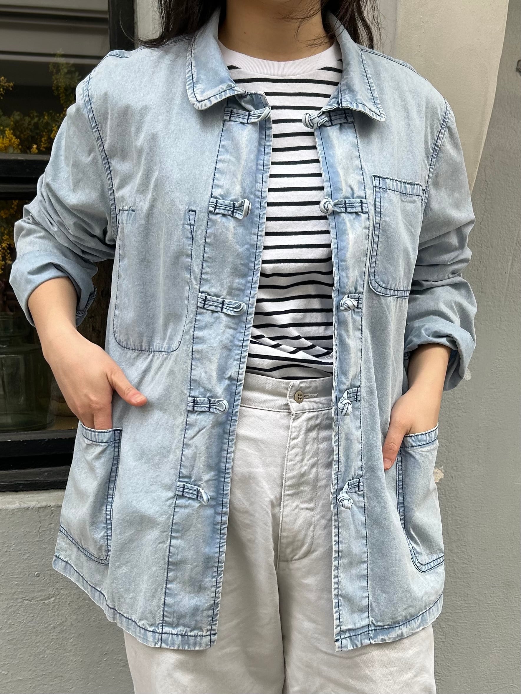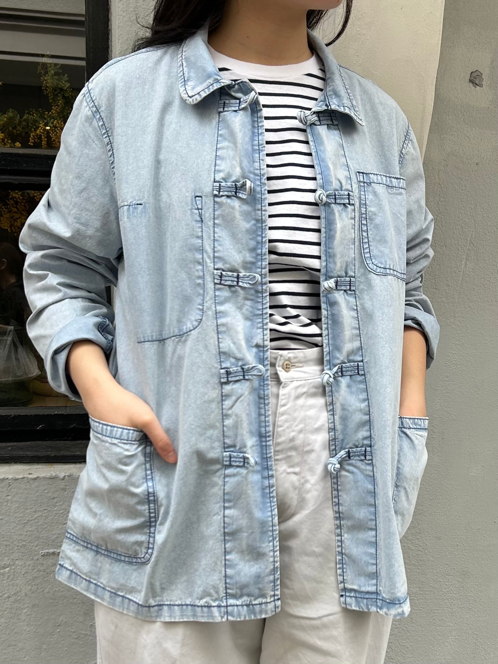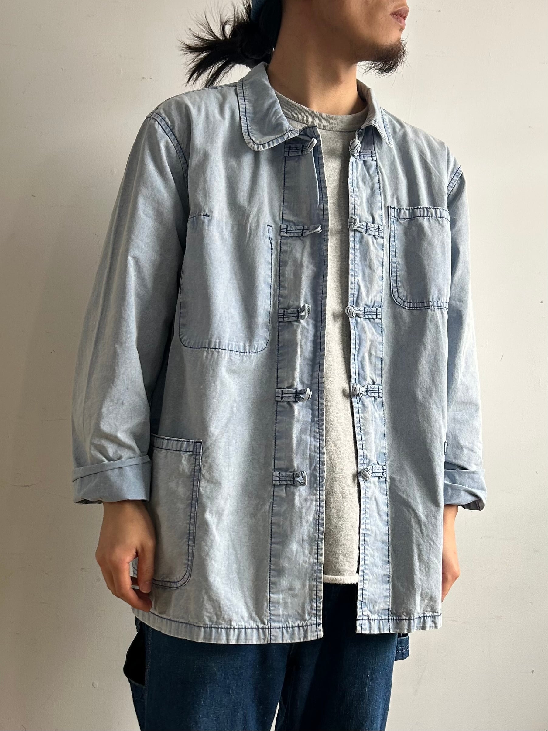 フレンチワークジャケットをベースに前空きボタンをチャイナボタンに替えたデザイン。素材はシャツ生地よりやや厚みのある薄手の綿生地、着心地が軽く春や秋頃の羽織りに丁度良い一着。製品洗いと加工が施されておりフェード感の効いたサックスカラーが晴れやかな印象。