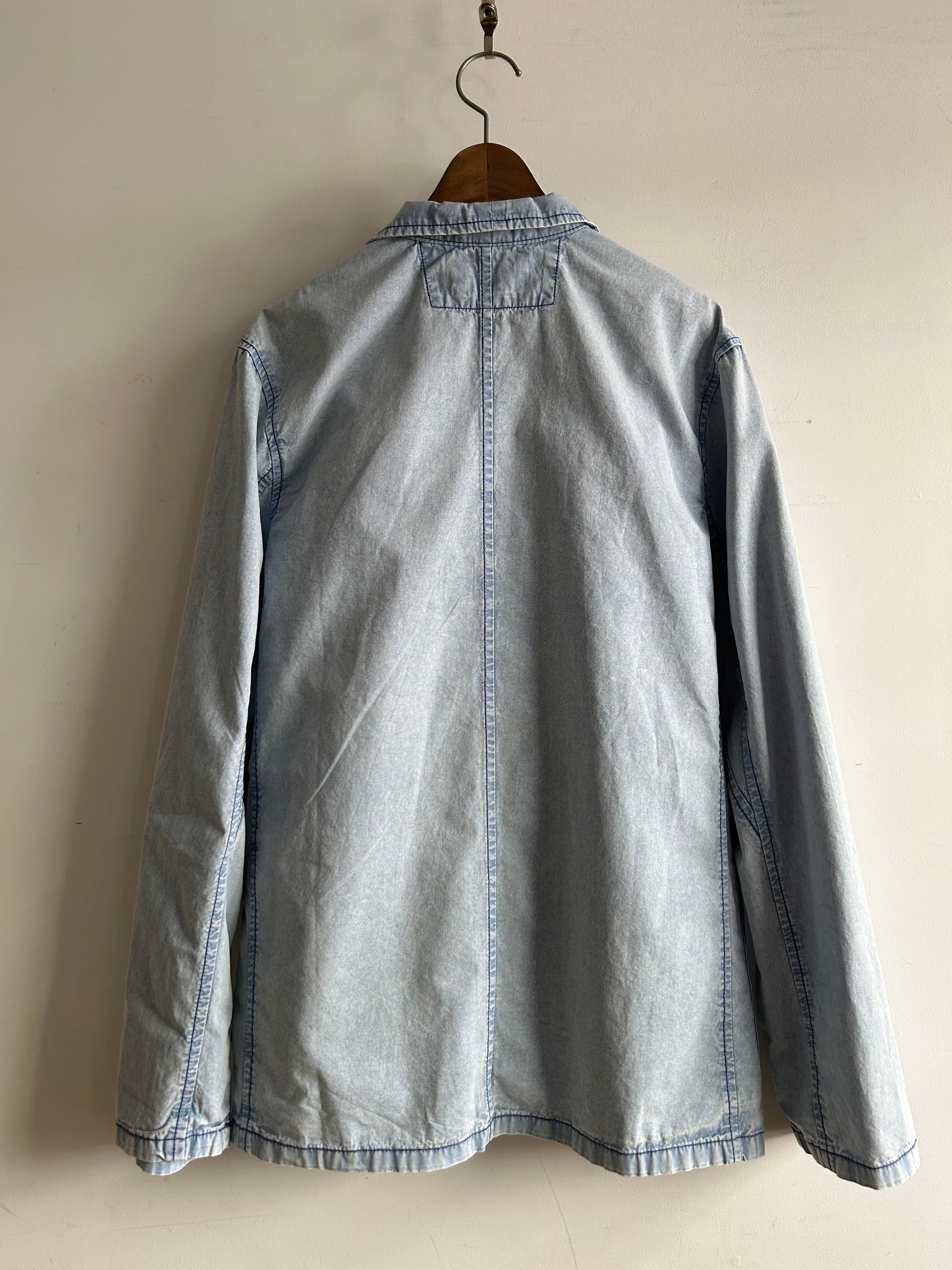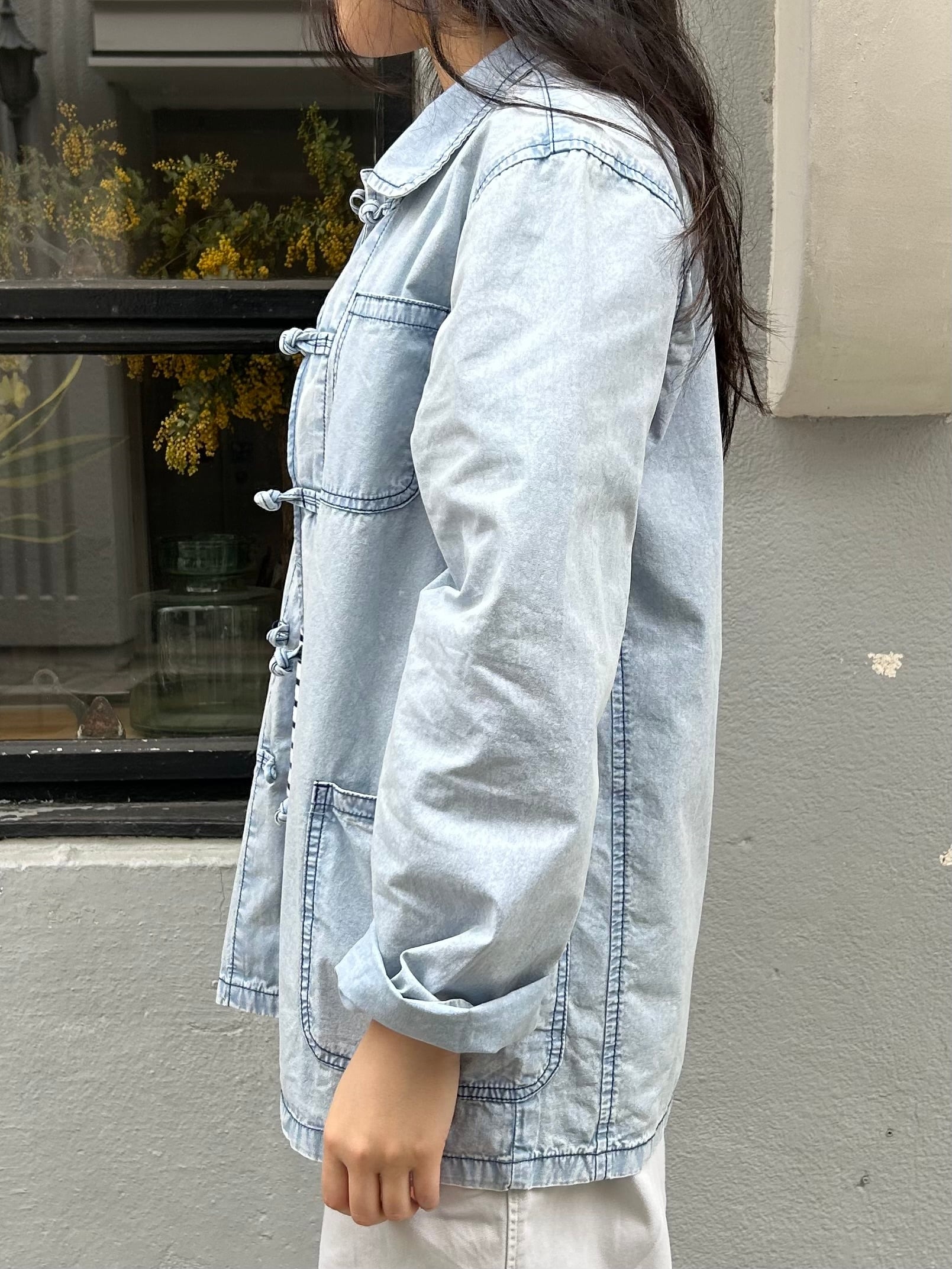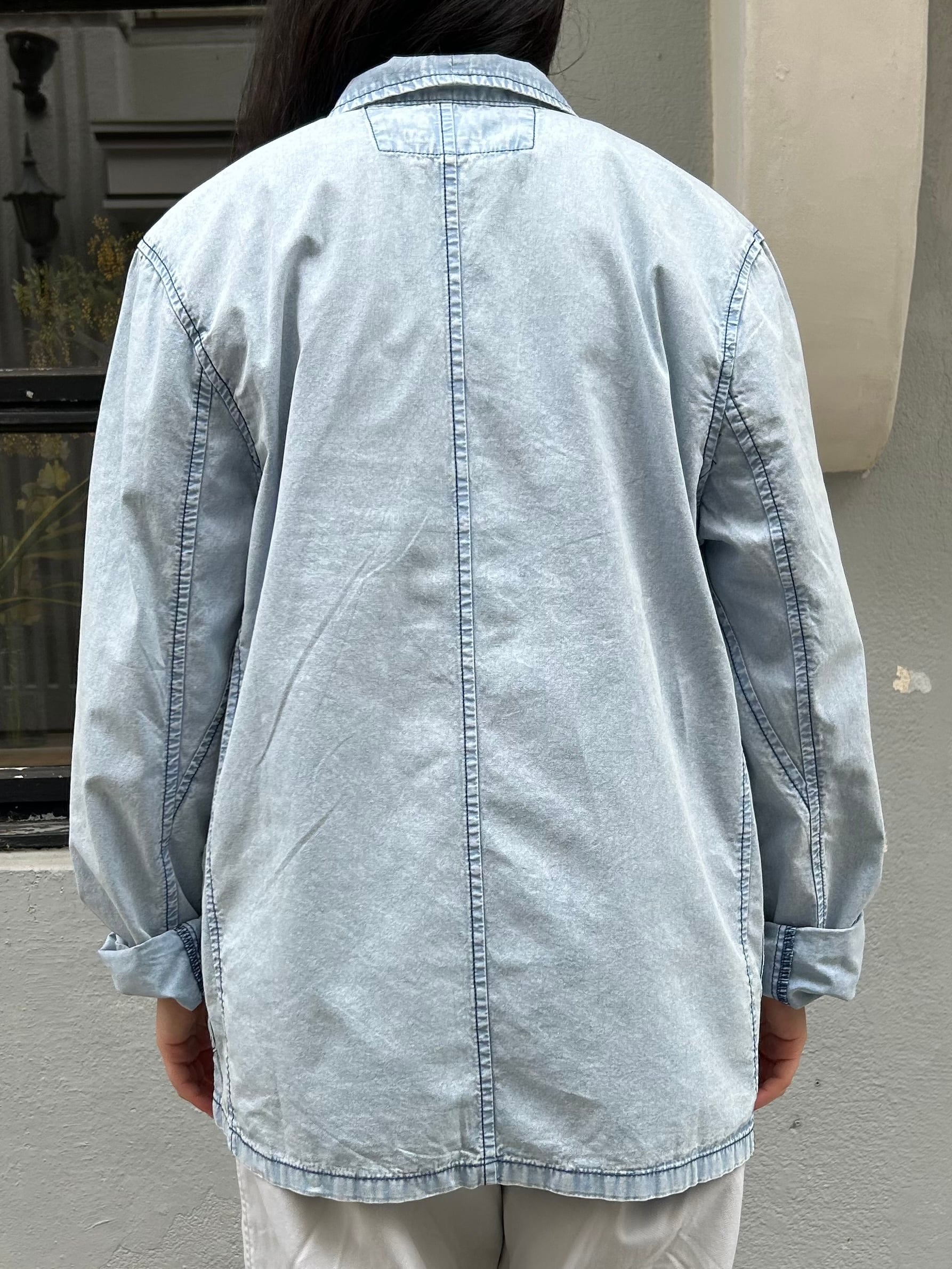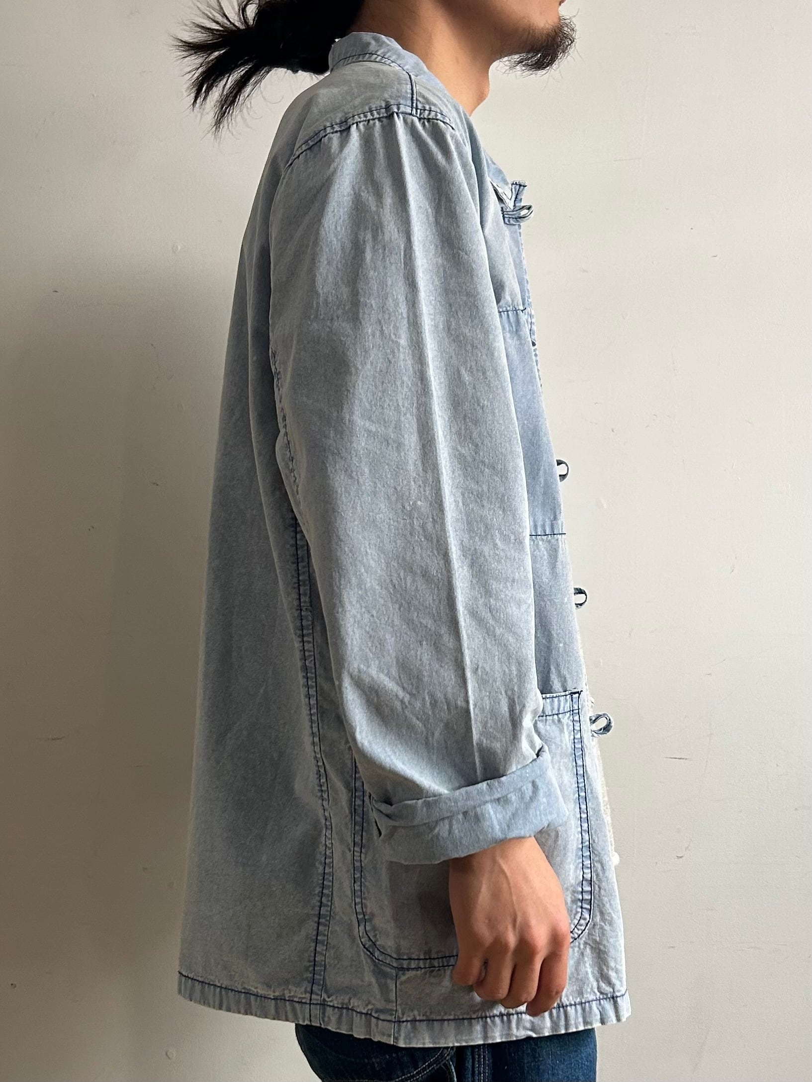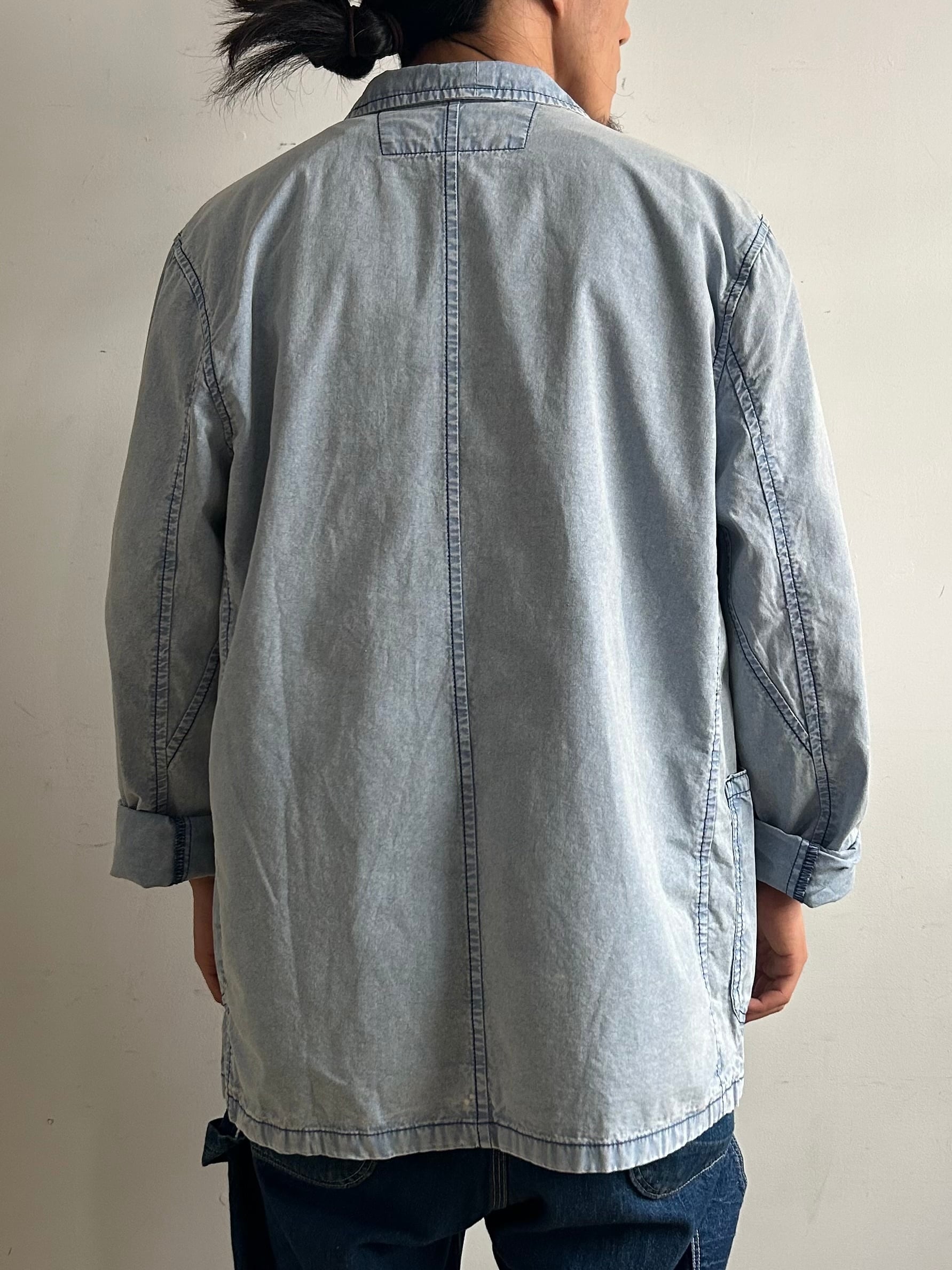 フレンチワークジャケットをベースに前空きボタンをチャイナボタンに替えたデザイン。素材はシャツ生地よりやや厚みのある薄手の綿生地、着心地が軽く春や秋頃の羽織りに丁度良い一着。製品洗いと加工が施されておりフェード感の効いたサックスカラーが晴れやかな印象。
