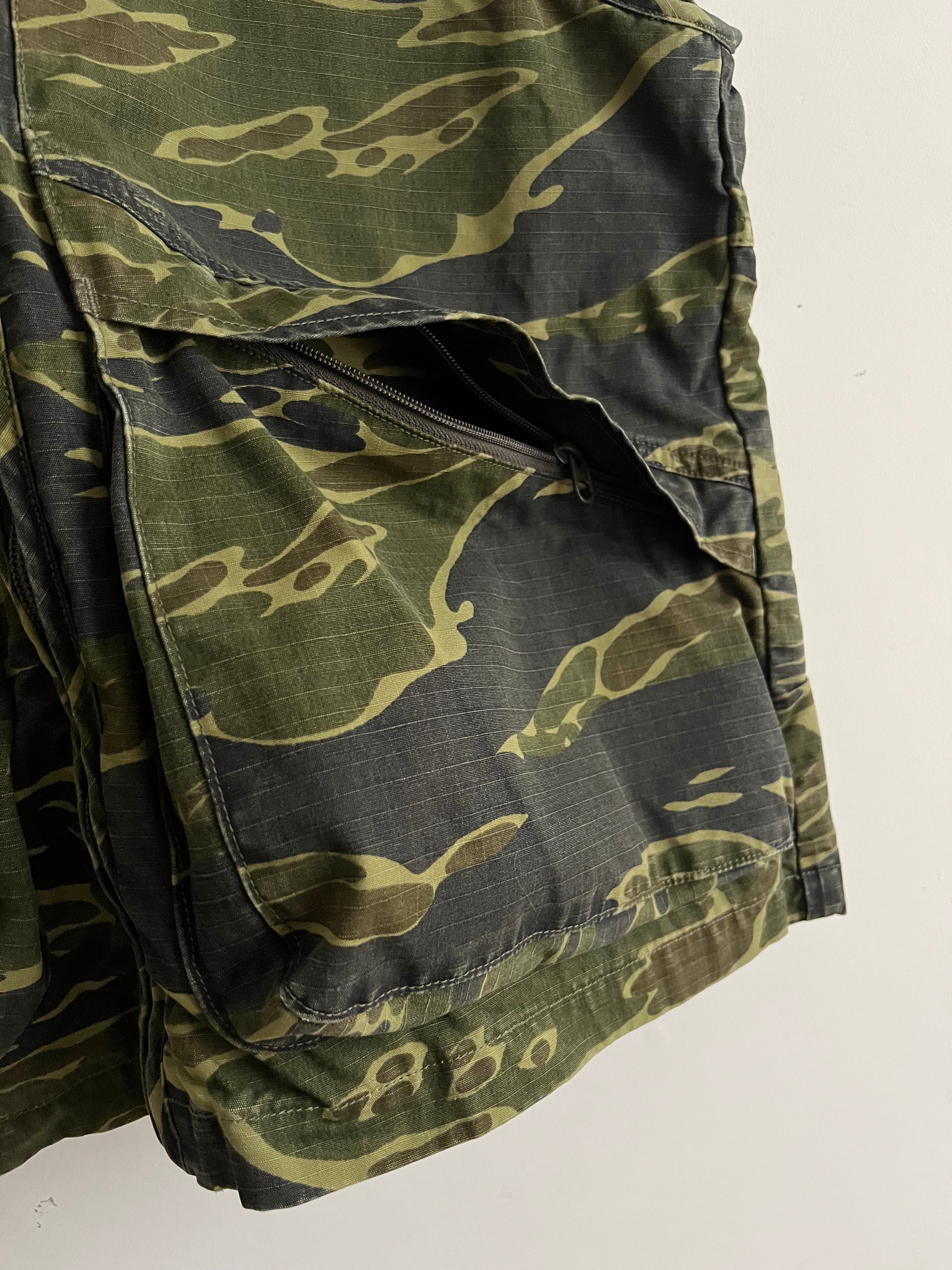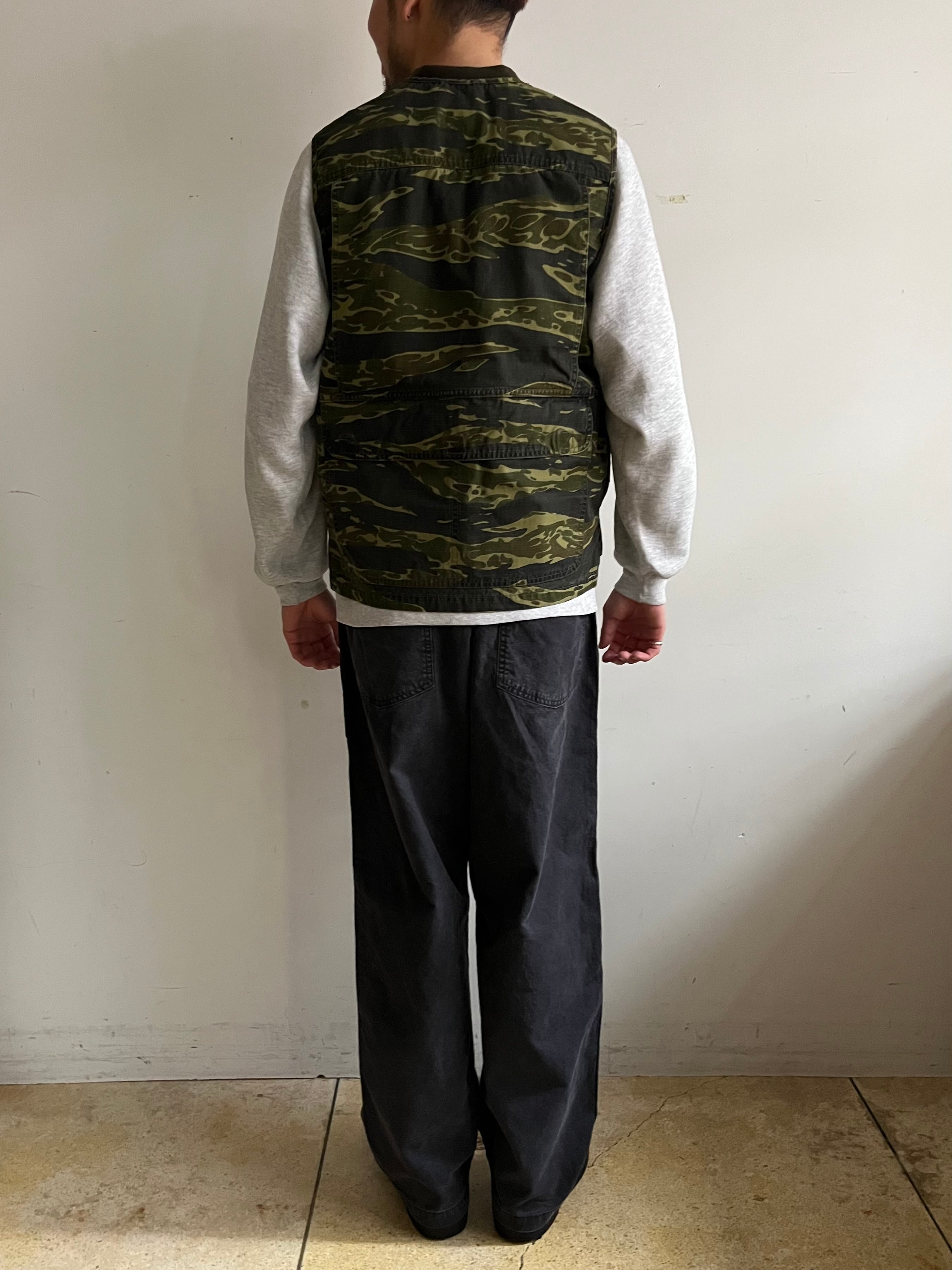 素材には耐久性のあるコットンリップストップ生地を使用、マチ付きの大型ポケット、背裏のメッシュベンチレーションと背面下部のフラップポケットなどなど、実用性をデザインに落とし込んだ機能美が魅力的な一着。形は着丈がやや長めのボックスシルエットでレイヤードがしやすい印象、一重で厚すぎないのでアウターの下にインナーとして覗かせるのもおすすめ。洗い加工済み、プリントされたタイガーカモとリップストップ生地のフェード感が雰囲気の良い一品です。