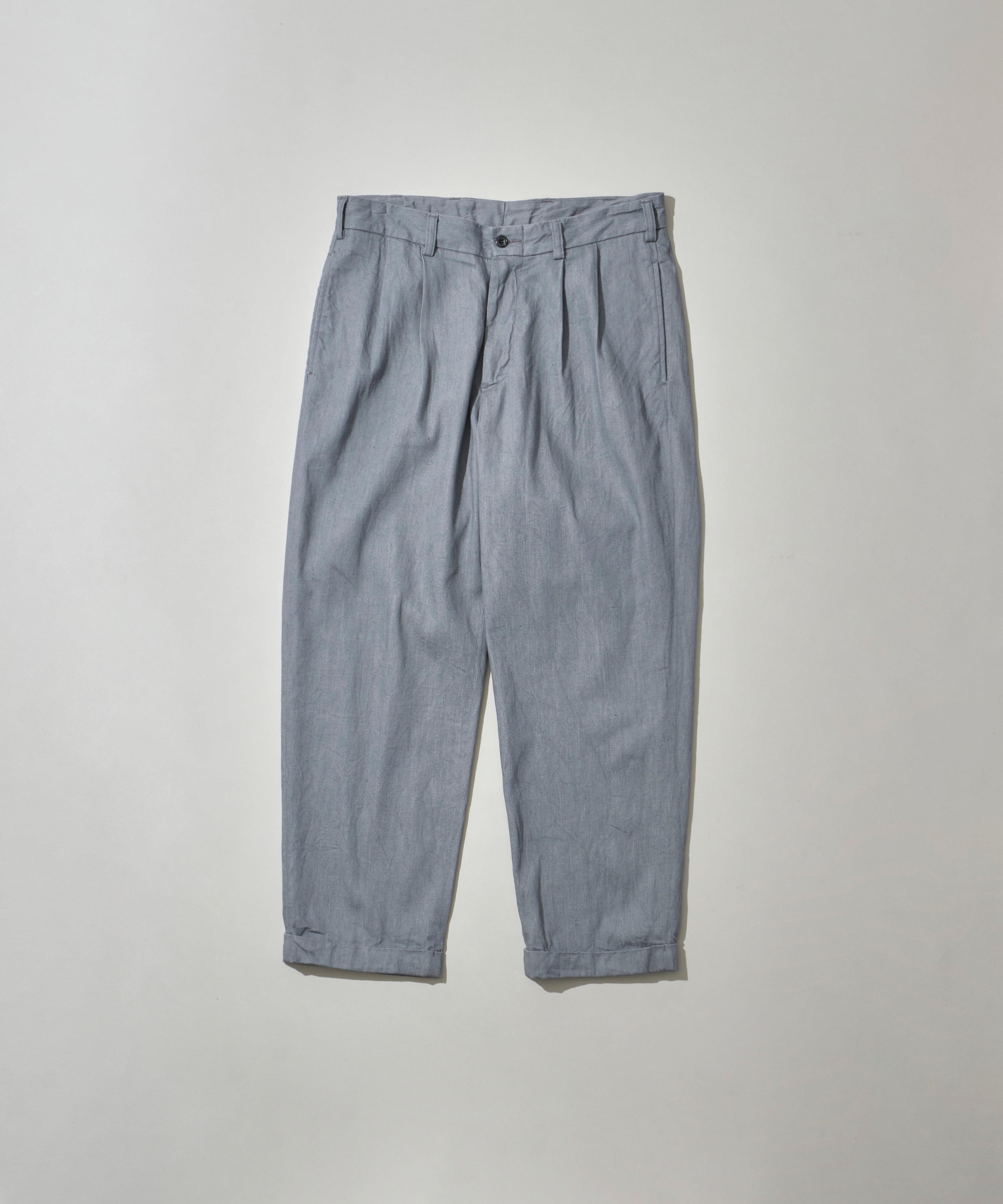 クラシックトラウザーをカジュアルな素材でラフにという落とし込み方は得意とするところ。注目のテーパード型タックパンツは、無装飾ゆえの味わい深さが素晴らしい仕上がり。素材は今シーズン大きくフィーチャーしている8.5oz.ライトデニム。