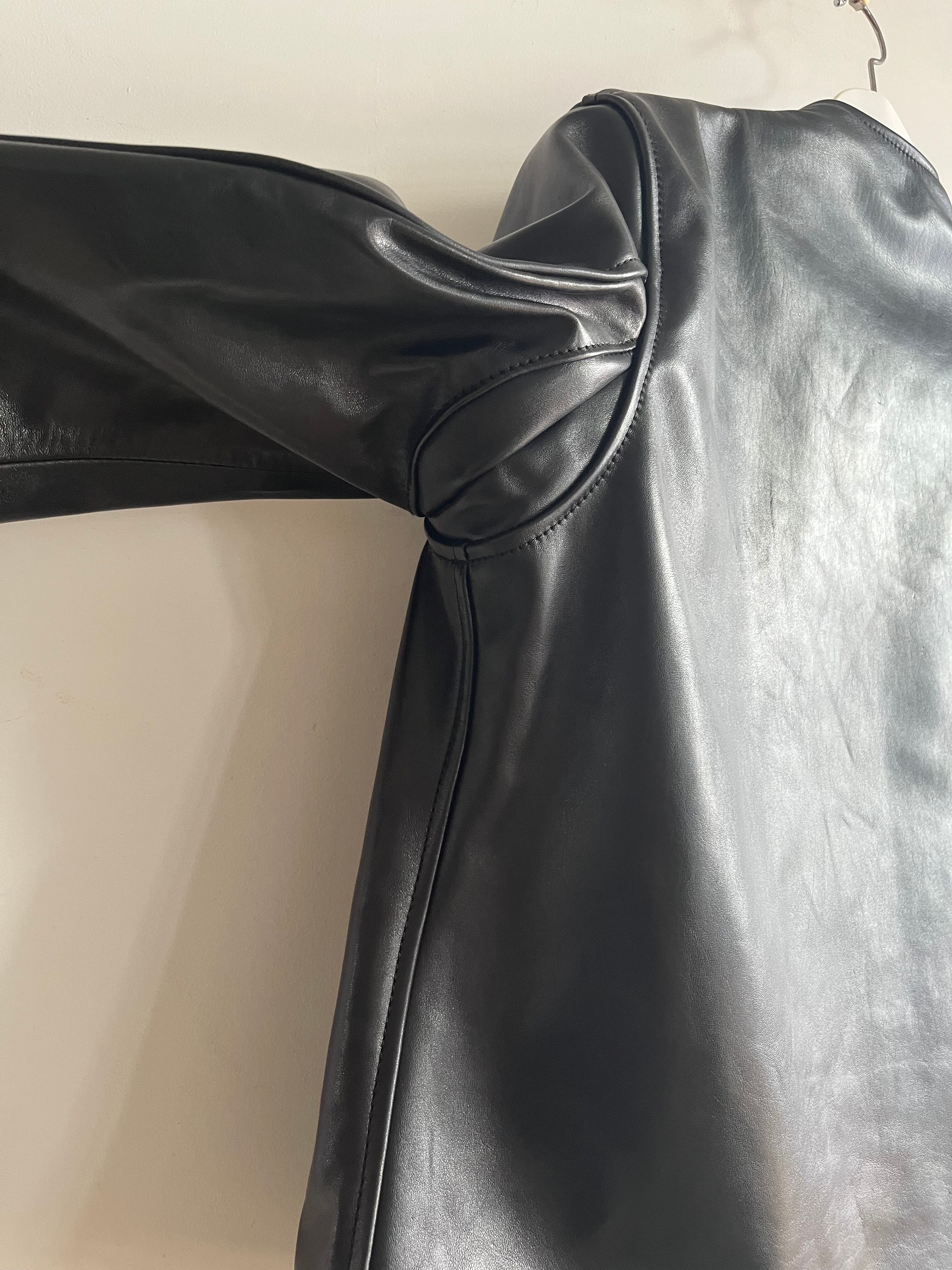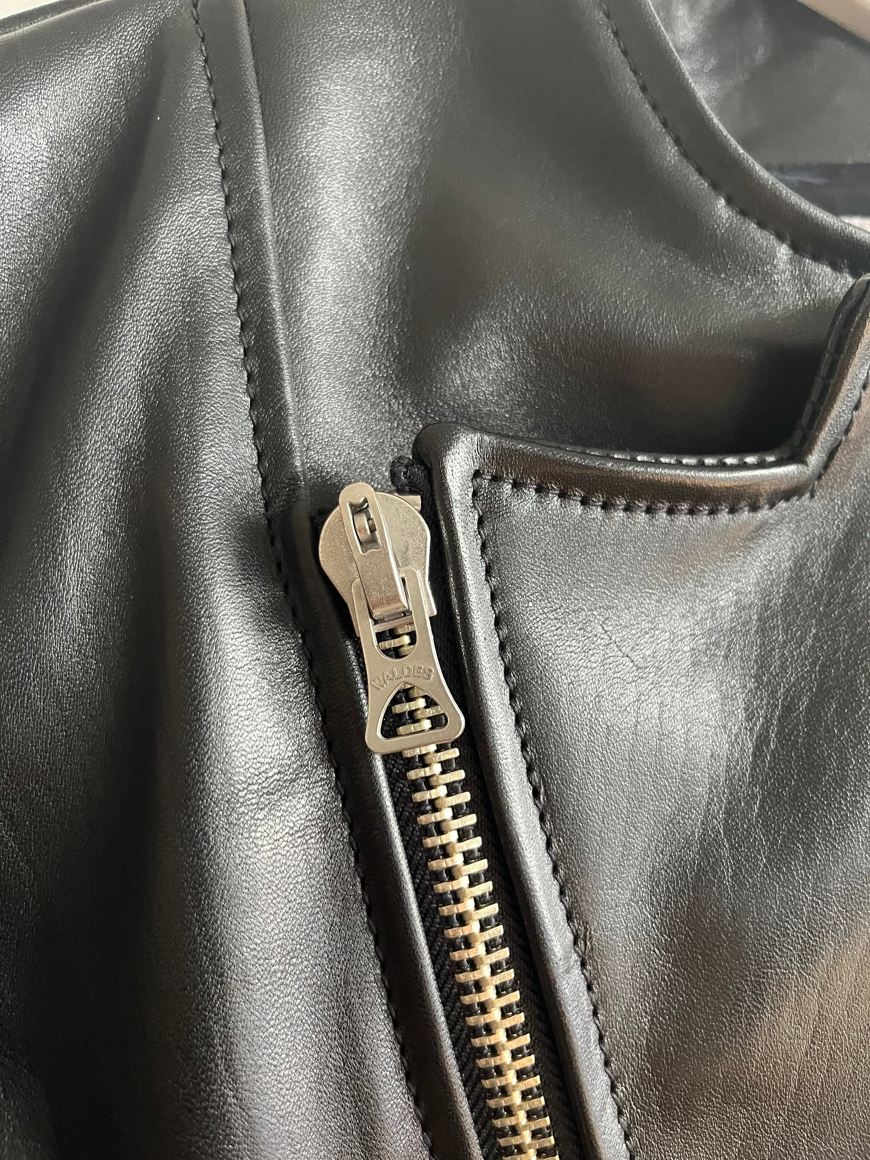 モチーフであるライダースジャケットをしっかりと感じるシルエットで丈は短めで袖は前に振った立体的な形状、全体的に縫い目を減らした無駄を削ぎ落としたデザインに特徴的な首元の形状が際立ちます。