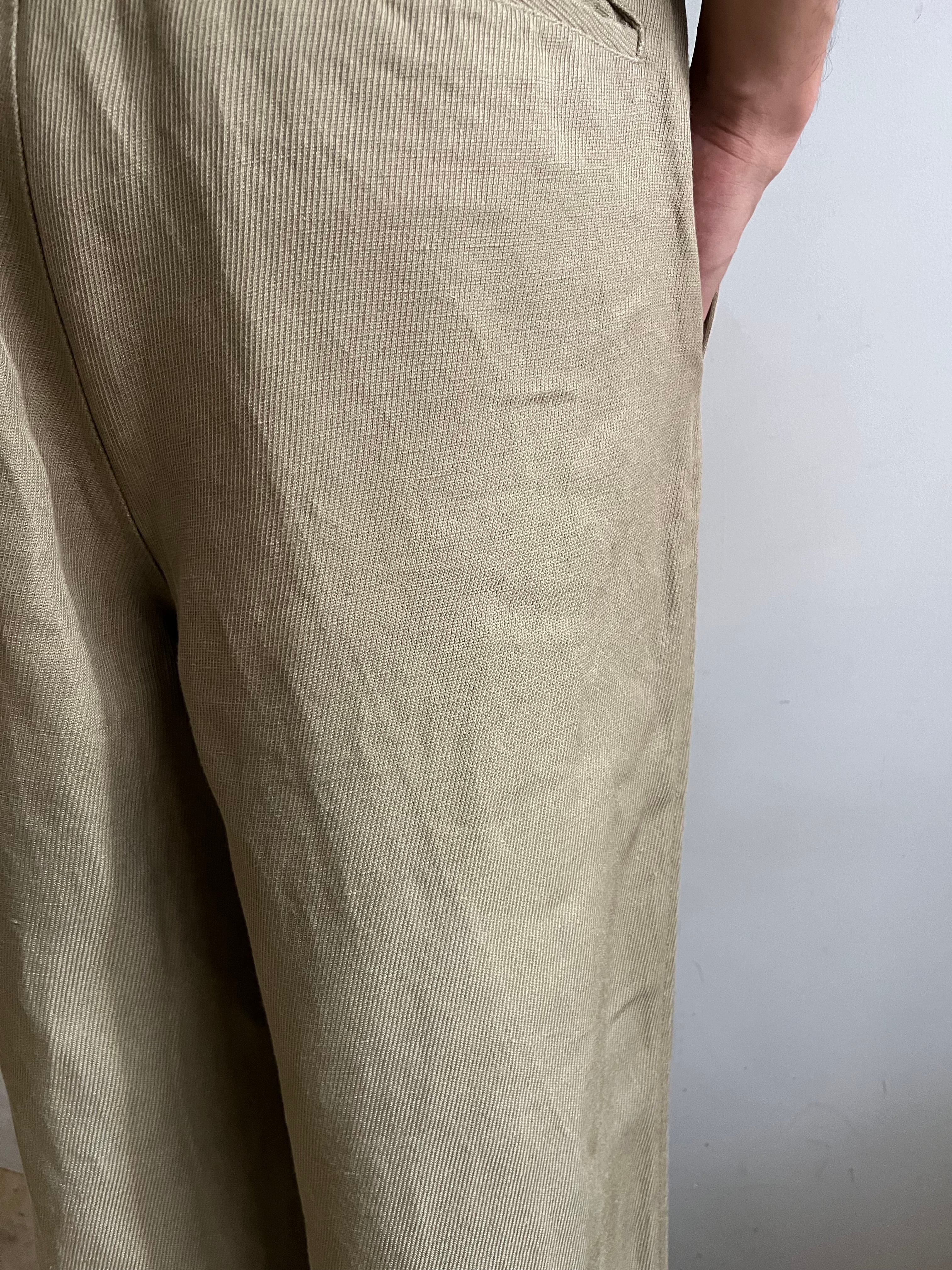 CANAPA(カナパ)とRAMIE(ラミー)と呼ばれる2種類の麻繊維の綾織生地を使用したリネンパンツ。カナパとラミーどちらも粗野な荒い繊維の印象ですが本パンツで使用された生地は細かなネップのみで非常に綺麗に織られており杉綾の織り目がきれいにでており、履き心地はリネン特有のドライな履き心地で涼しさを感じます。#3パンツはタックなしのワイド目なシルエット、ウエストゴムと紐で調節するイージーパンツ仕様にベルト通しが付きます。