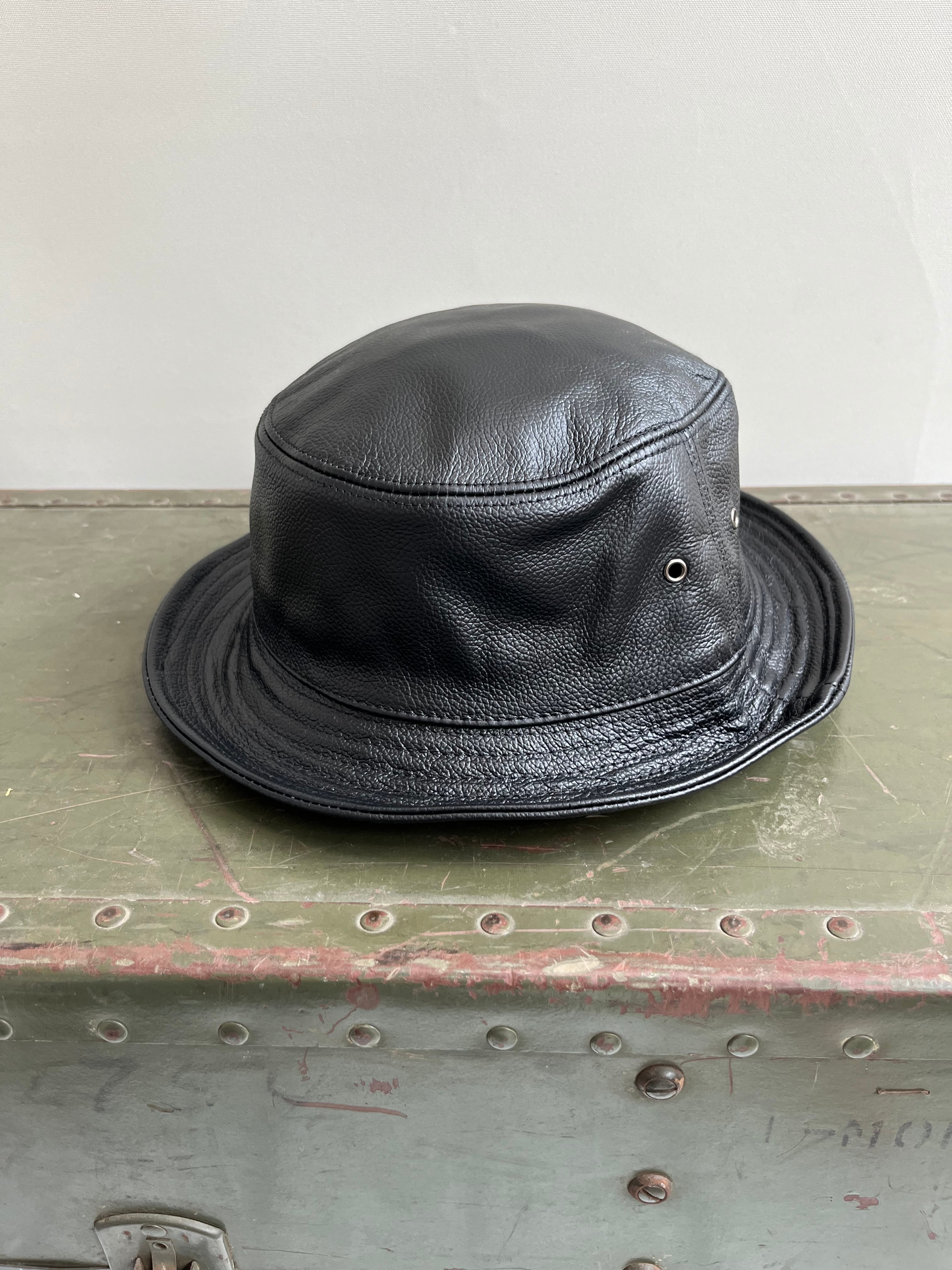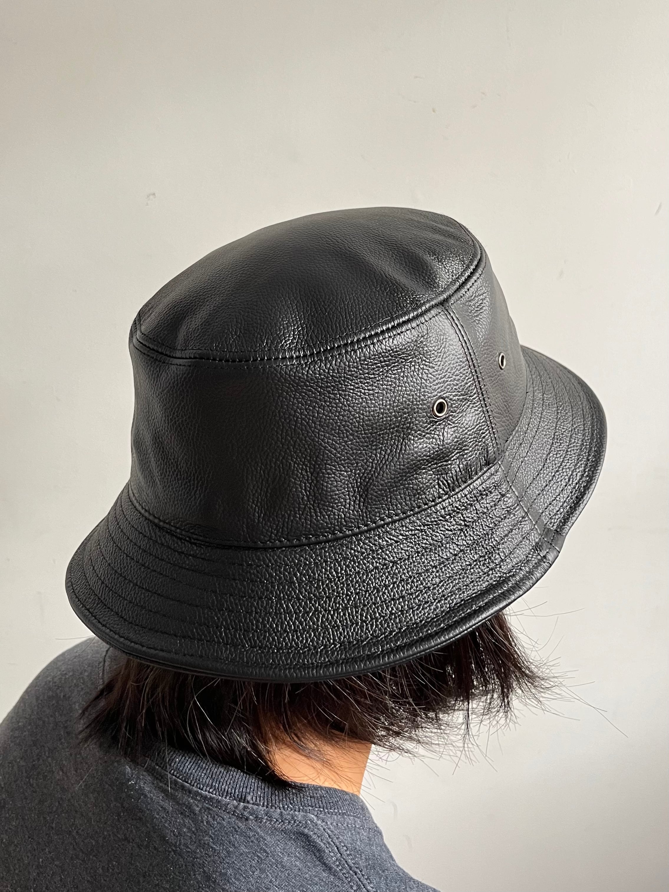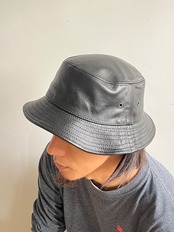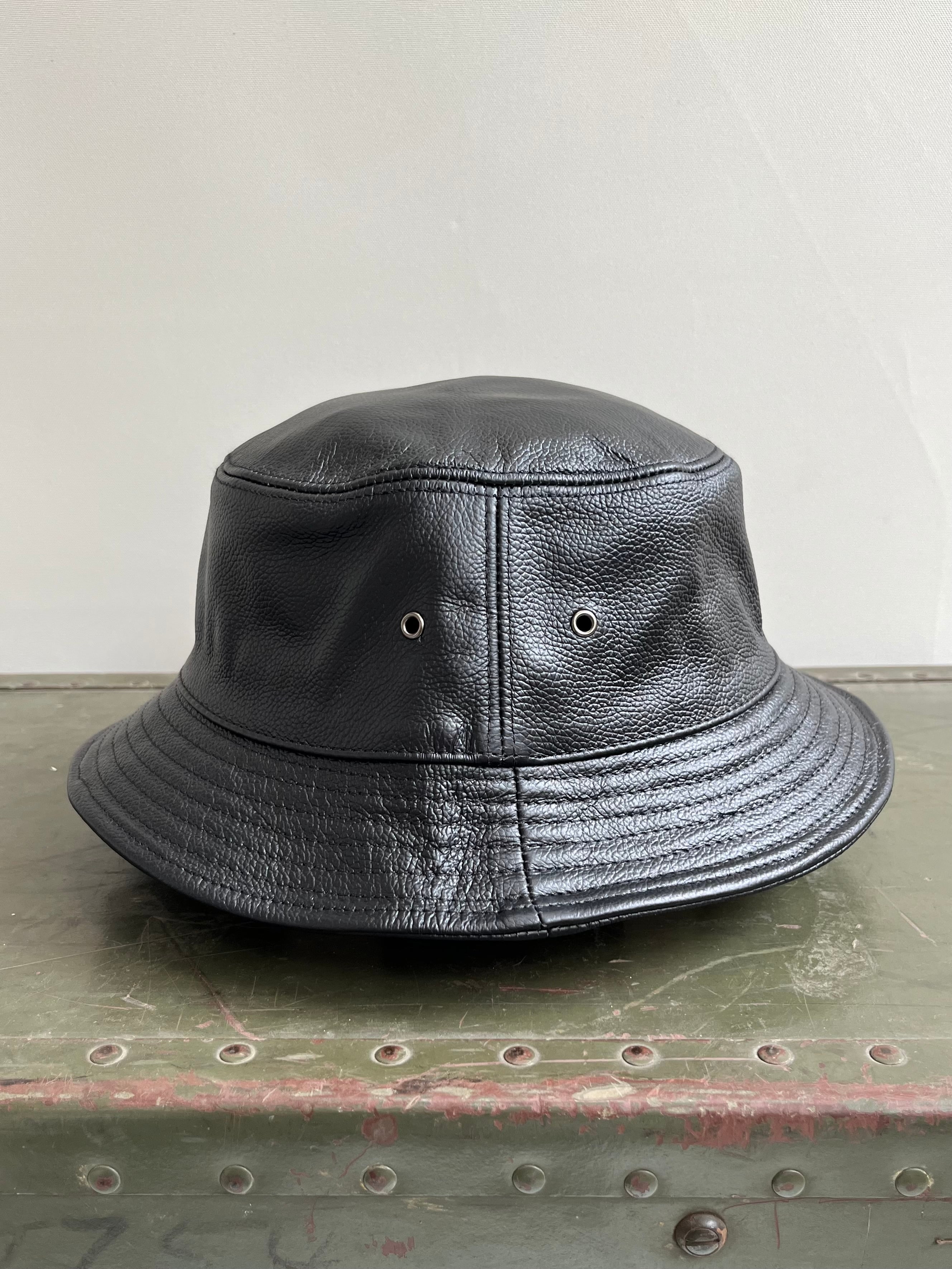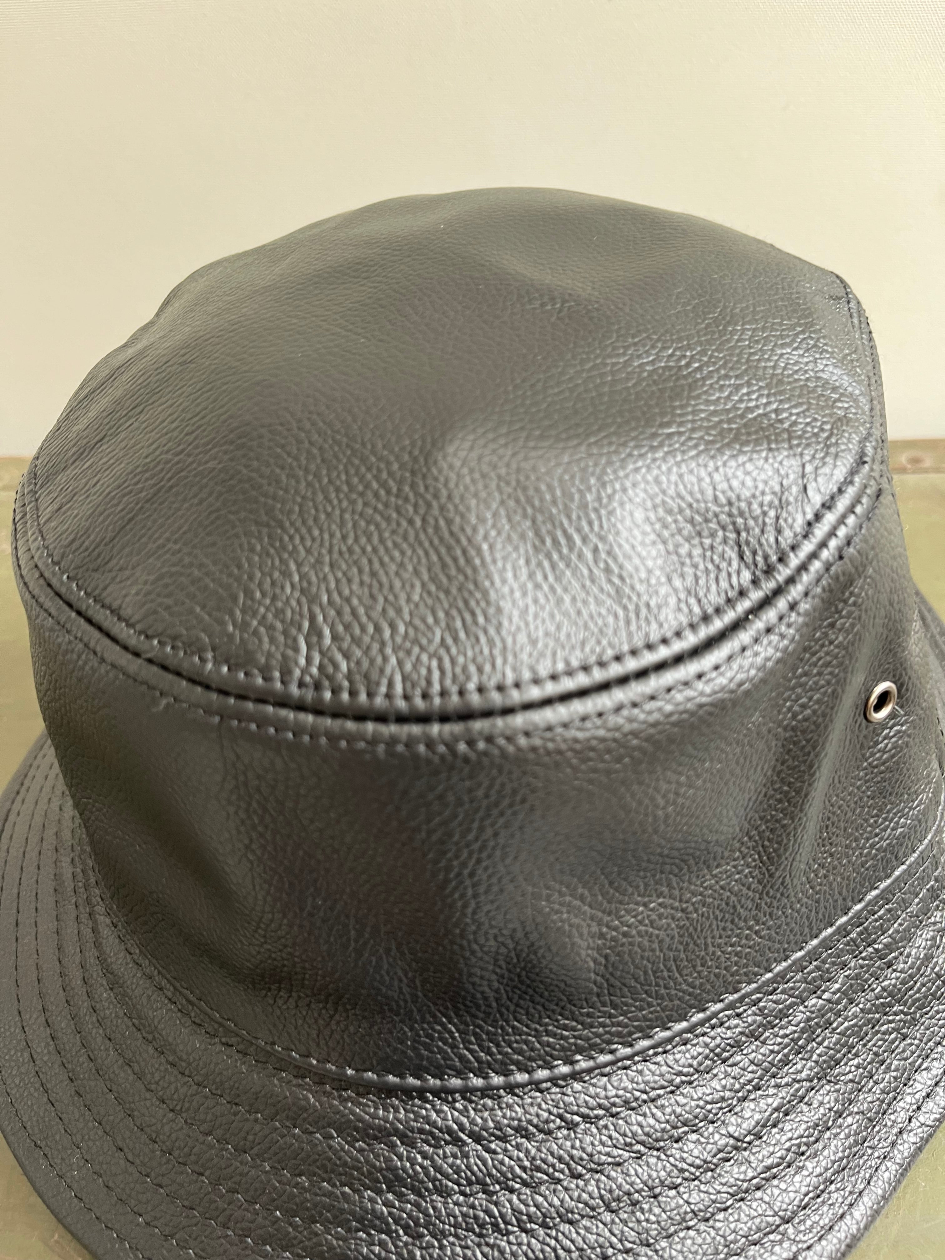 牛革を使用したレザーバケットハット。シボ(表面の凹凸)がしっかりと出ている革を使用、革特有の鈍く光る表面に高級感を感じる一品。形はカジュアル寄りなバケットハットで被りやすい印象です。