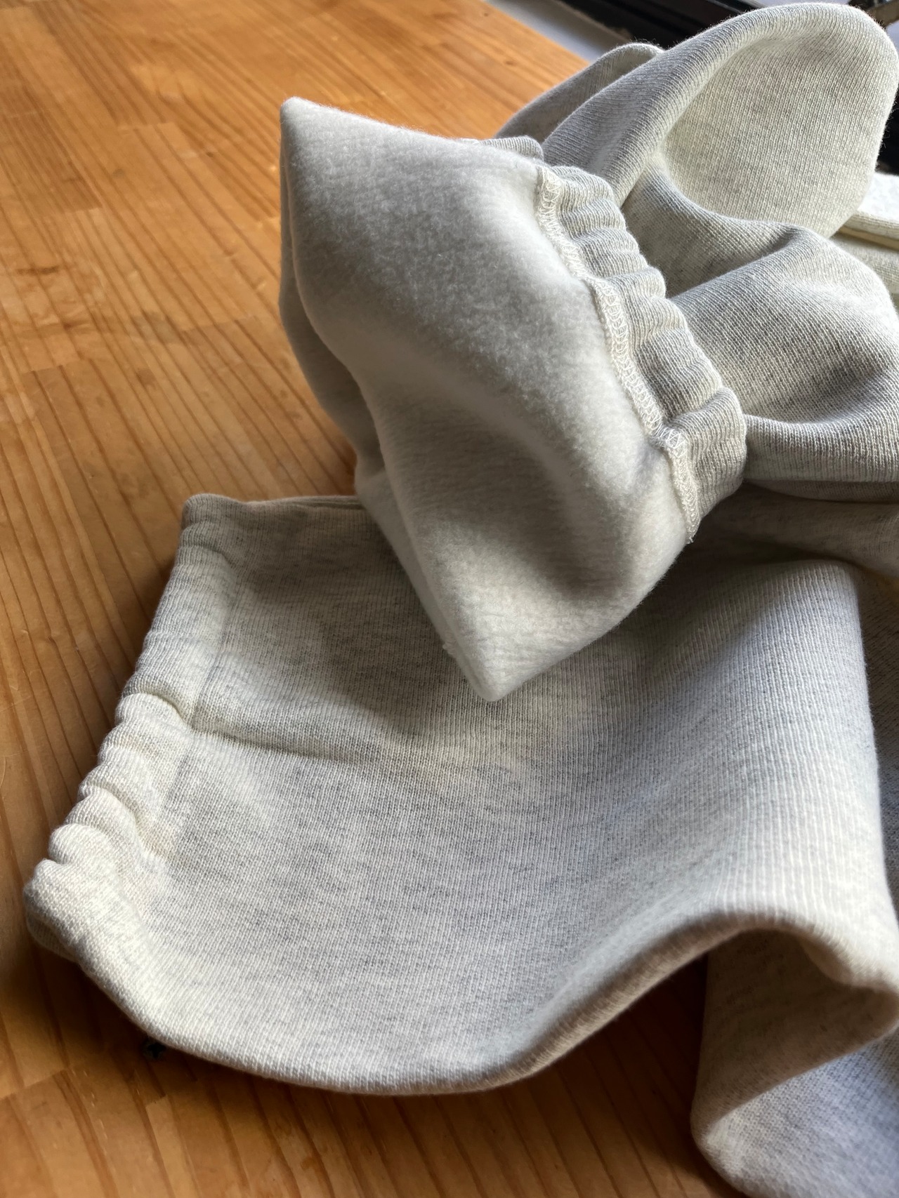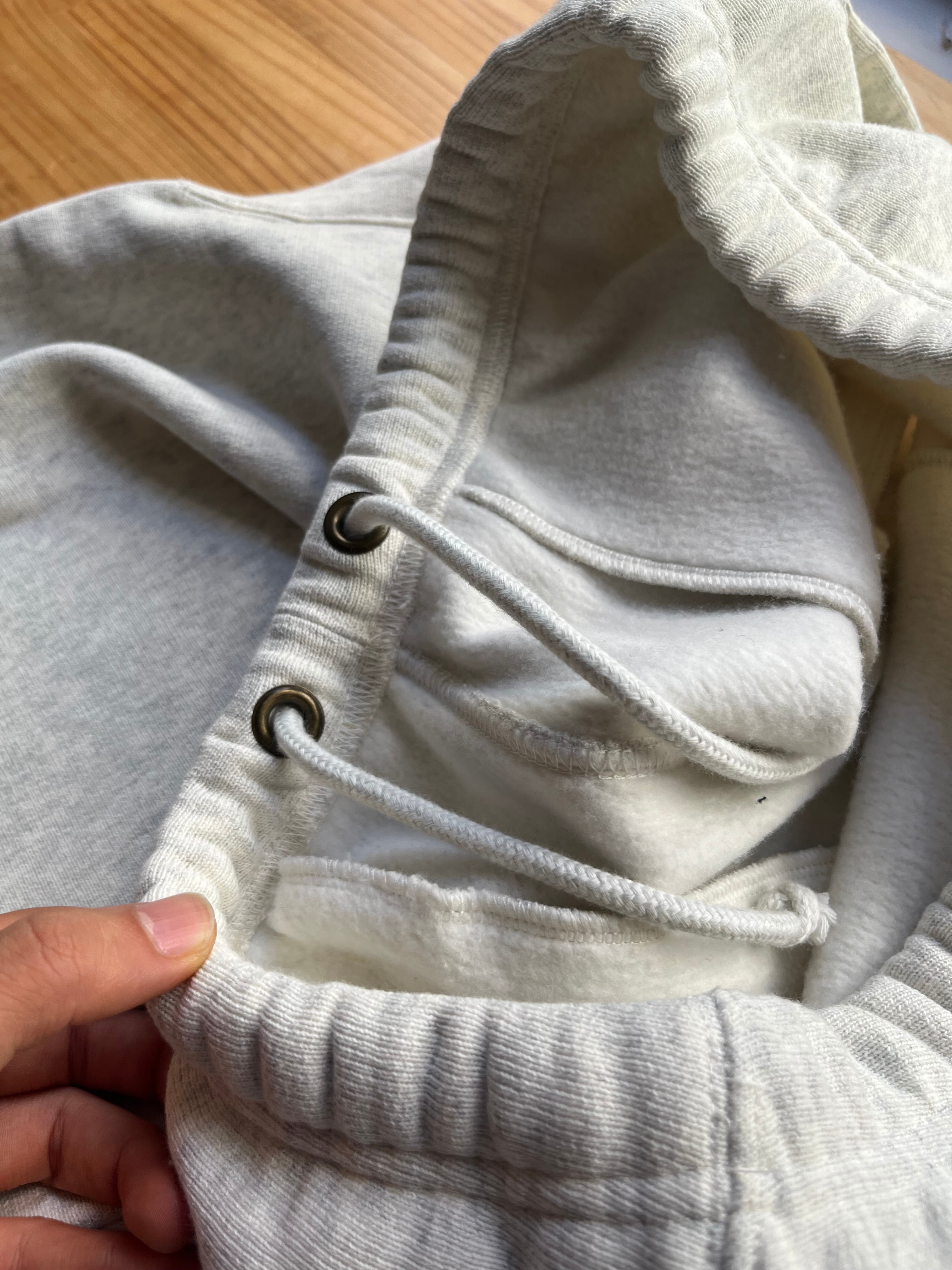 リバースウィーブ製法とは、通常タテ方向に縮むスウェット生地を90度方向を換えて裁断することで丈の縮みを軽減し、両脇にリブを配置することで横縮みにも対応。肉厚なスウェット生地のデメリットである縮みを解消する1938年から続く伝統的な製法。