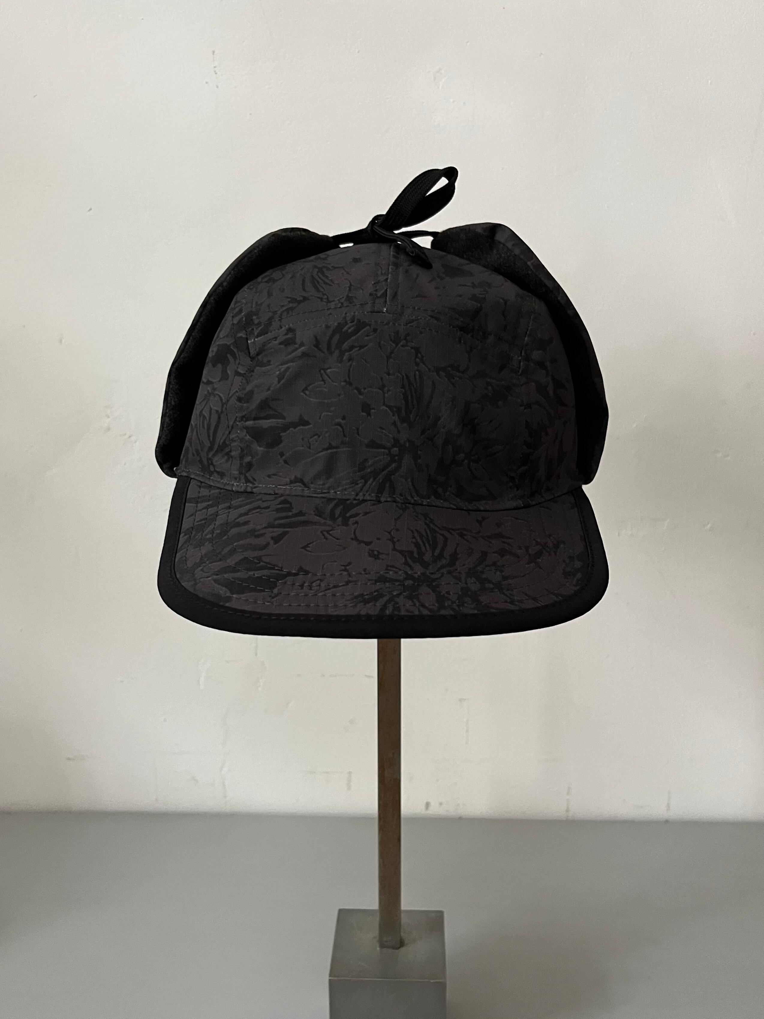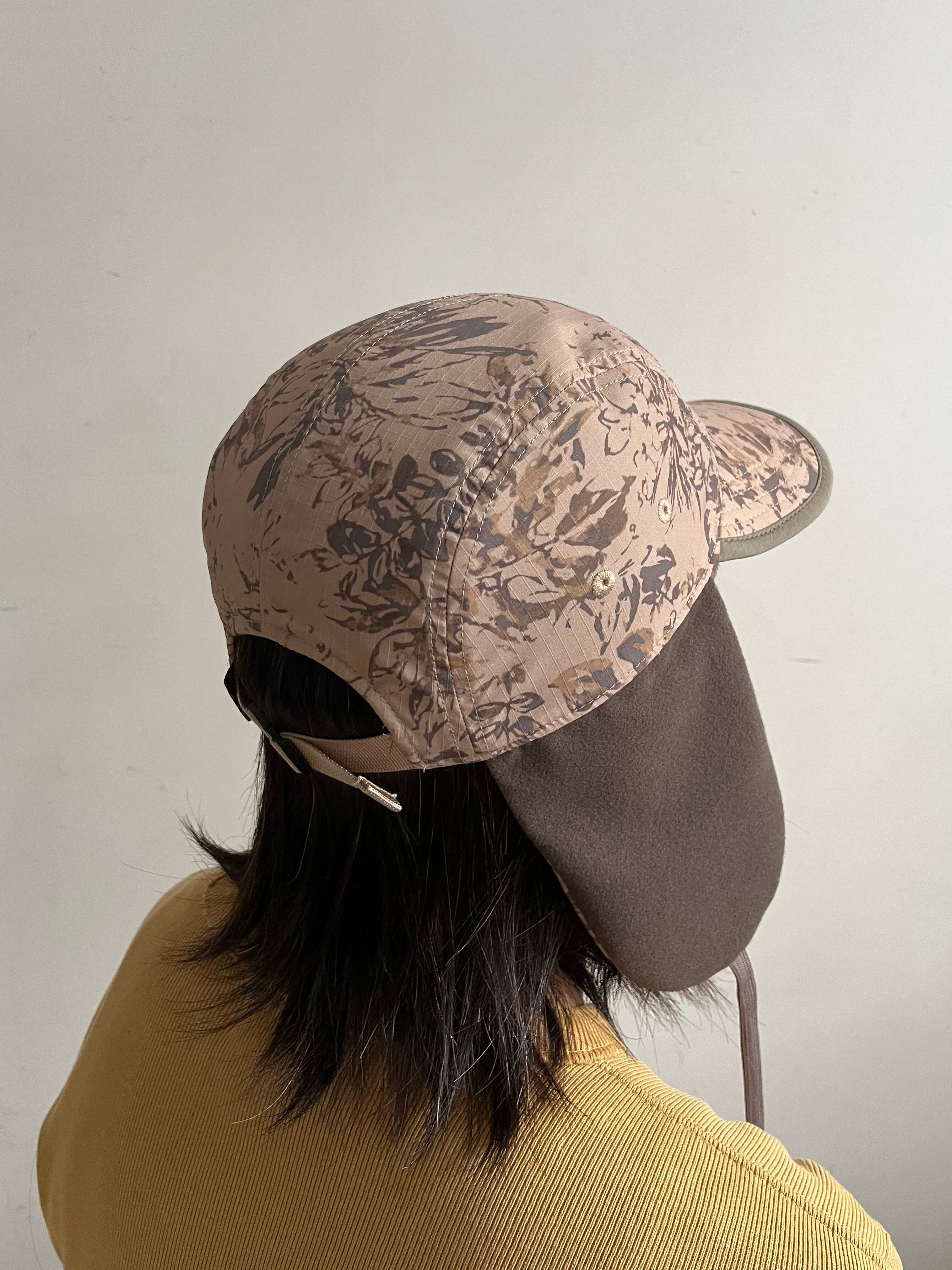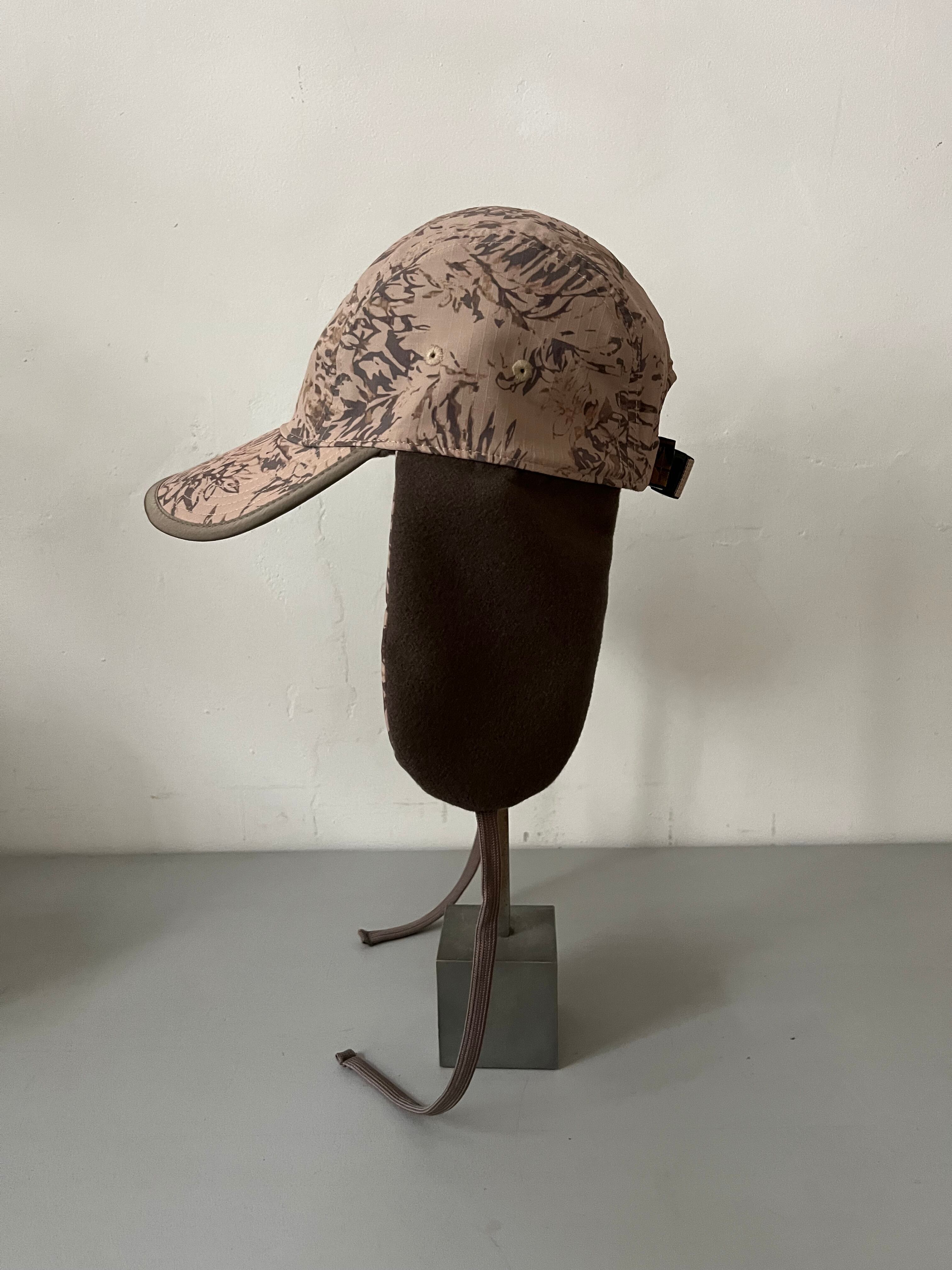 ボタニカル柄とフリース面をリバーシブルで着用できる耳当て付きジェットキャップです。