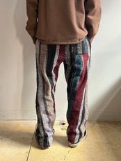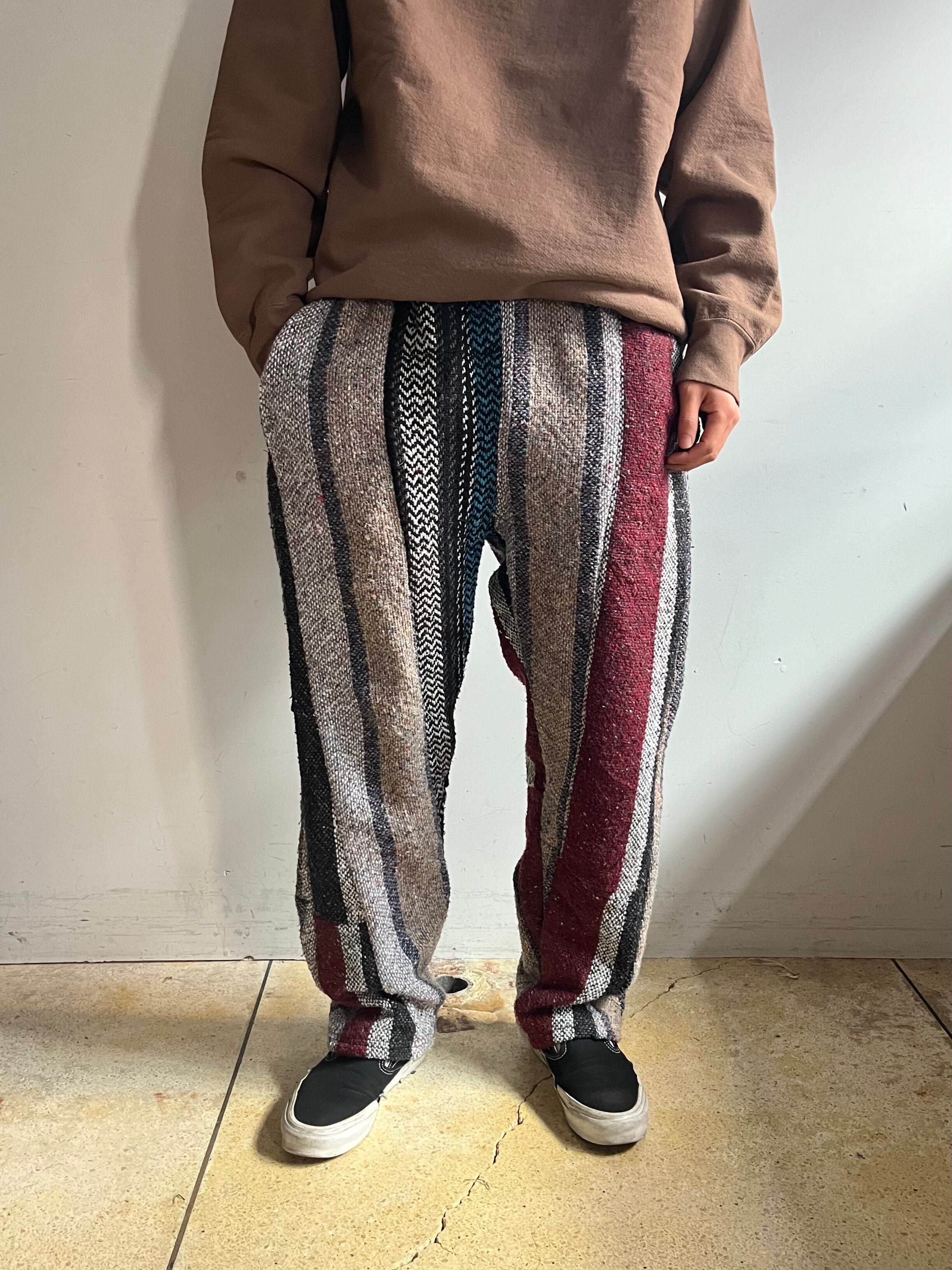メキシカンラグ、パーカーなどを解体→パッチワークを活かしたイージーパンツに仕上げたリメイクパンツ。それぞれ2~3種の生地が使用されており、色の効いた派手めな物や配色に統一感のある物などなど一点毎に表情が異なります。メキシカンラグ特有のボーダー柄が効果的に配置されていてストライプ柄の様な縦模様が雰囲気の良い仕上がりです。
