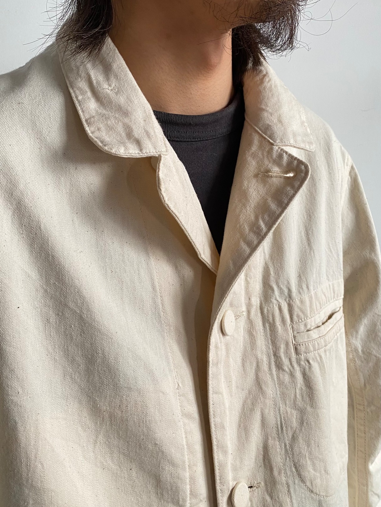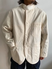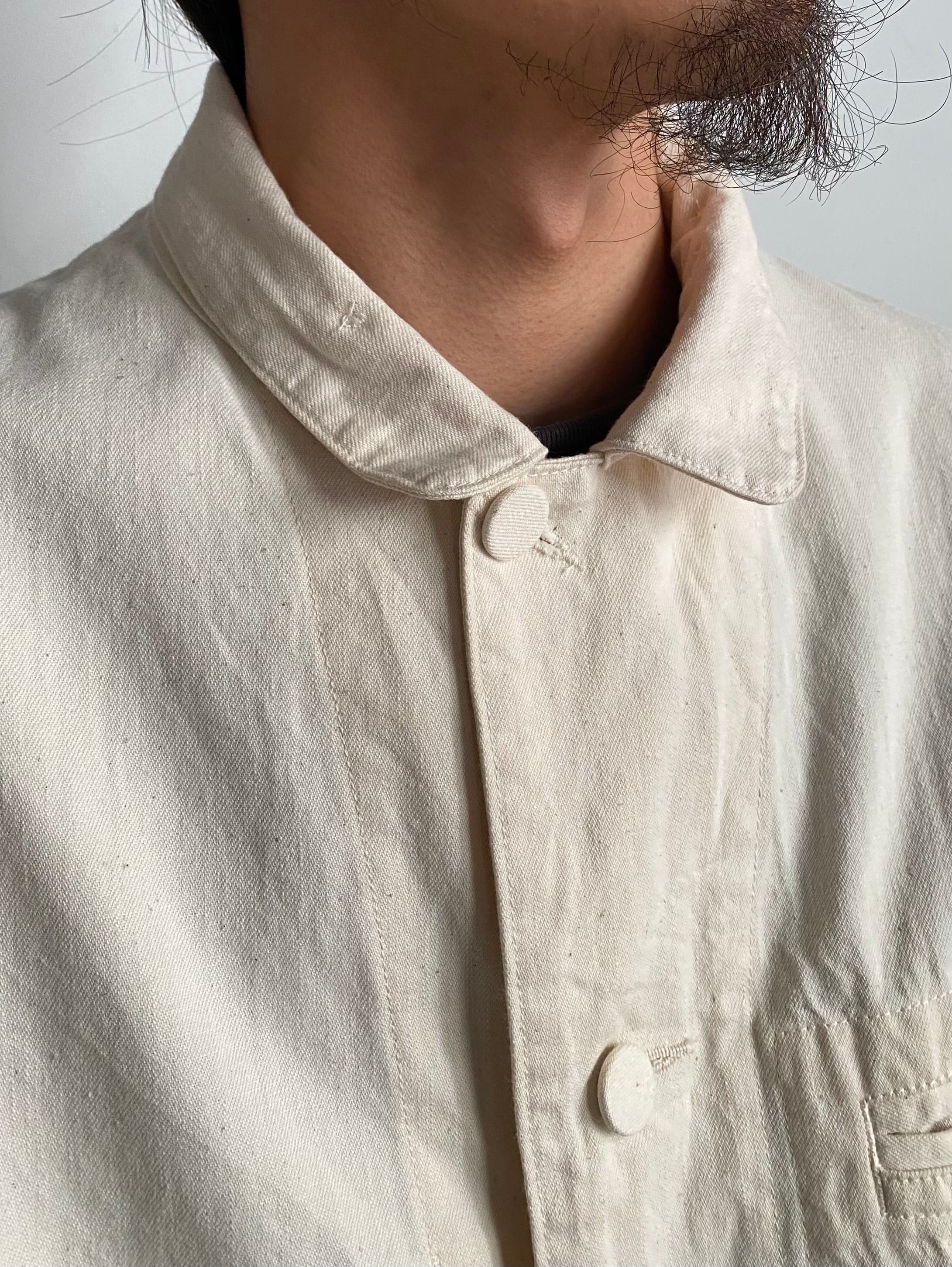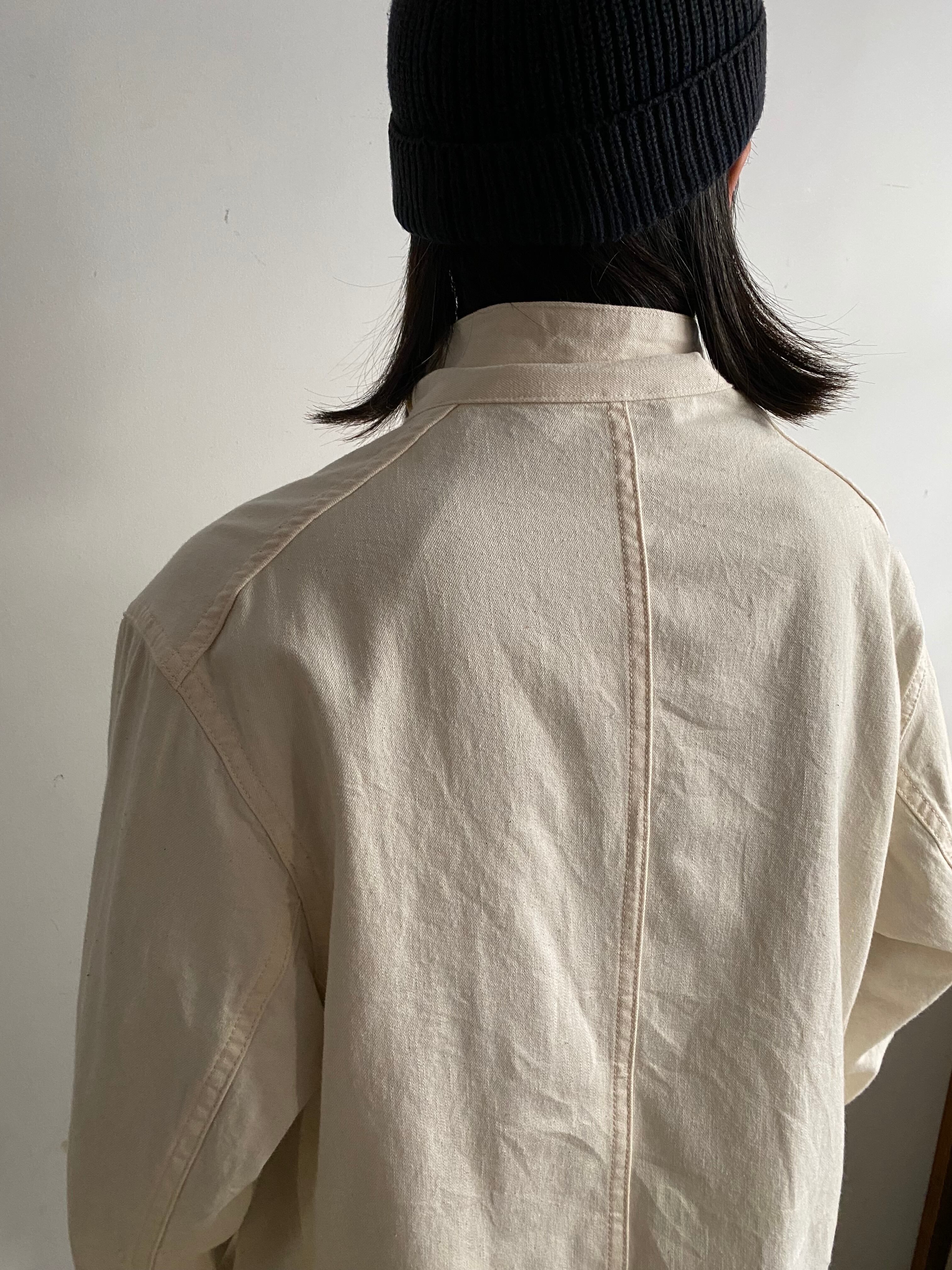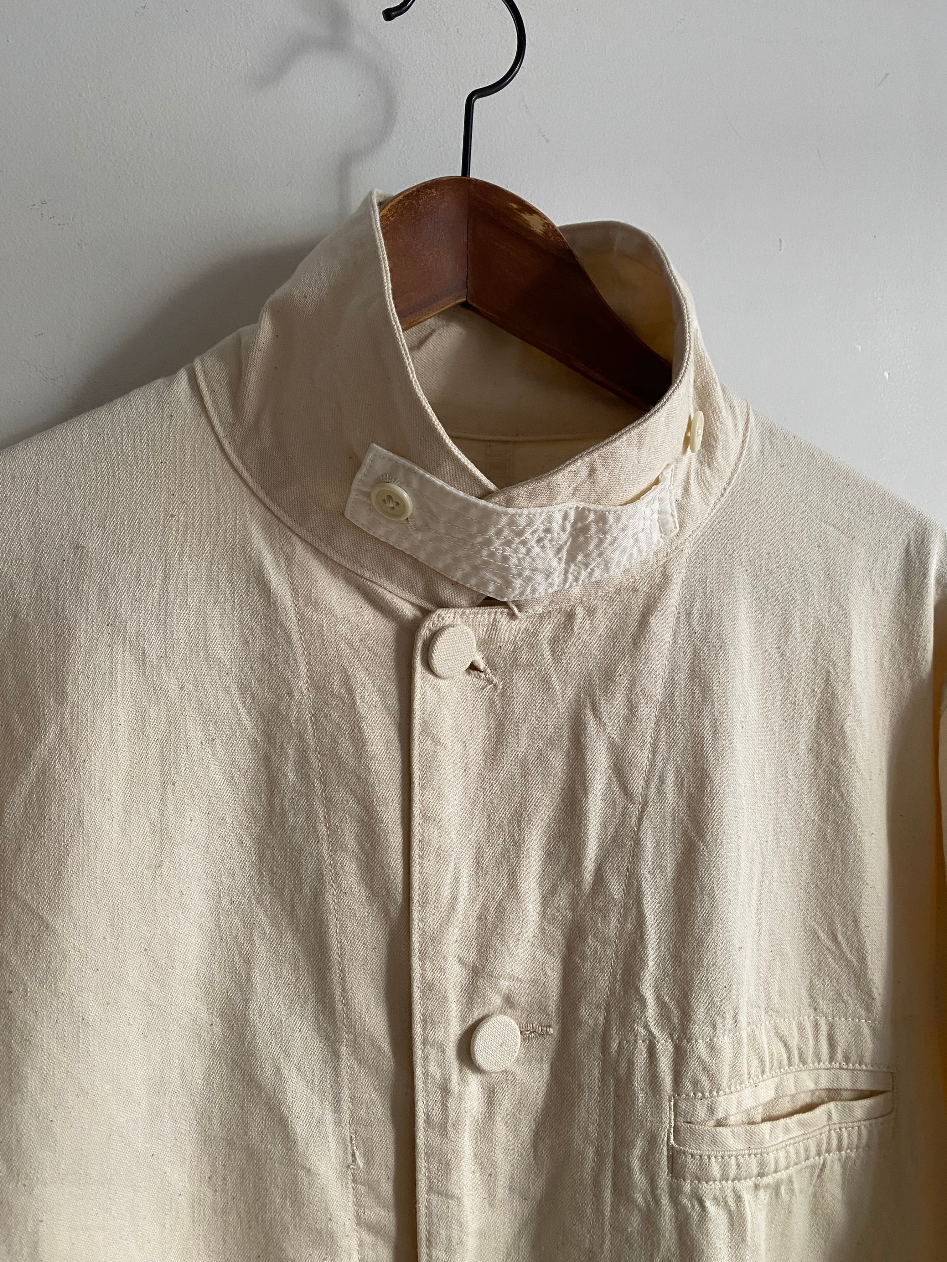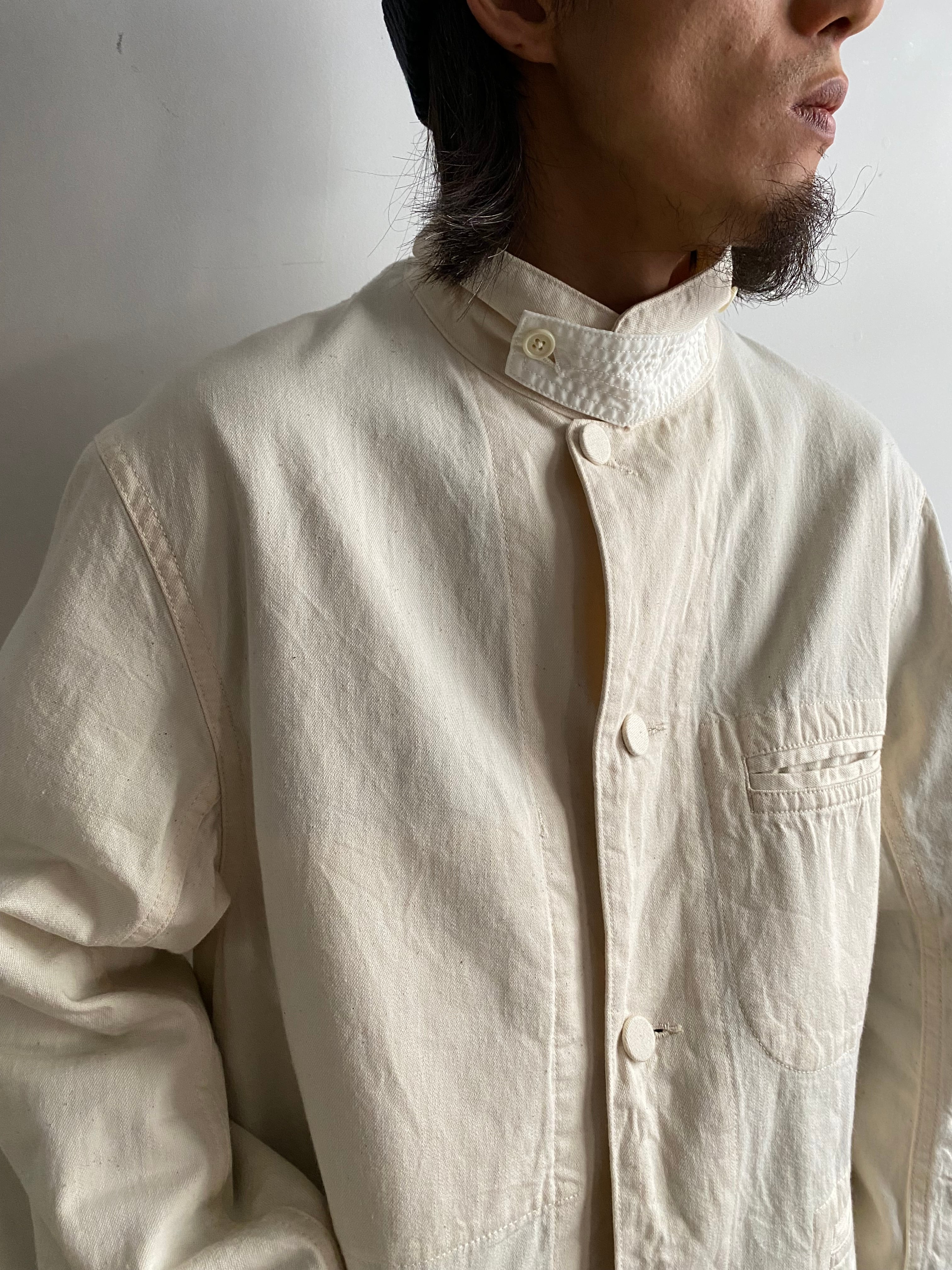 ラペル調での着用はもちろん、上までボタンを閉めてフレンチワークっぽく、さらに一段階閉めてスタンドカラーに。