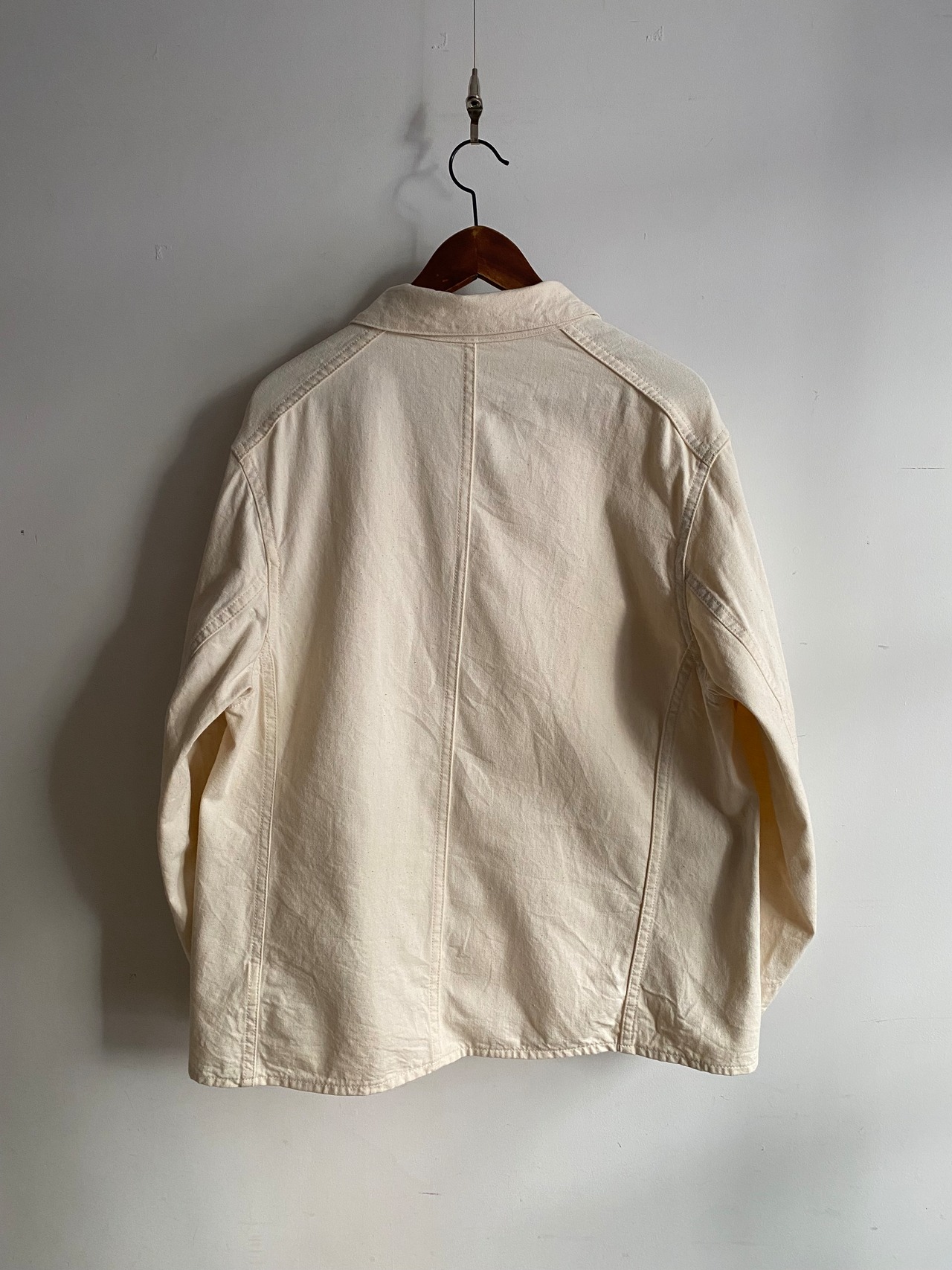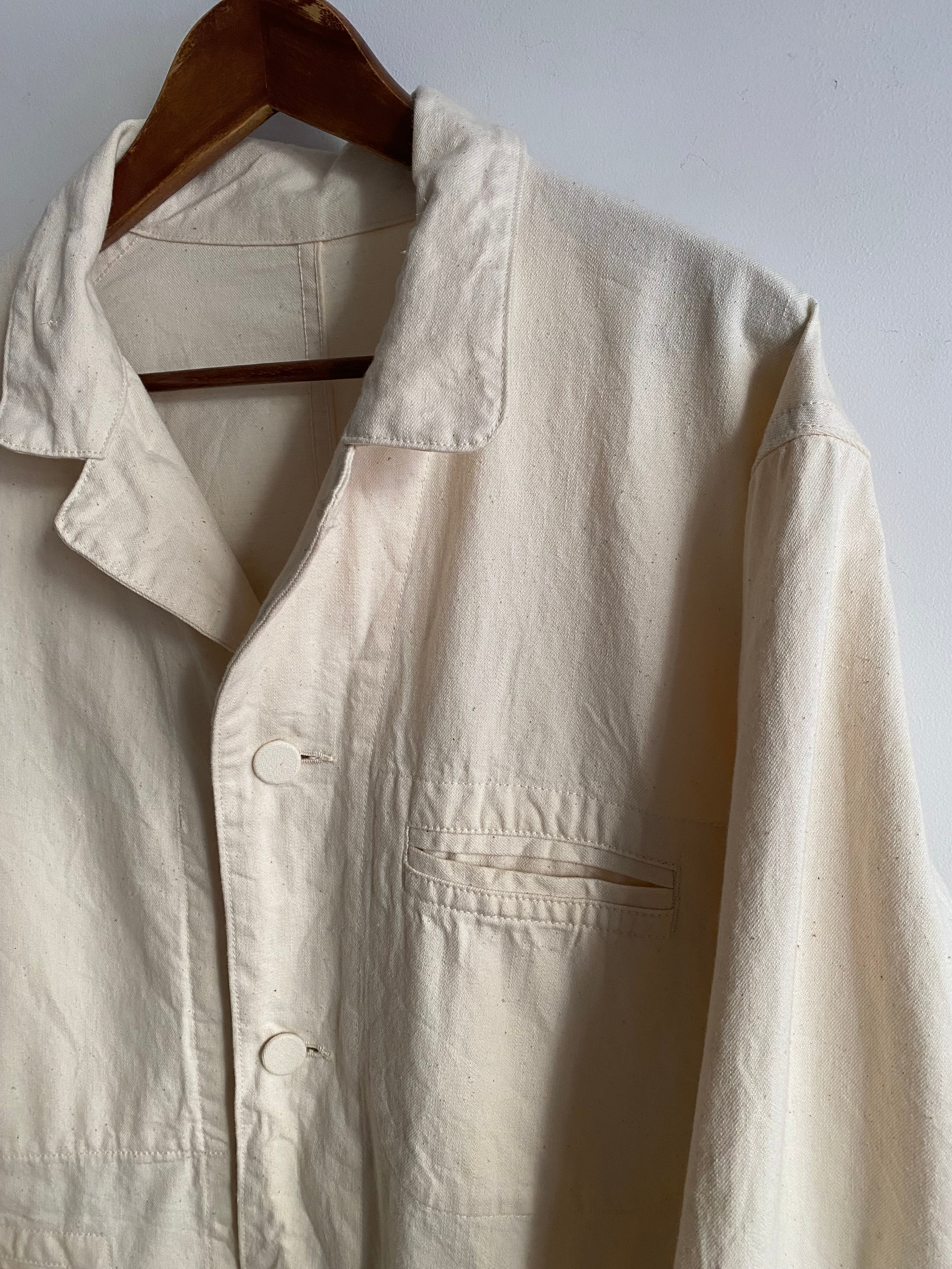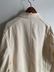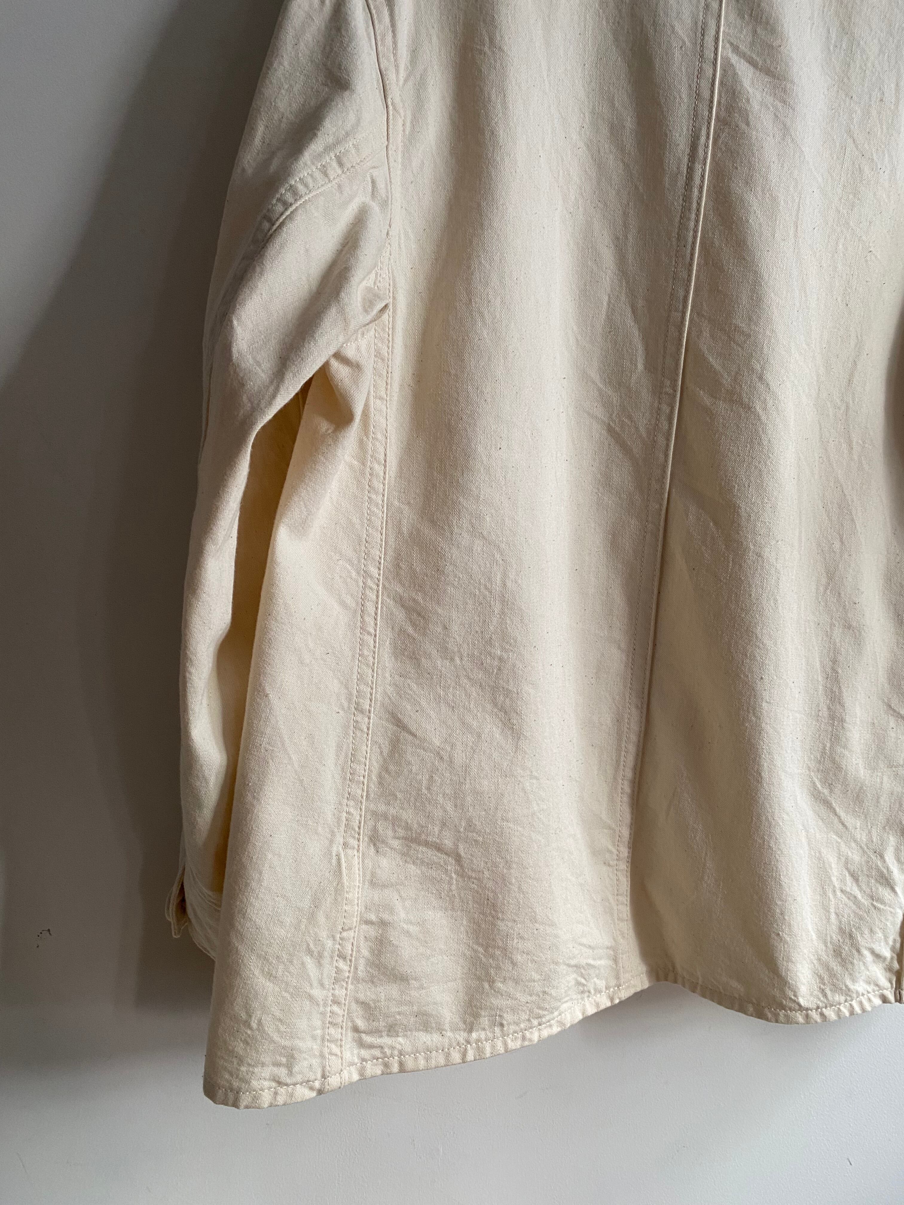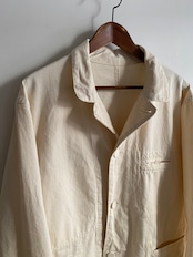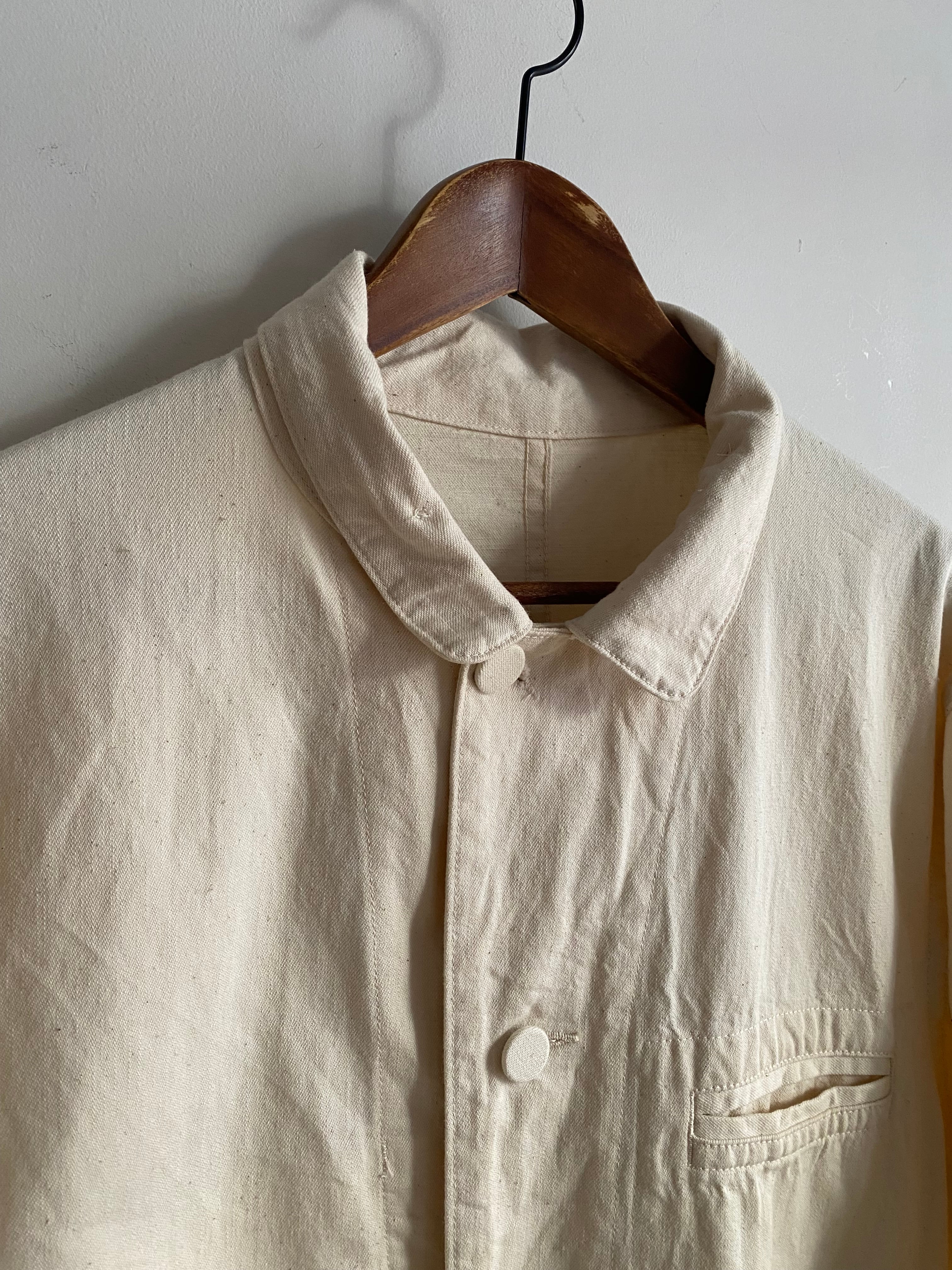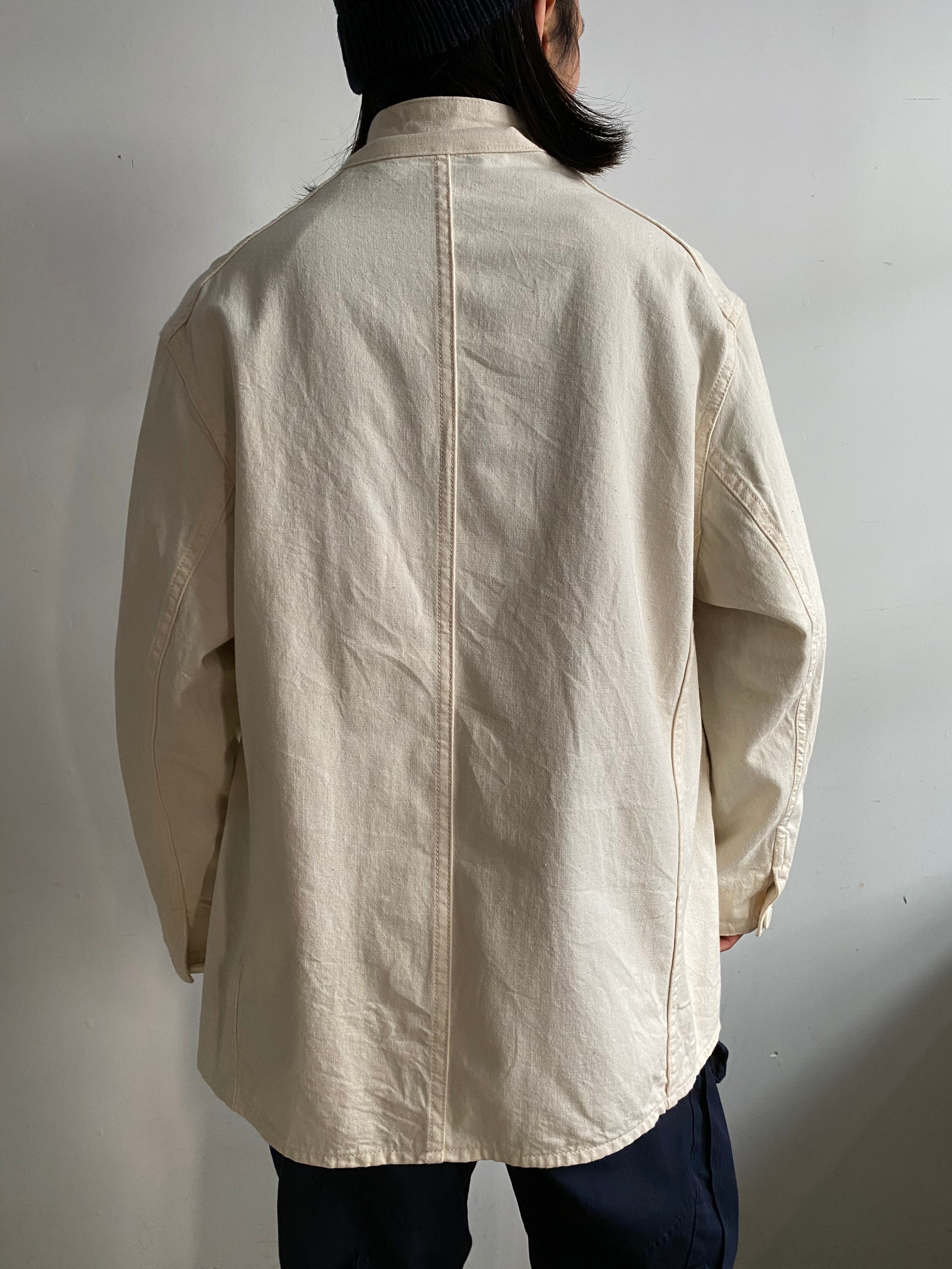 ラペル調での着用はもちろん、上までボタンを閉めてフレンチワークっぽく、さらに一段階閉めてスタンドカラーに。
