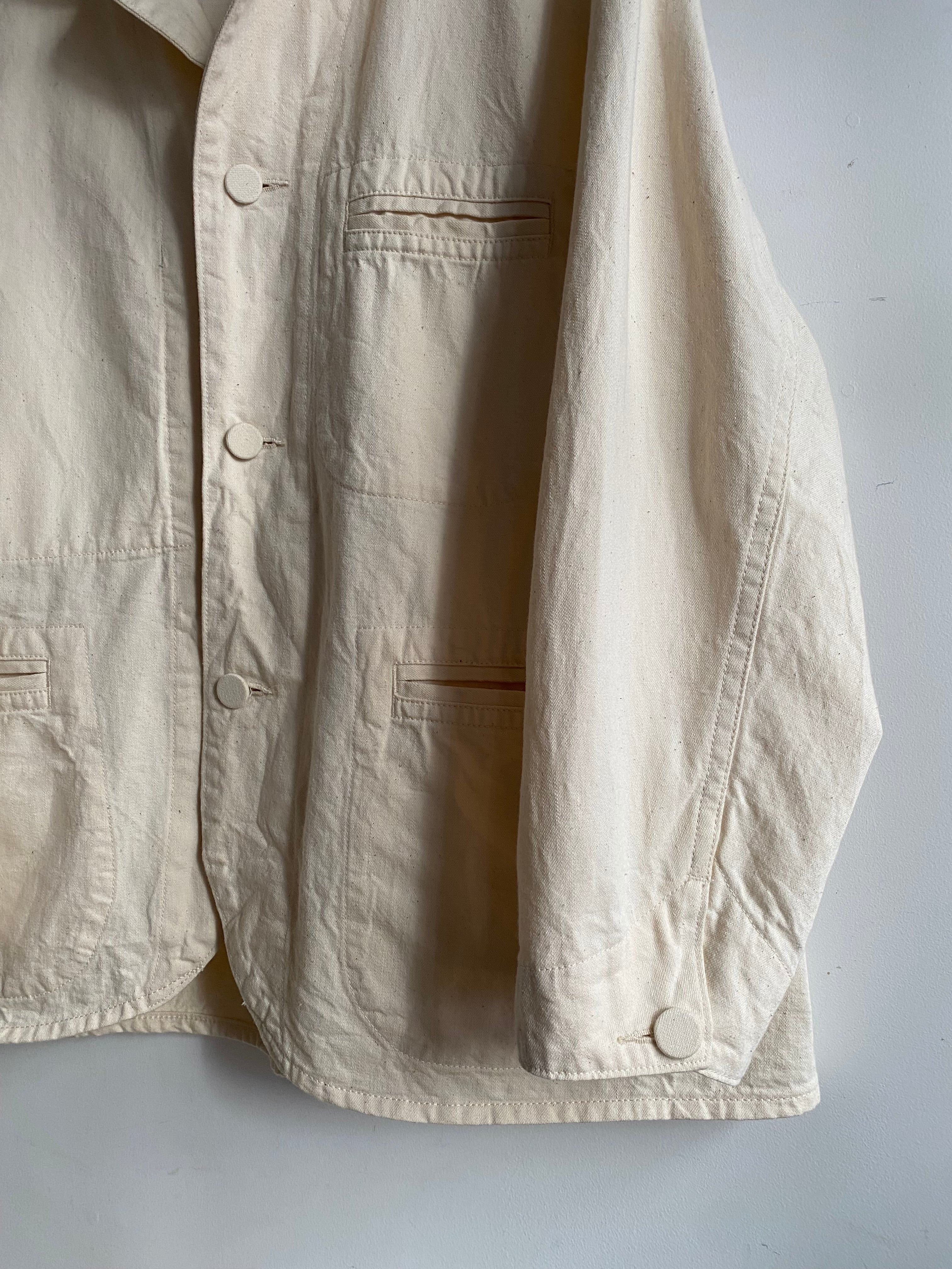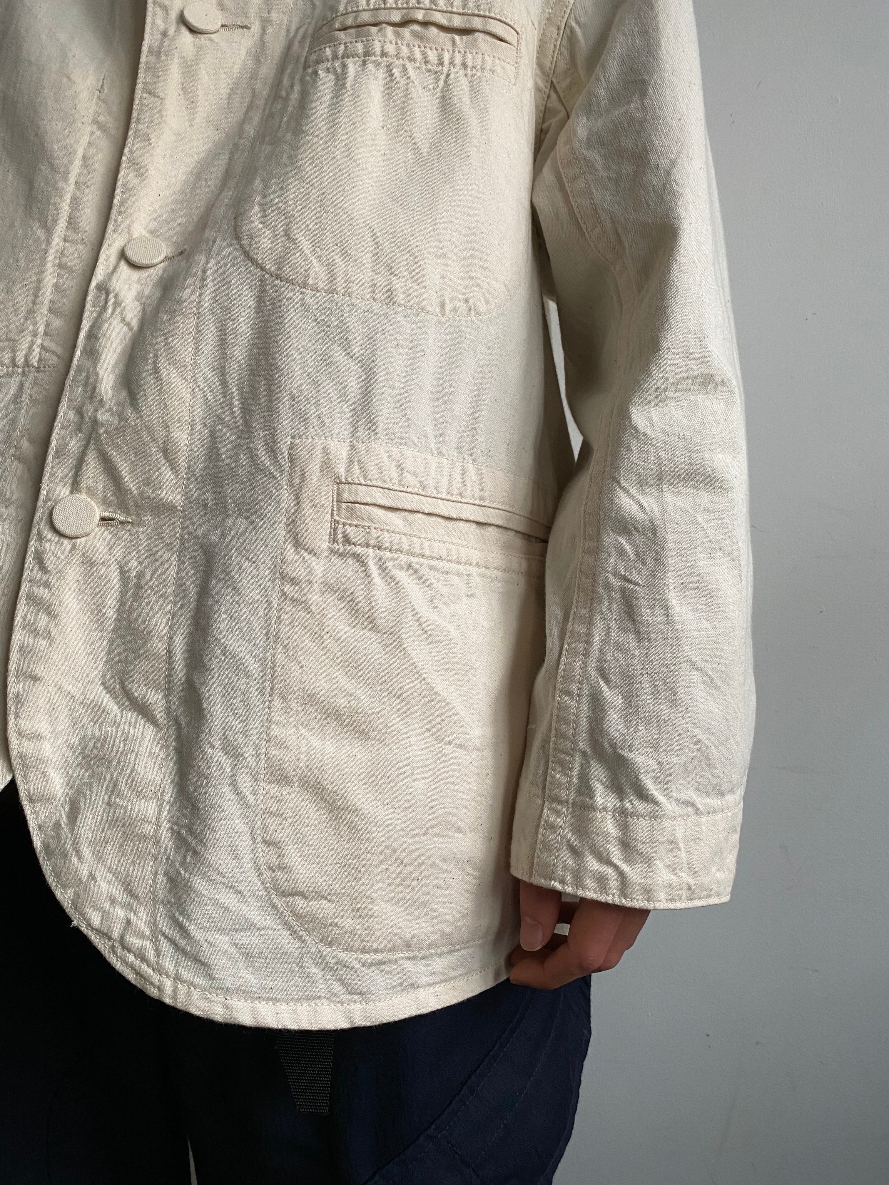 身頃は平面的に袖は立体的に、襟は左右不対称に作られており、よく見るとチグハグな遊びの効いたパターンが特徴的なジャケット。