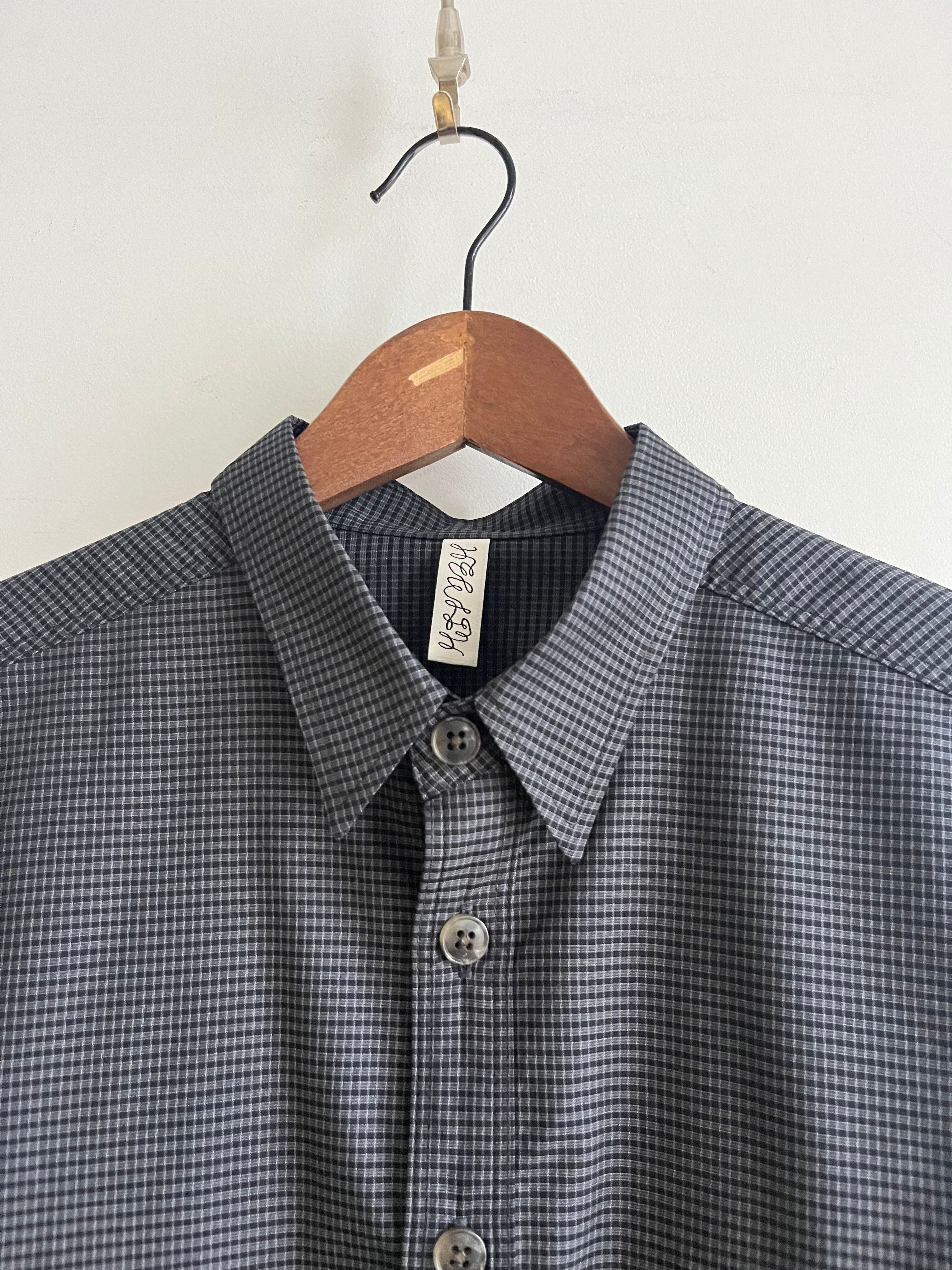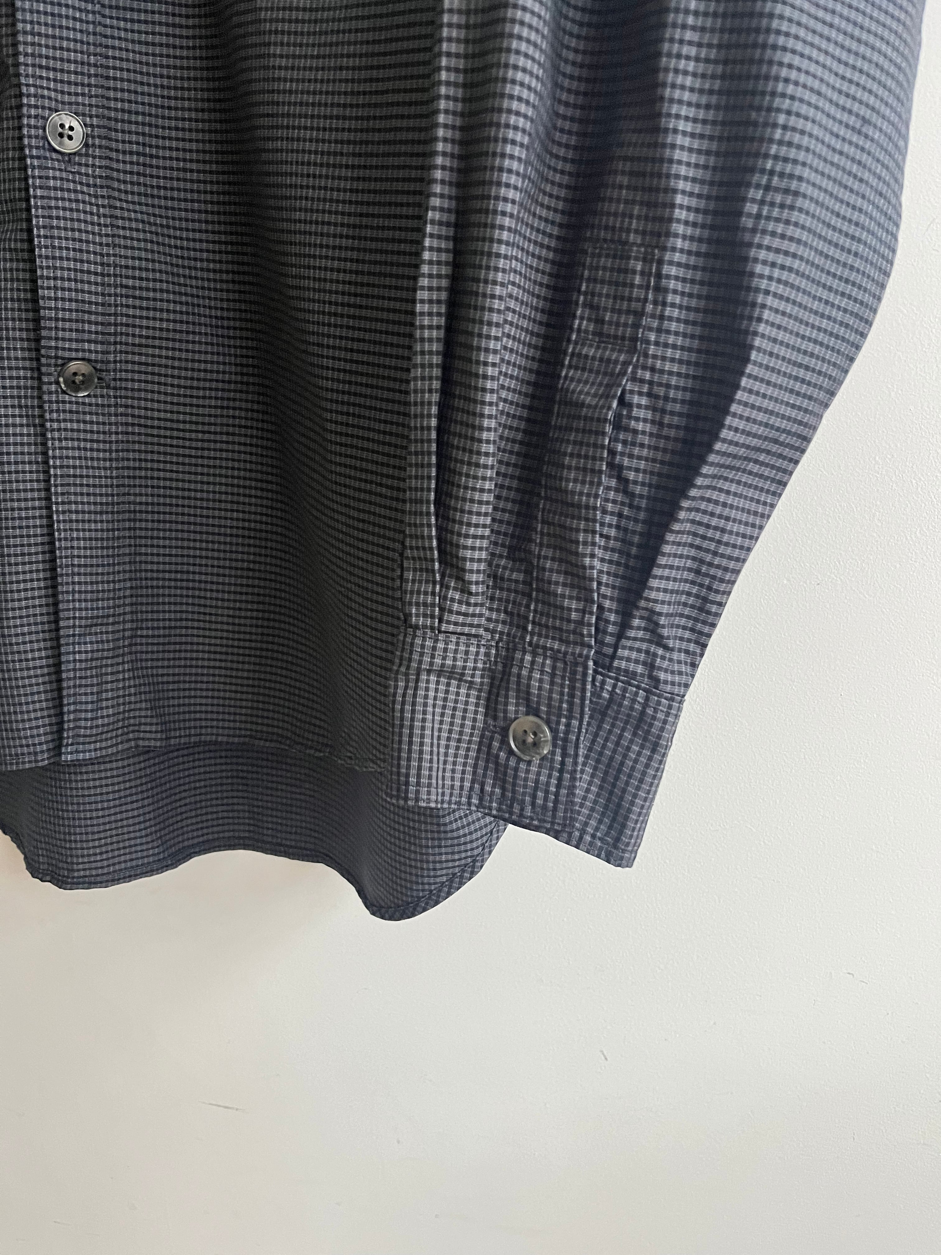 播州織りのデッドストック生地を使用した長袖シャツ。山奥の倉庫に眠っていた80~90年代に織られた反物で恐らくアメリカ向けに製造された物とのこと。細かめのチェックの様な柄で素材は綿100%、肌触りの良いドライタッチな素材感です。